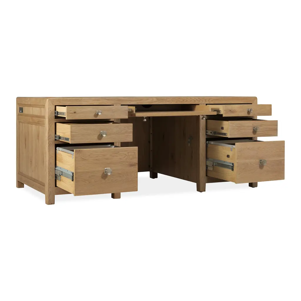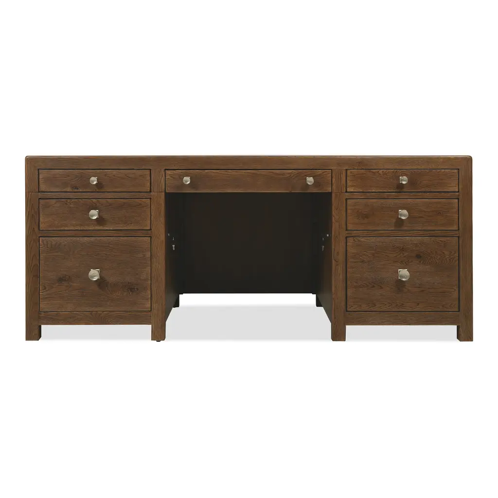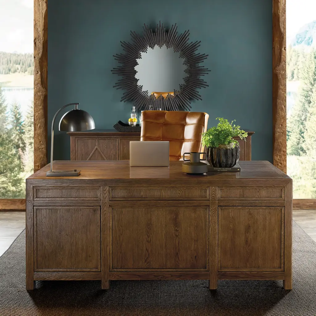 A commanding centerpiece for the executive home office, the Driftwood Desk from Hooker Furniture blends rustic character with professional performance. Its distressed, sun-faded finish highlights the wood's natural knots and texture. This desk is a true workstation, featuring seven drawers, a drop-front keyboard tray, and integrated wire management for seamless organization. With locking file drawers and discreet storage on the visitor's side, it’s designed for those who value both heritage style and modern function. Highlights: