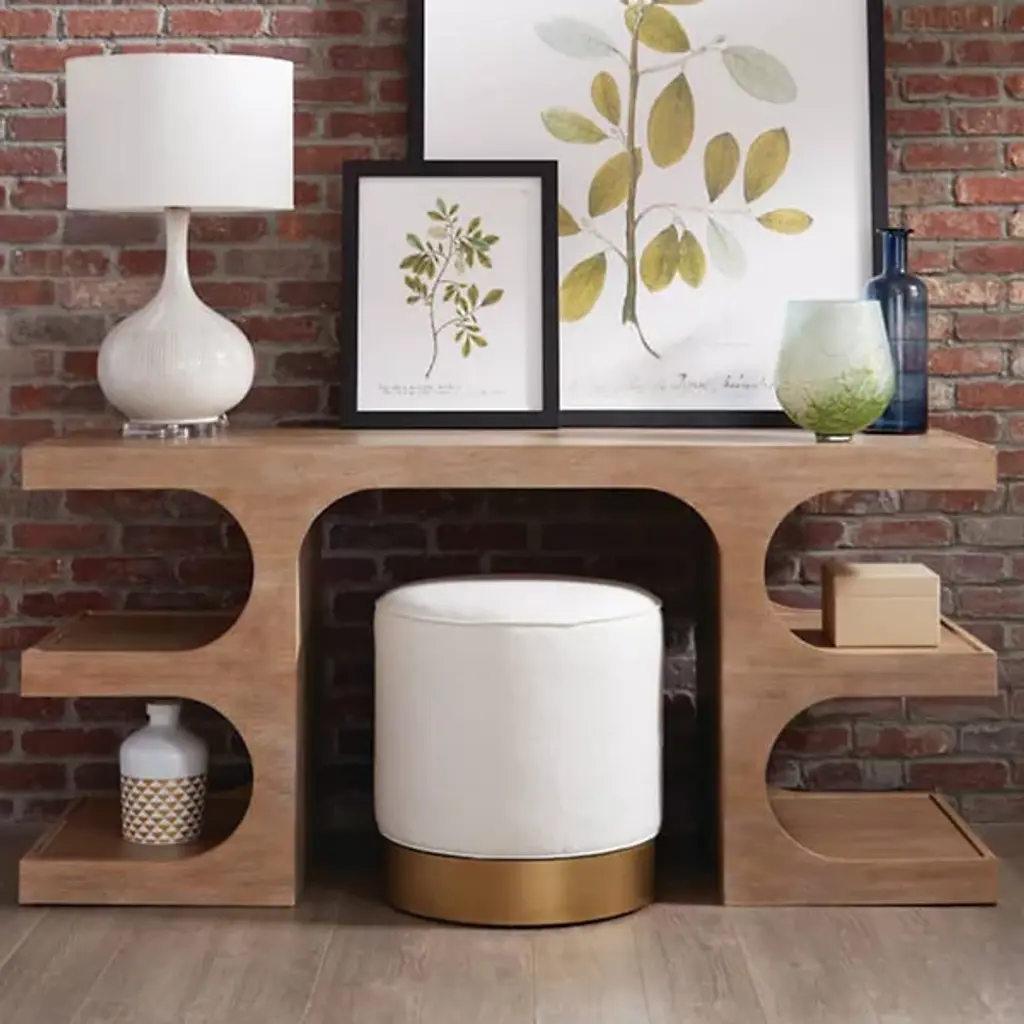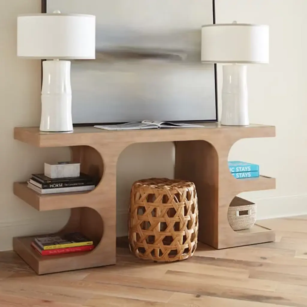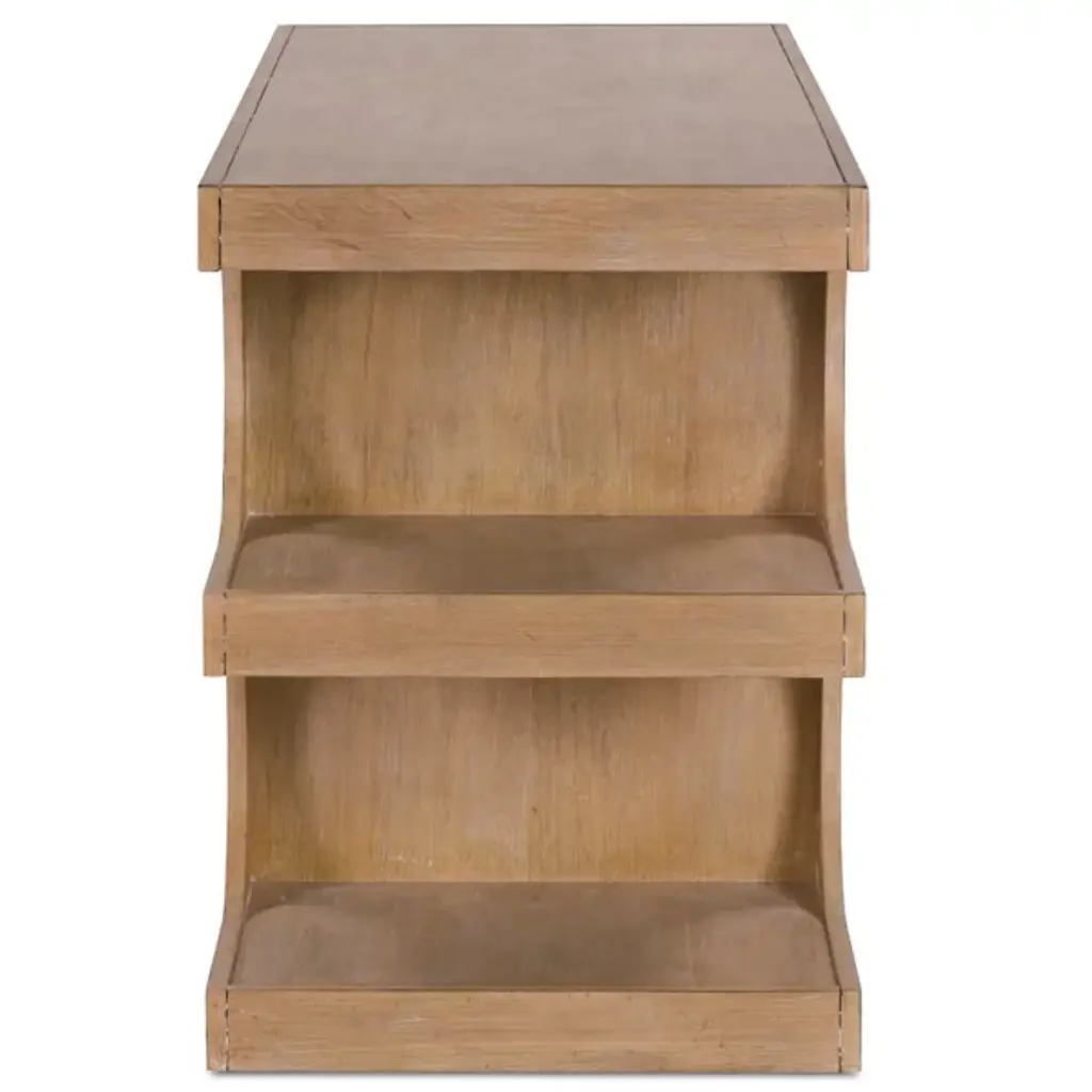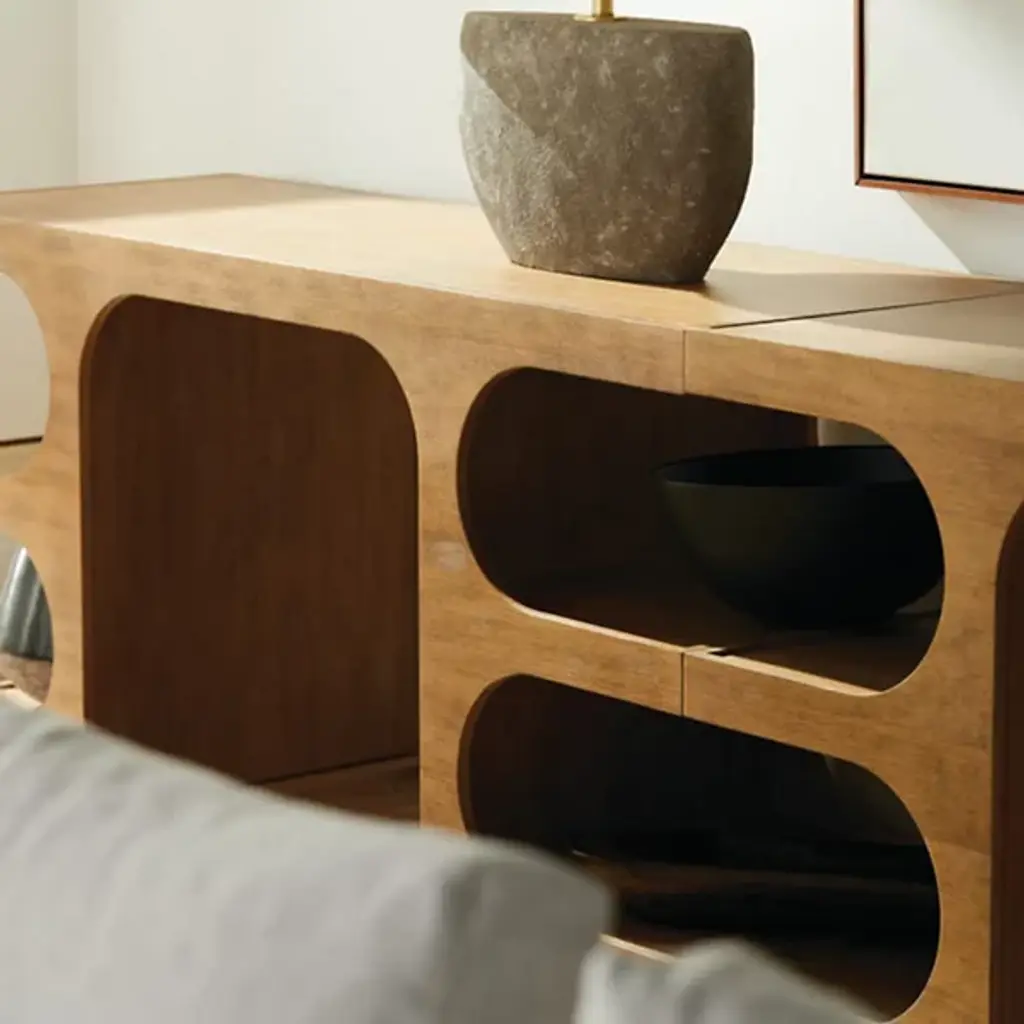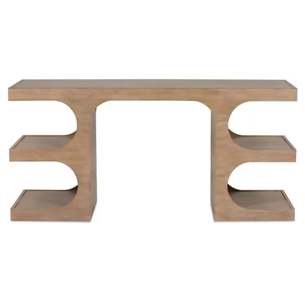 The Dune Desk from Rowe Furniture elevates storage with symmetrical C-shaped cutouts flanking each side. These distinctive curves create built-in display spaces, perfect for books, accessories, or office supplies. The substantial work surface floats between the architectural end panels, offering both style and functionality for a home office or creative space. The solid wood construction ensures steadiness and longevity, while the inventive design eliminates the need for additional storage furniture. Each curved compartment serves as an integrated organizational solution, keeping essentials within arm's reach while maintaining a clean, uncluttered appearance.
