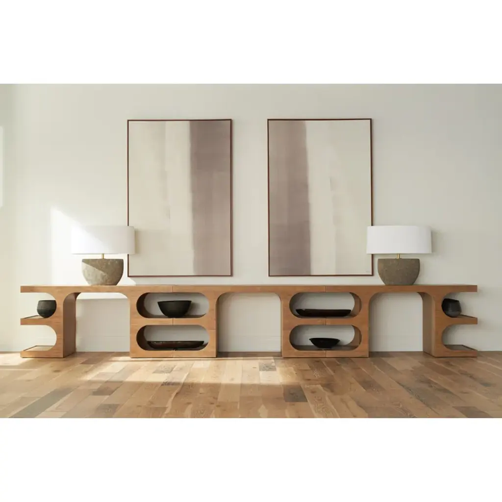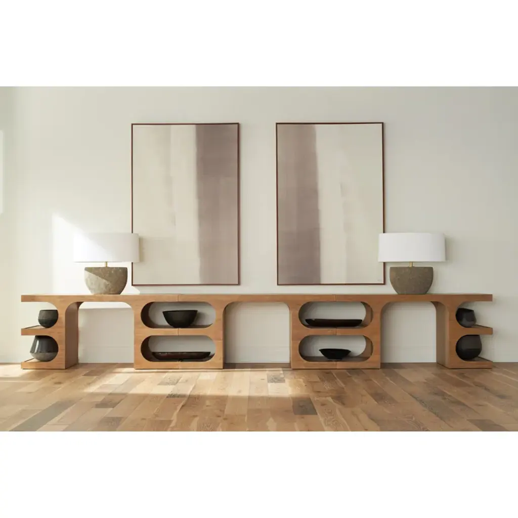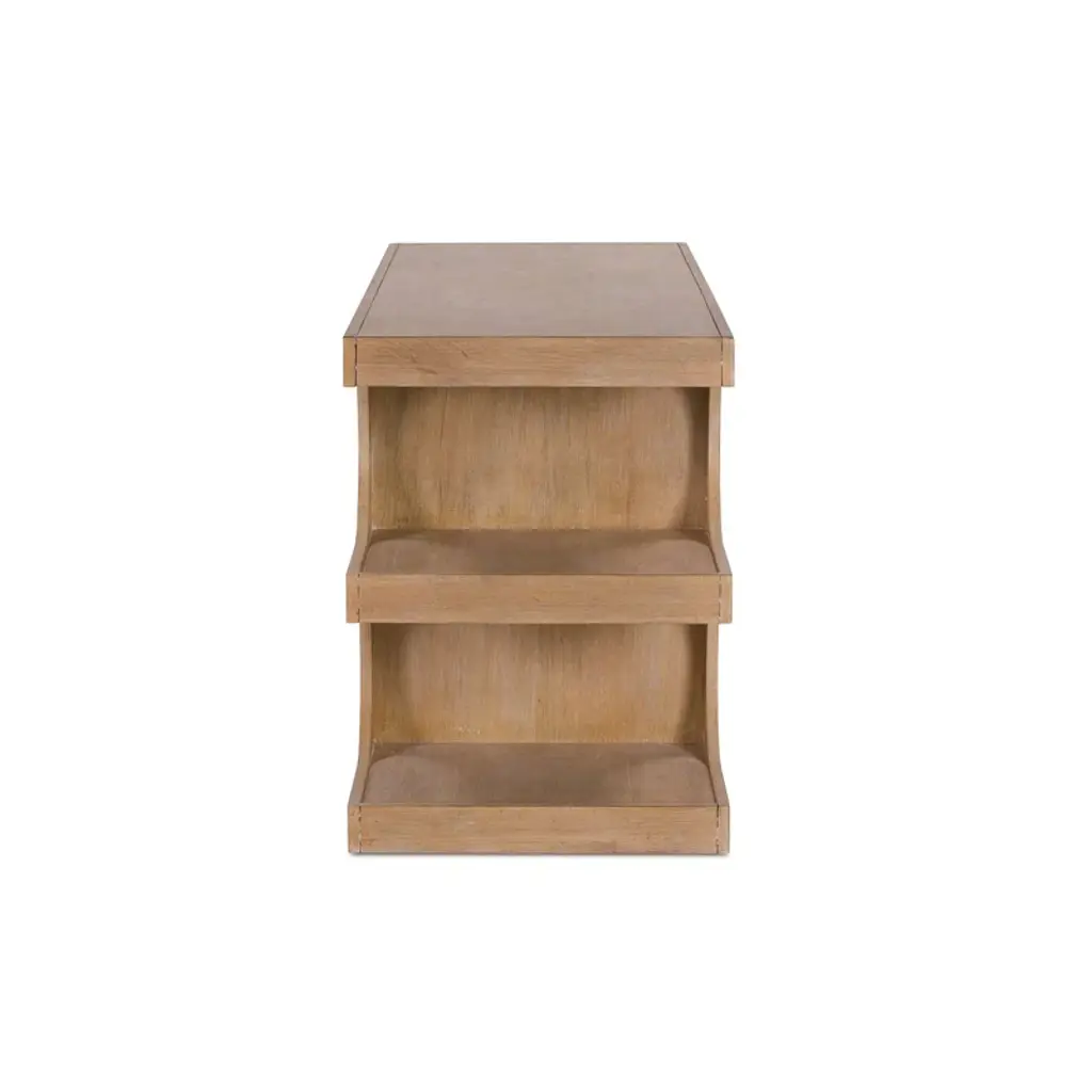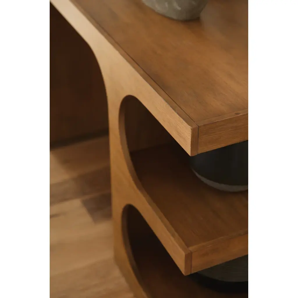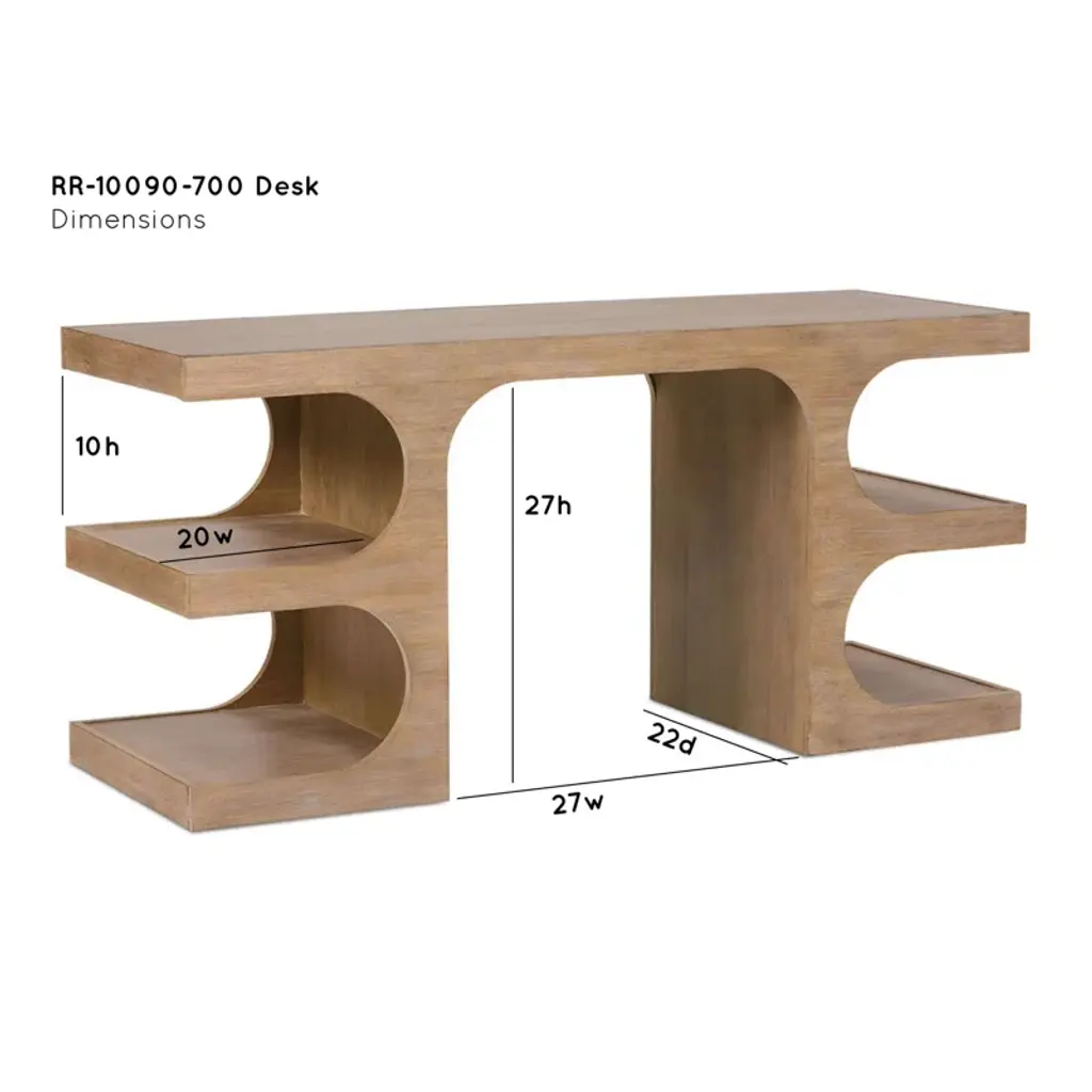 Make your workspace work for you. With its bold oval silhouette and versatile concealed storage, this desk transforms your home office. Crafted from a blend of solid and engineered wood wood grain tone, it features an oval, pill-shaped silhouette inspired by retro designs. A distressed finish adds to the retro, antique vibe. The two pillar bases have half-cylinder shapes with built-in shelving that complements the storage offered by the two drawers. At 60.3'' wide, it lets you spread out while you tackle your workday.