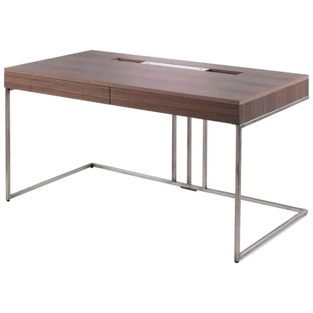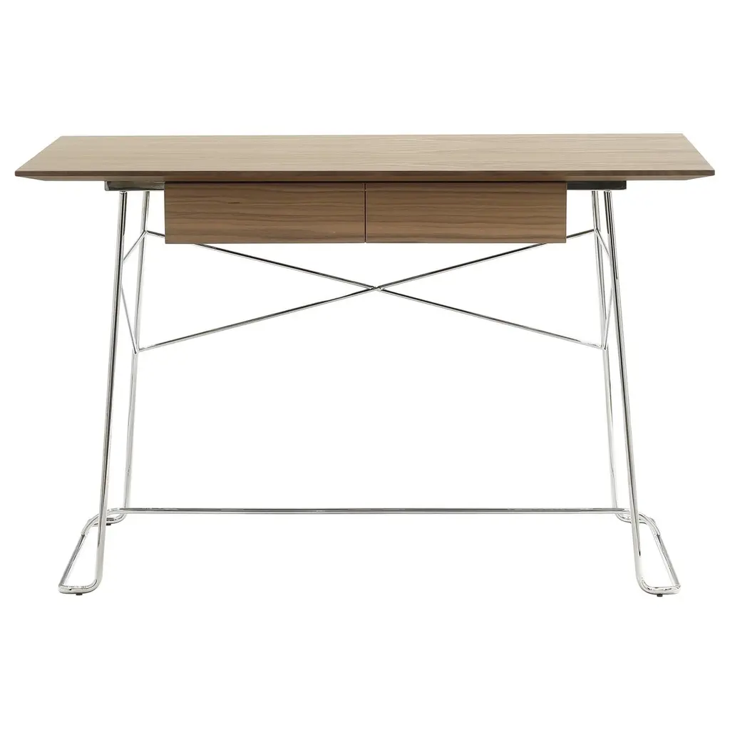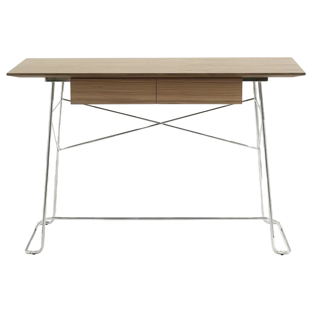 Daring and dramatic, the Eames 2500 Series Executive Desk from Herman Miller fits well into modern décor without becoming purely functional. An epic design as relevant to workspaces now as it was in its 1960s inception, it is re-imagined from a Charles and Ray Eames original, ascending from parallel bases with flared conical accents along twin columns. The double-layer desktop above contrasts the warm tones of its wood veneer work surfaces and optional leather inlay with refined metal understructure, offering stylish storage distilled into a bespoke simplicity.
