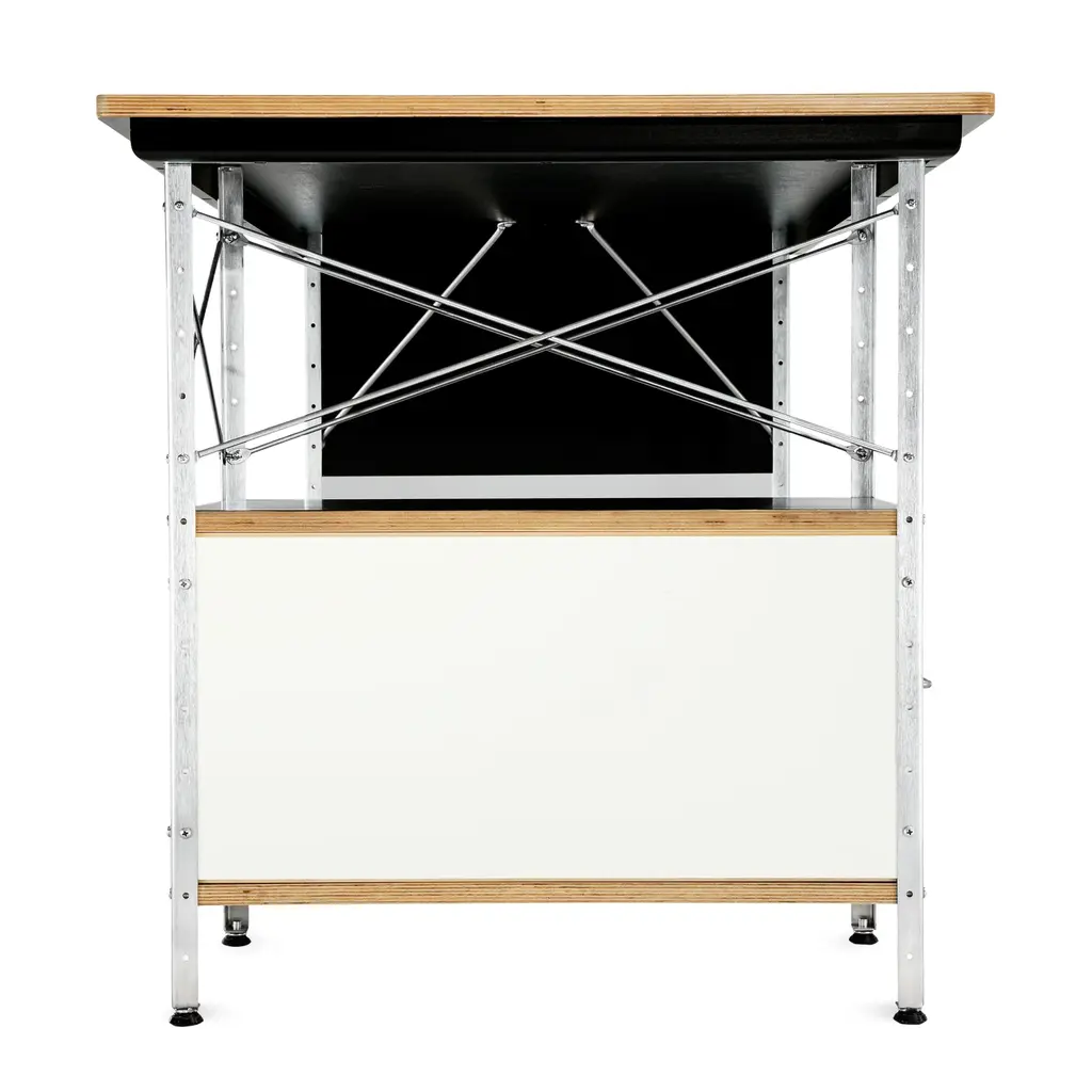 Introduced in 1950, Eames Desks are examples of Charles and Ray Eames designing and making furniture incorporating new materials and industrial production techniques. This design grew out of work the Eameses did for a 1949 exhibition at the Detroit Institute of Arts. It reveals the "machine aesthetic" and Japanese influences important to them at the time. Long before "modularity" and "high tech" entered design language, the Eameses used standardized parts that were interchangeable. They made no attempt to disguise or soften the off-the-shelf industrial look of the components. This desk features a combination of natural birch and colored paneling with a zinc-plated wire frame. Made by Herman Miller®.