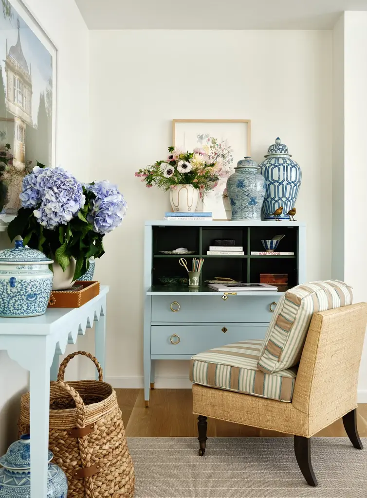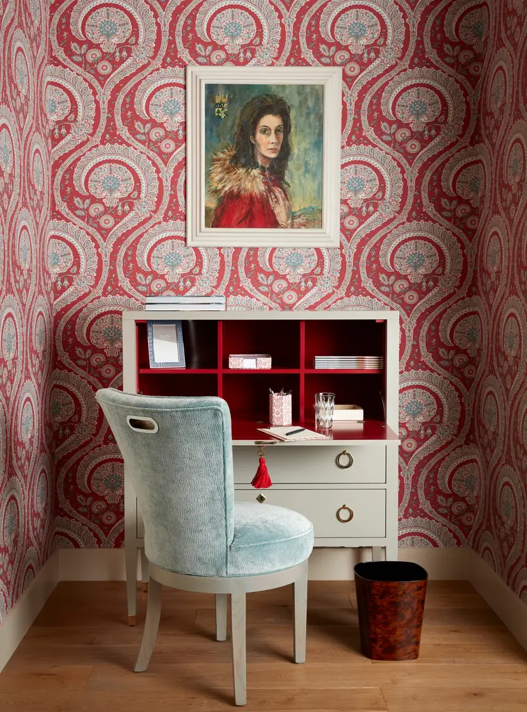 Dimensions: 40W x 18D x 46.25H Our unique take of a classic secretary desk. Two tone lacquer, tassel details, and elegant hardware, all together make this an elegant desk for bedroom or home office. The front facing door locks with a tasseled key and opens on hinges to reveal a beautiful work space, complete with built in (removable) shelves. Chose a vibrant interior to really make a statement. Two lower "soft close" drawers to stow additional items. Chose your hardware - Brass or Nickel, tassel color, and interior and exterior colors. 15 Tassel colors. Please note, the finish on the surface of the chest has a more durable finish, which may appear "less shiny," to accommodate the natural traffic of a desk's surface. Made in the U.S.A.