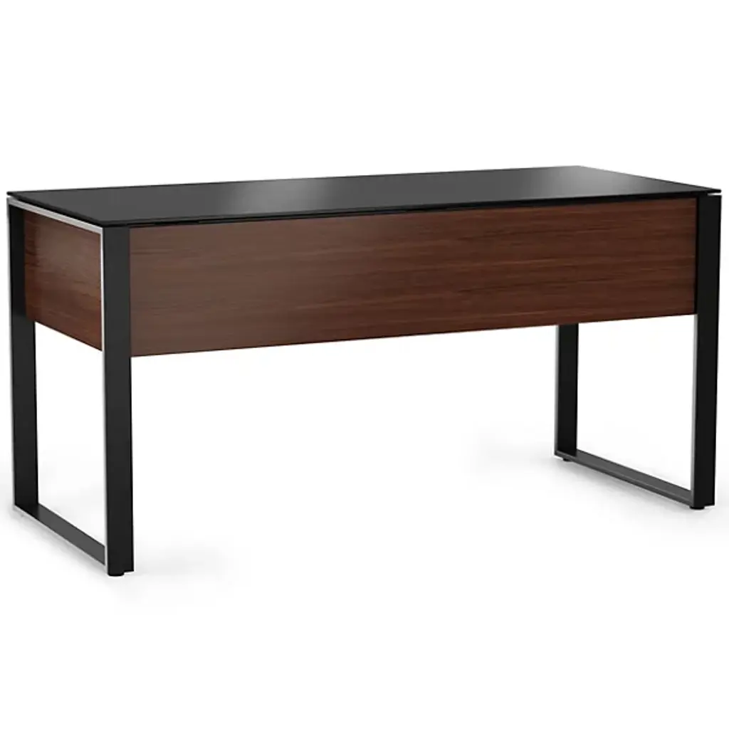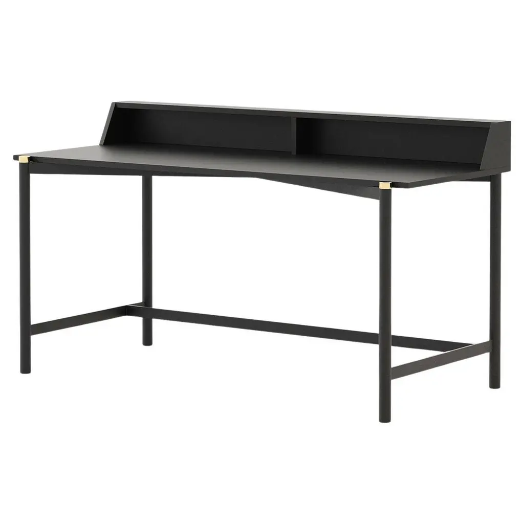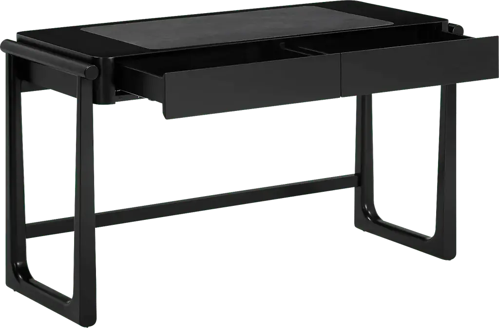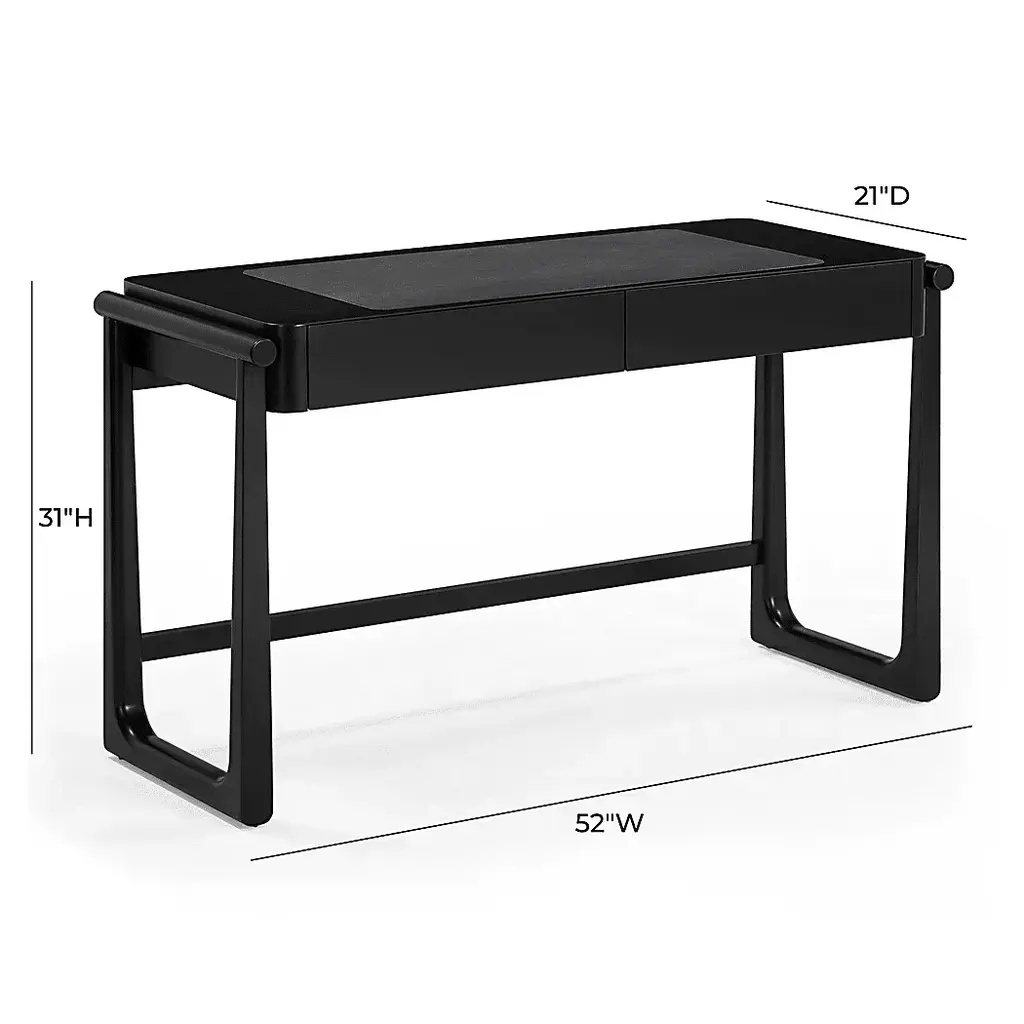 The Ecliprises black desk brings chic utility with two smooth-glide drawers and a padded work surface wrapped in ultra-cleanable, yacht-grade vegan leather, pen marks and heavy typing, no problem. A glossy lacquer finish adds a sleek touch. Customer assembly is required.