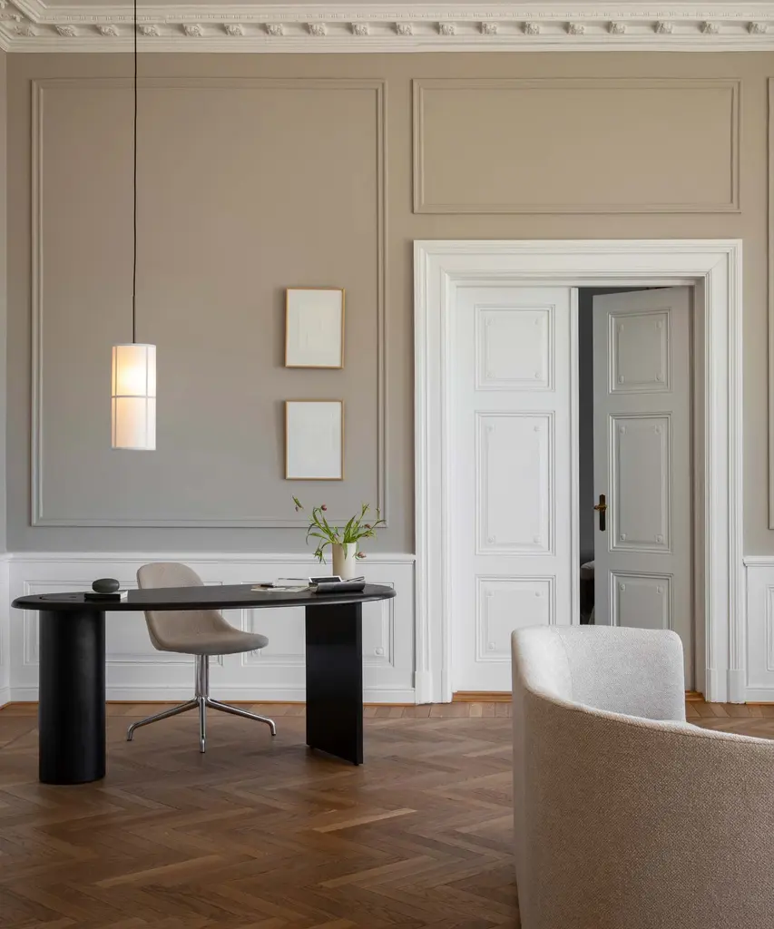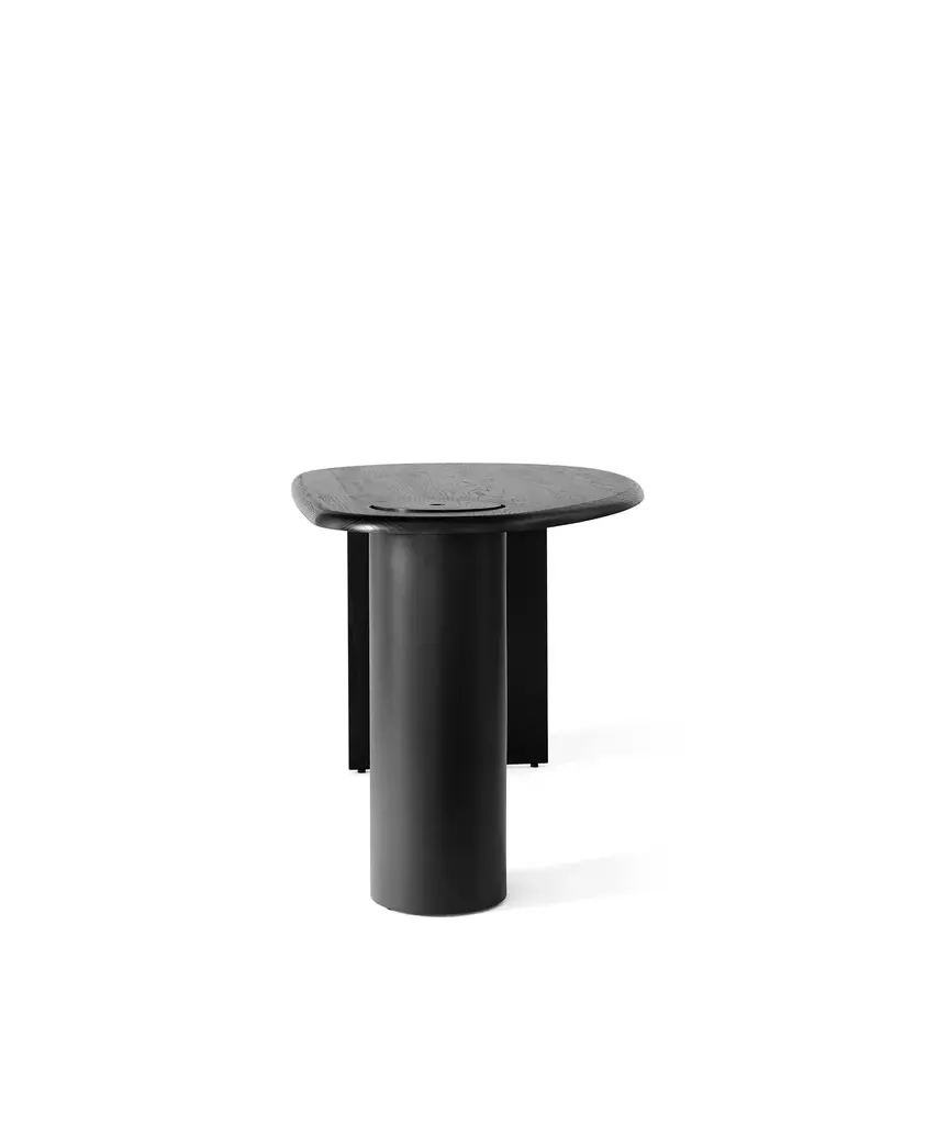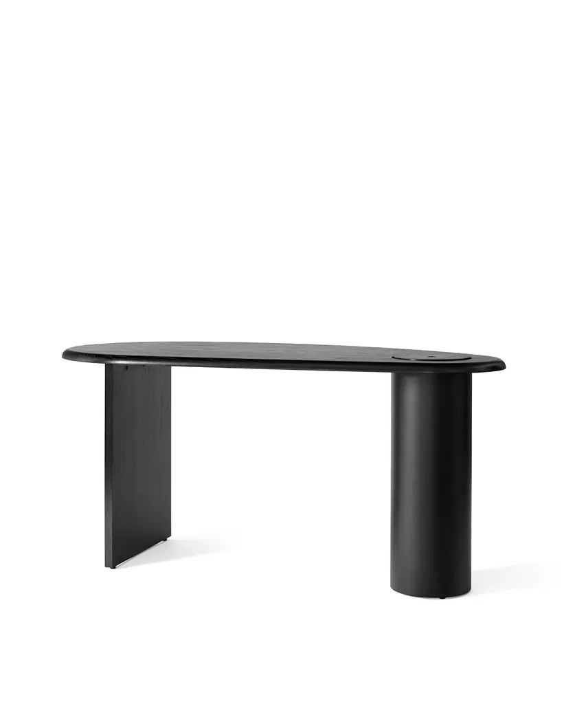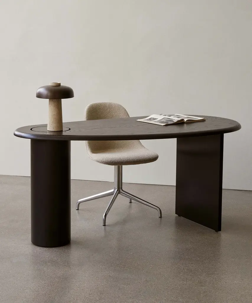 Sculptural, functional and tactile, the Eclipse Desk is an exploration and celebration of materials and form. Designed for MENU by Fred Rigby Studio, the asymmetrical piece originated as a hand-drawn line that looked to the shape of pebbles for its design cues. Crafted from solid, dark-oiled oak polished to a high shine finish, the sweeping tabletop has intriguing convex and concave edges. It rests on a gently curved leg and a steel column, the latter of which cleverly conceals a storage bucket under its integrated wooden lid, ensuring a clutter free surface that underpins the streamlined beauty of the organic design. Imagined as both a standalone centrepiece in the middle of a room or for placement up against a wall as a more conventional piece of furniture, the intriguing form of the Eclipse Desk draws the eye and invites to touch while offering a sense of calmness that lends itself to productivity. “I found inspiration for the piece by looking to the shapes and forms of pebbles I collected on a beach. I wanted to create a design that wasn’t static, and one which was bold in colour yet tactile in form. I want people to feel inspired when they sit at it. To lean back and touch the curved edge; to find a calmness within to focus on work.” - Fred RigbyDesigned by Audo Copenhagen for Danish design company, Audo Copenhagen.