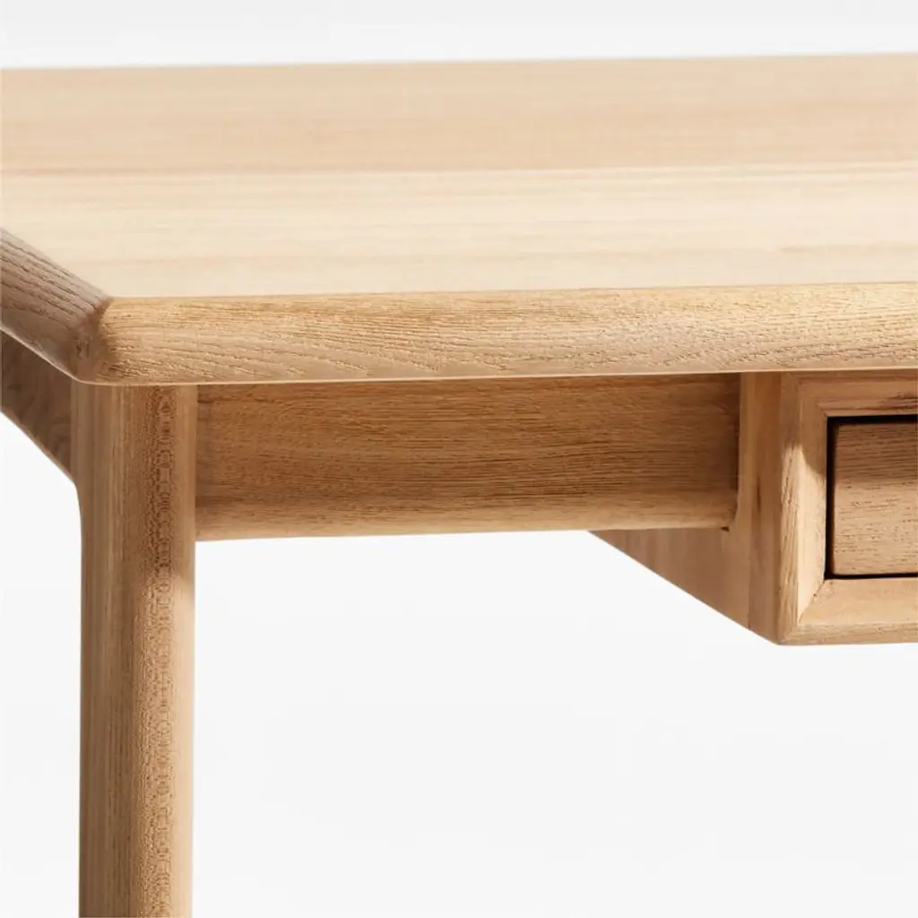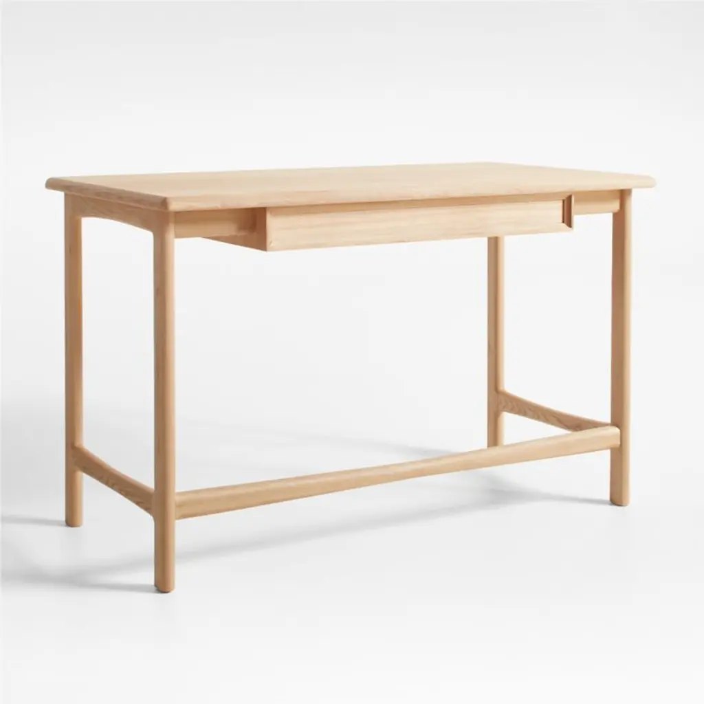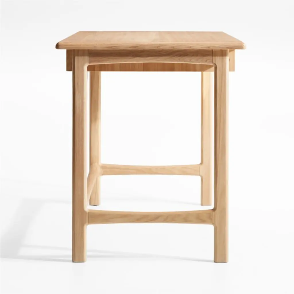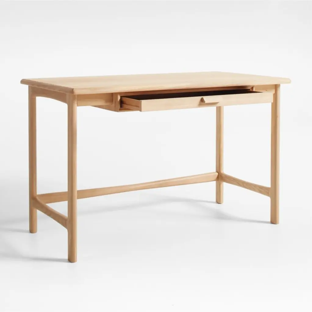If your home office is ready for an edit, consider the pure functionality and Nordic-inspired design of our Elias desk. A light rye finish updates the mid-century silhouette, showcasing the elm desk's clean lines and artisan-like woodworking. Rounded edges and subtly curved stretchers soften the linear silhouette, while the recessed apron floats a single drawer for laptops, pencils, papers and other desk essentials. The Elias office desk is a Crate & Barrel exclusive.By choosing FSC®-certified furniture, you are supporting responsible management of the world's forests.