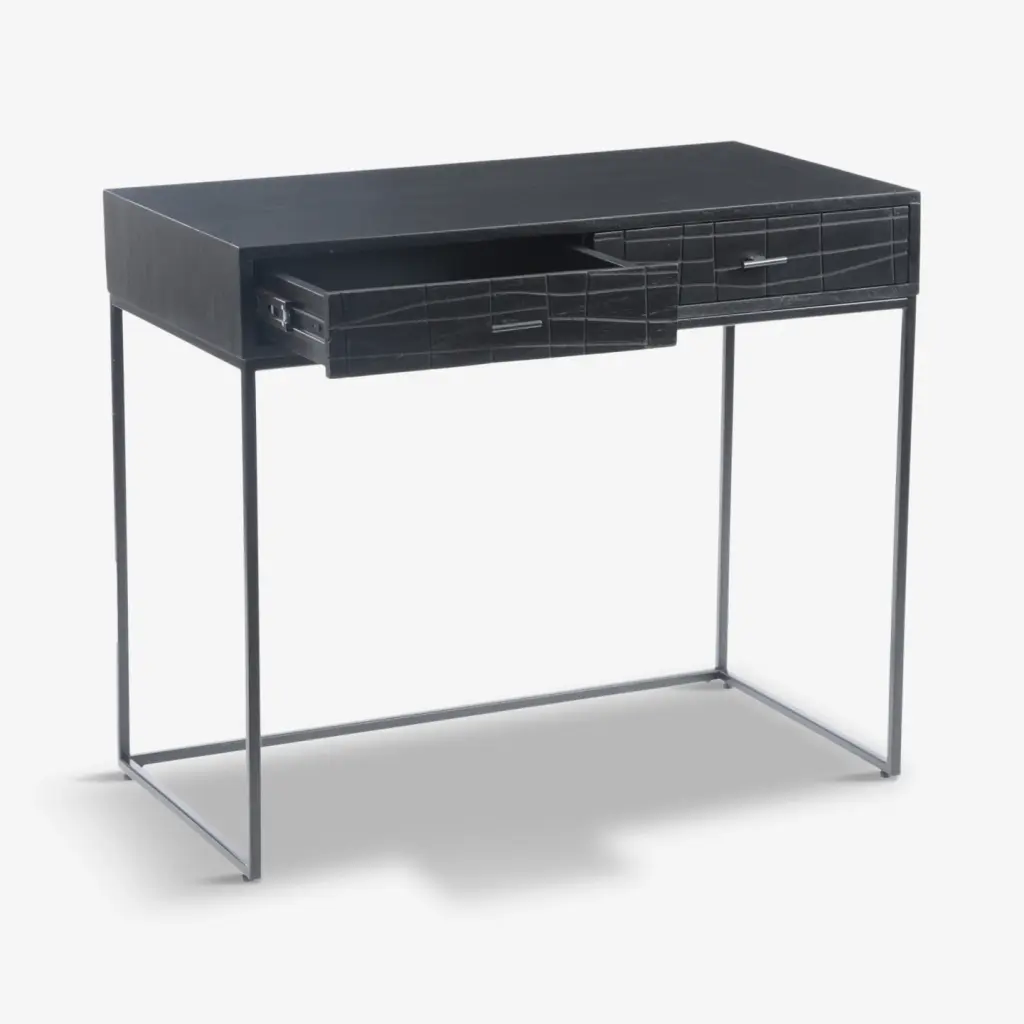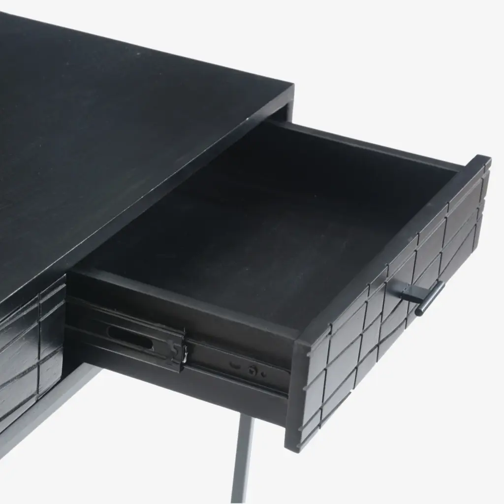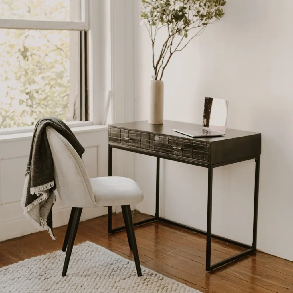 Pen your next screenplay or build your own startup at the Ember Desk. This luxurious office piece is crafted from solid acacia wood with a matte black textured front. Sitting atop a sleek iron frame, with two sliding drawers, this desk is as functional as it is handsome.