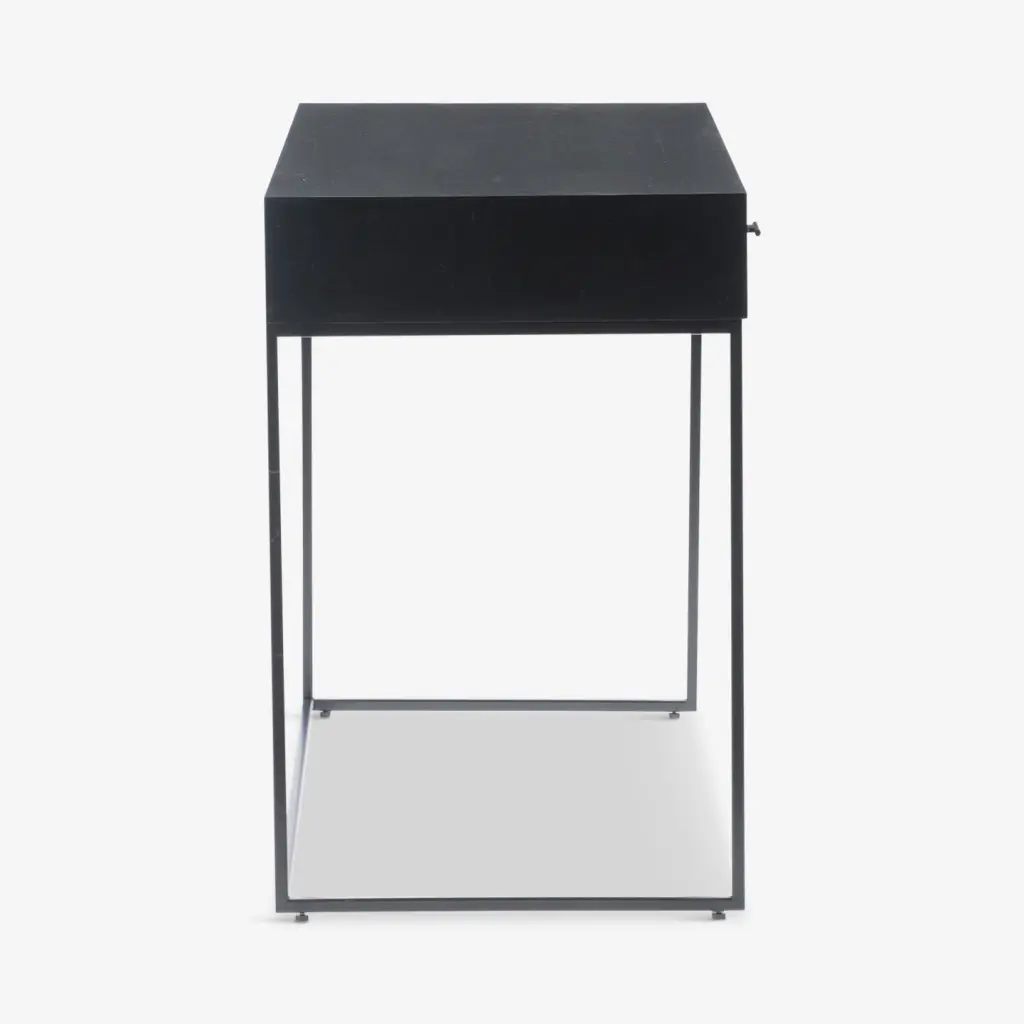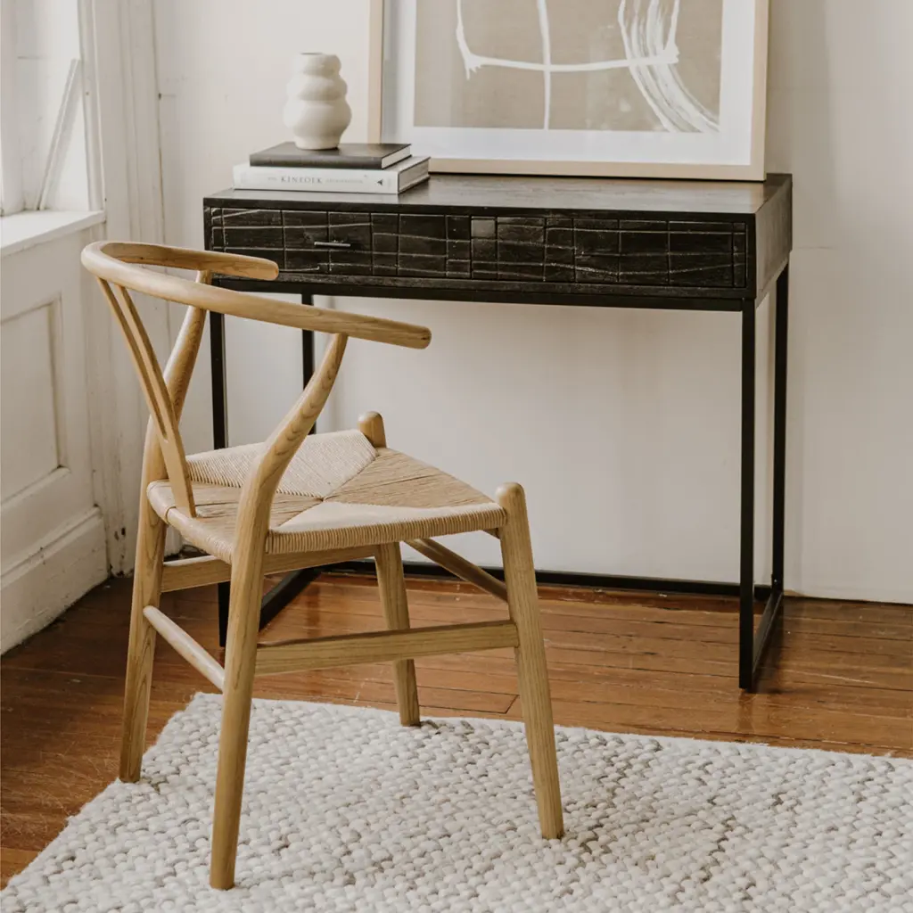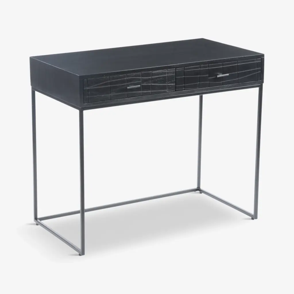 Pen your next screenplay or build your own startup at the Ember Desk. This luxurious office piece is crafted from solid acacia wood with a matte black textured front. Sitting atop a sleek iron frame, with two sliding drawers, this desk is as functional as it is handsome.