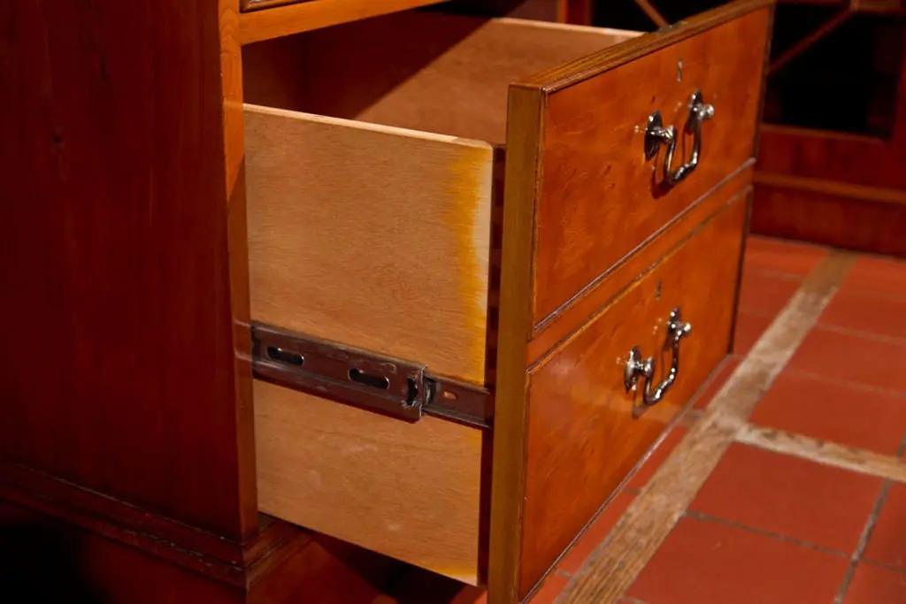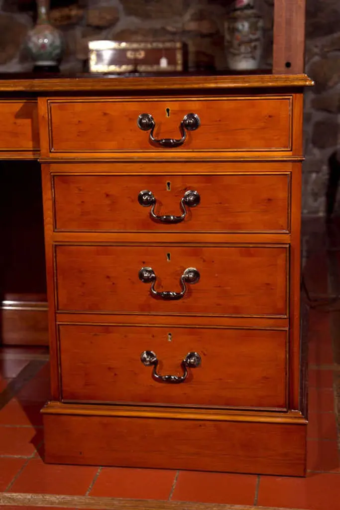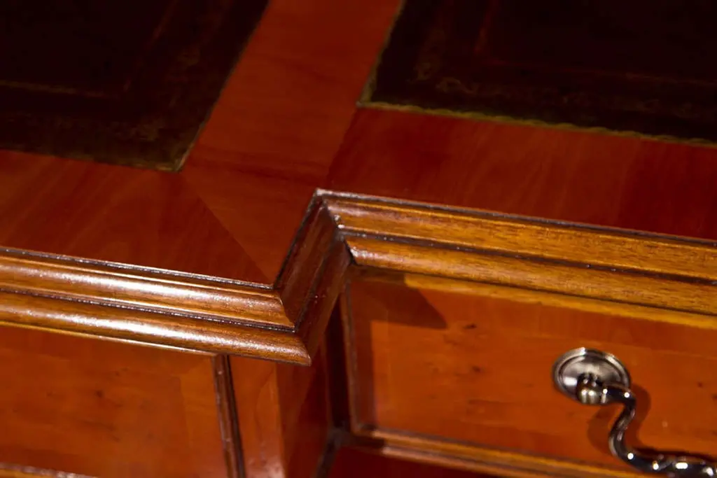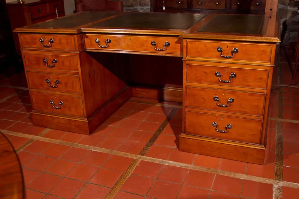This pedestal desk features a modesty panel as well as two file drawers and three-piece parchment and green, tooled leather. A center inset gives the normally boxy desk design a clear break from the norm and provides visual interest. Custom sizes and veneers are available.