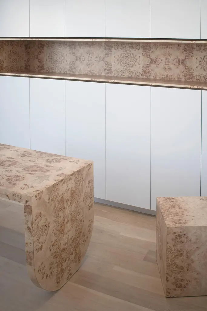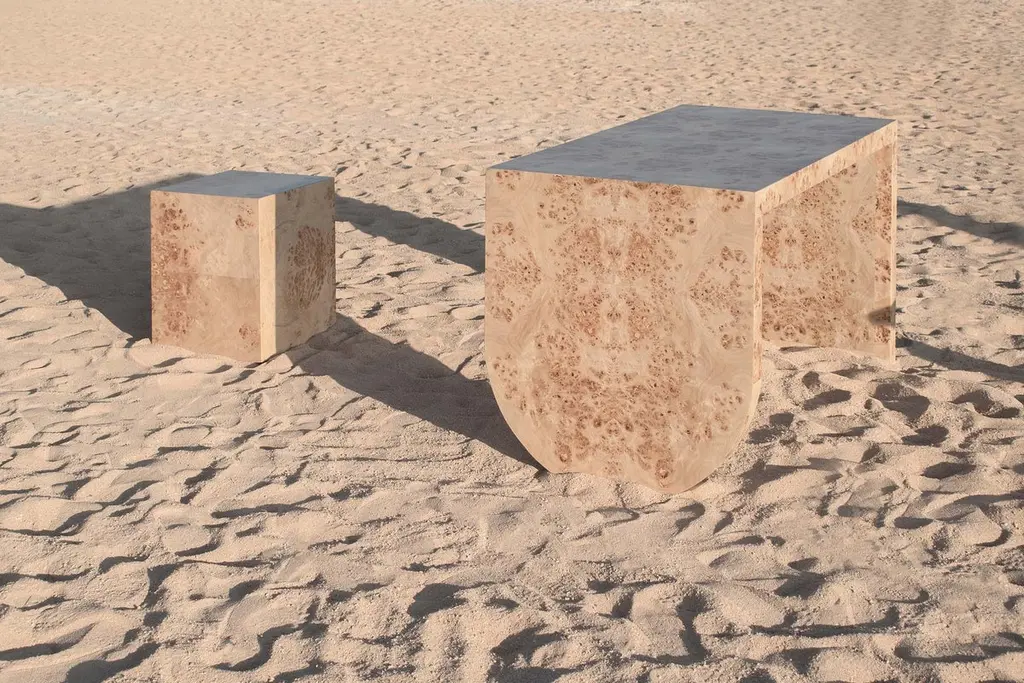 Epifania desk & cube by Studio ChristinekaliaDimensions: Desk: W 70 x D 140 x H 75 cm.Cube: W 40 x D 40 x H 40 cm.Materials: Wood, burl venner. Christine Kalia is a design studio exploring modes of spatial relations between architectural, interior and product design. The studio’s vision is calibrated towards ecocentric design and contemporary aesthetics; where the end products manifest the prime materials. The various collections take different approaches to this design mode, often seen as sitting in-between reality and daydreaming. The “coming from” of each design’s unique materiality is carefully crafted towards a “belonging with”, where the sophisticated design of the studio’s products is complementing any environment, in order to elevate its aesthetic aura.Christine Petrou is the creative director and founder of Studio Christine Kalia since 2016. Born in Larnaca in 1990, she is a trained architect with studies in Cyprus and the United Kingdom. Through her practice, Christine reshapes often found materials into contemporary design pieces of domestic use, bringing nature closer to the human environment.