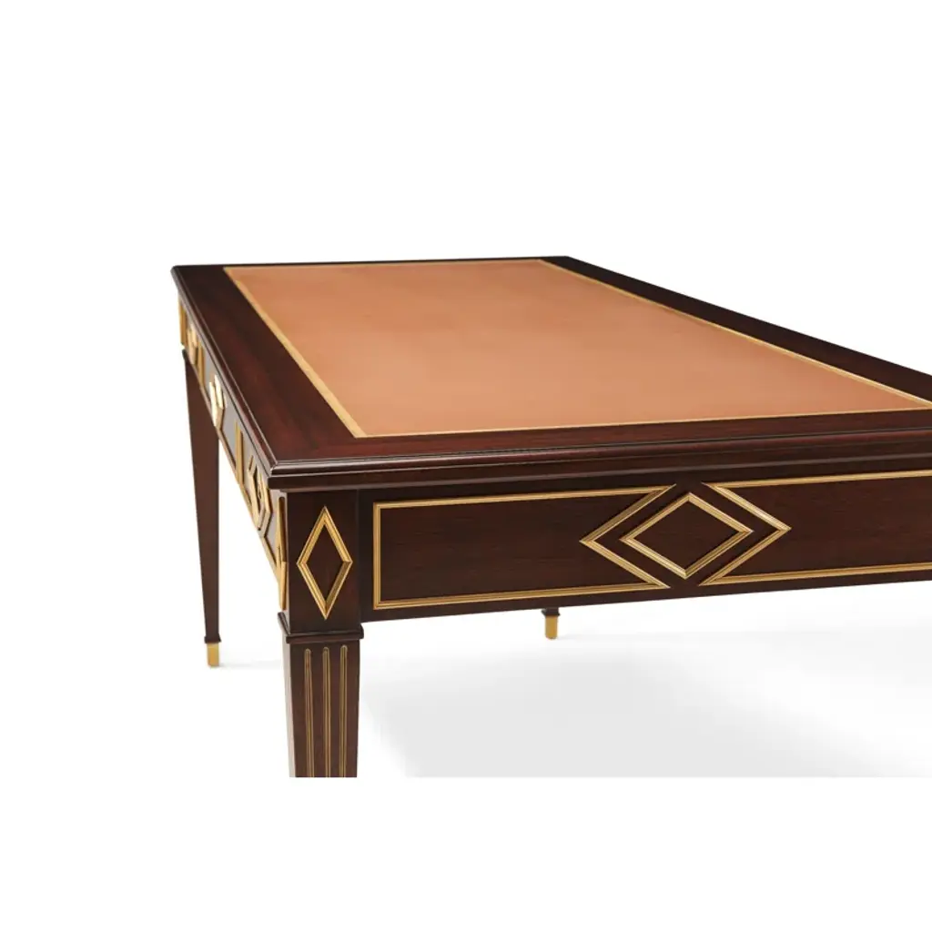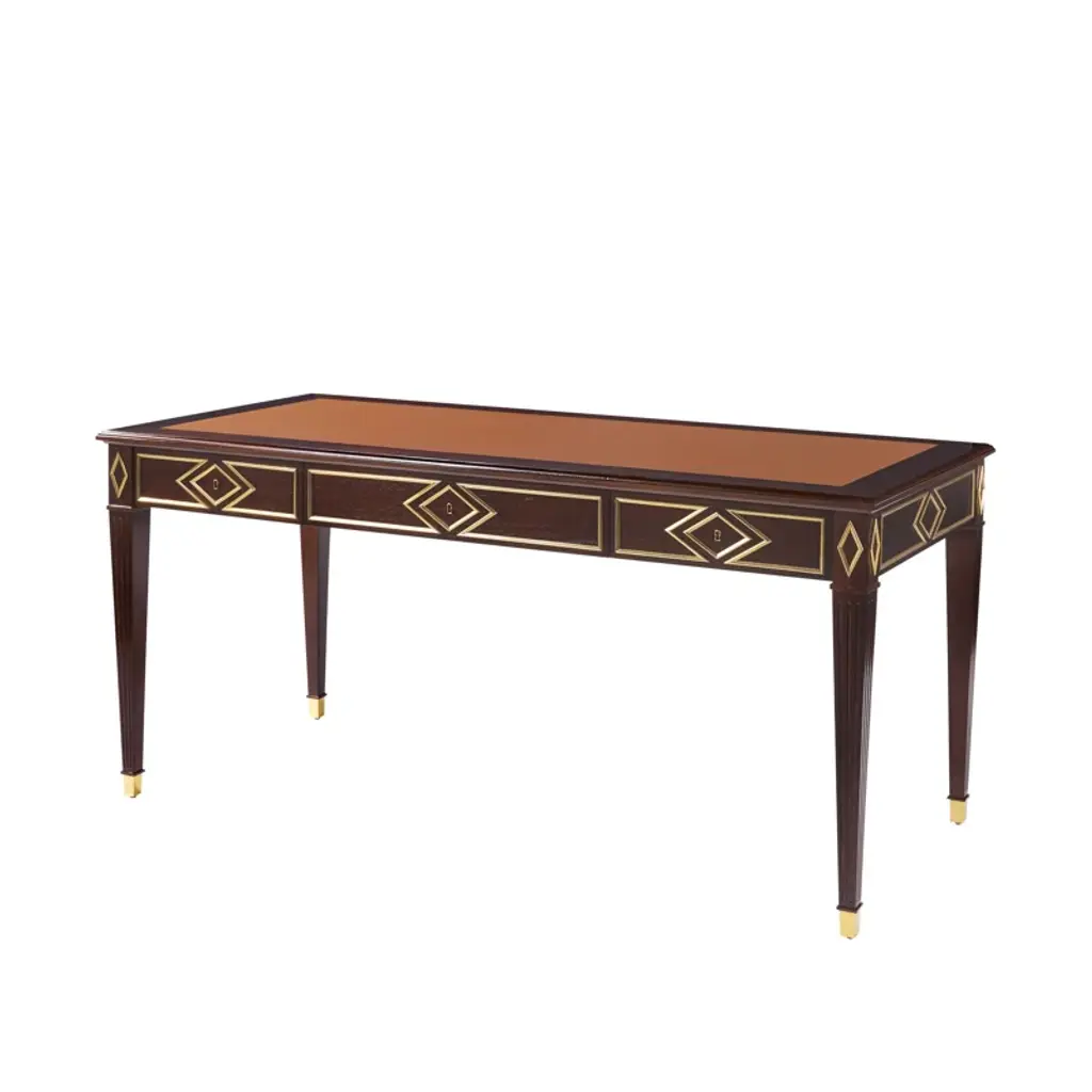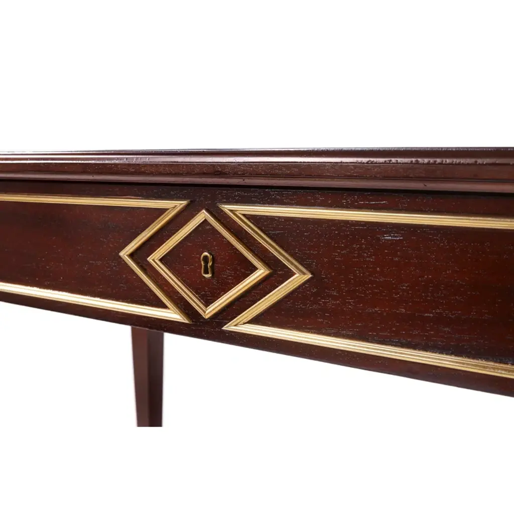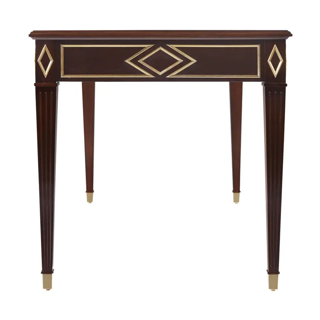 This Russian Neoclassical stunner features inlay brass details on the apron and drawer faces in a classic modernized diamond pattern that stays true to historical influences. A leather inset top compliments the fluted legs and brass cappings bringing balance from top to bottom.
