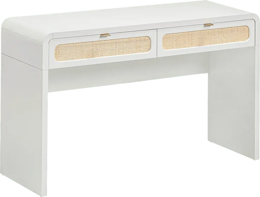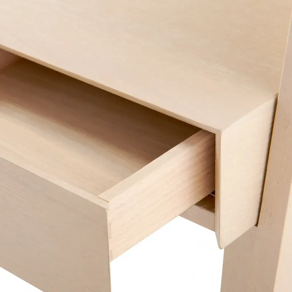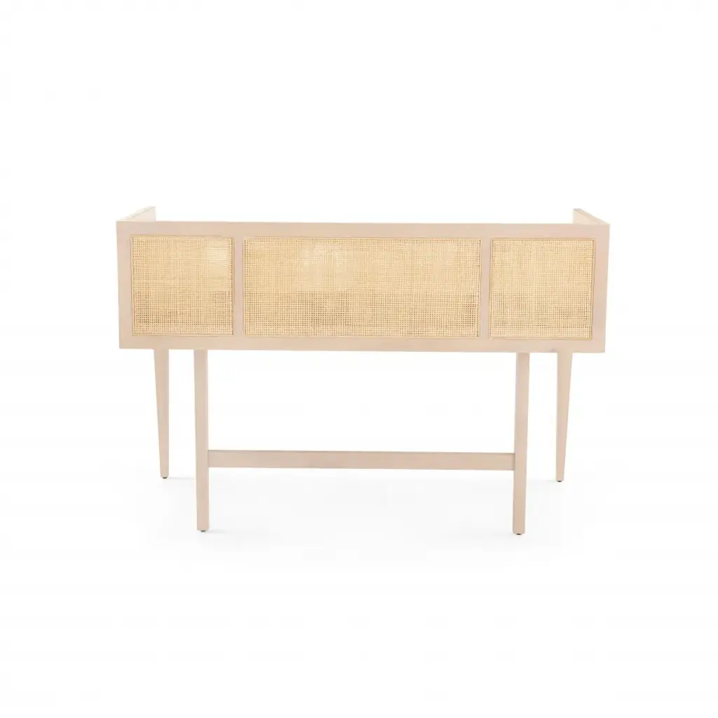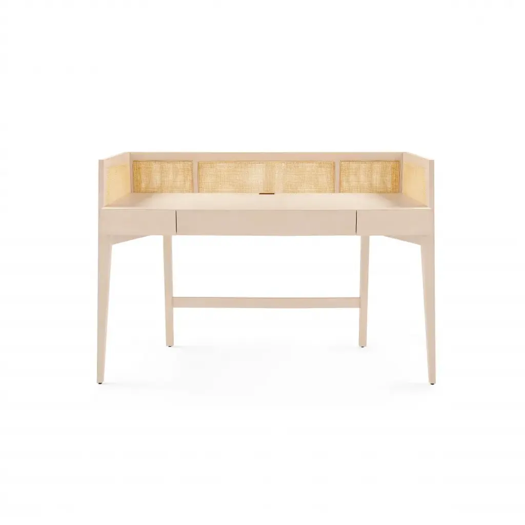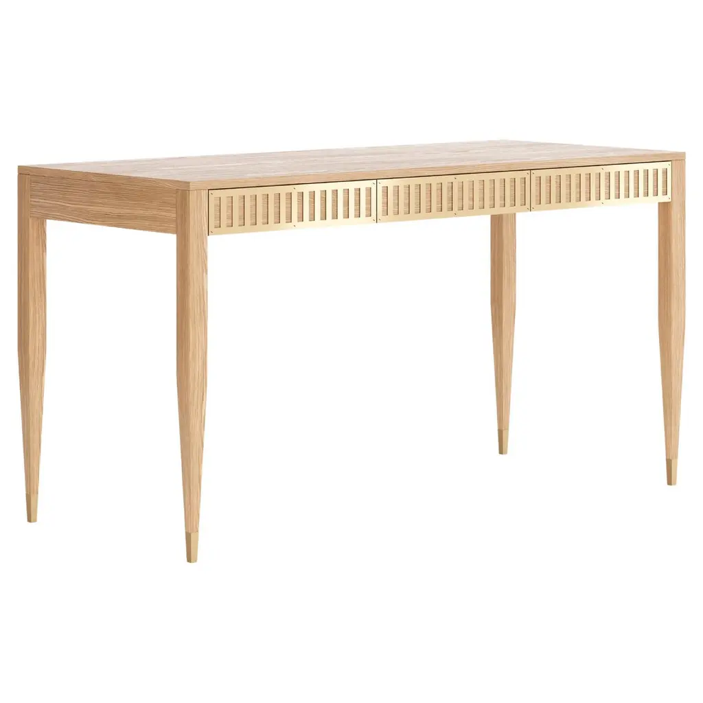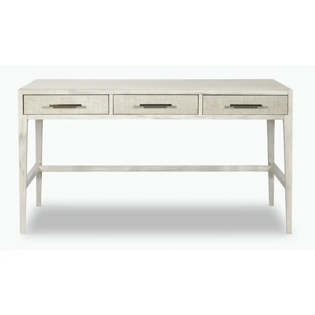 The Evan Collection is a modern minimalist's dream come true. Combining inspiration from Scandinavian and Japanese design, this collection is simple, clean, and uses an elegant combination of natural materials. Each piece is comprised of straight-grain Bleached Cerused Oak and Bleached Cane Panels. The desk has three drawers with veneer interiors and soft closing glides. At the back center of the desktop, there is a small rectangular hole through which you can hide any unsightly cables. Designed with a lip under the drawer rather than a metal pull, there's no extraneous hardware to conflict with the natural, simple, and elegant appeal of the piece. The Evan Desk is a beautiful addition to any living room or office.