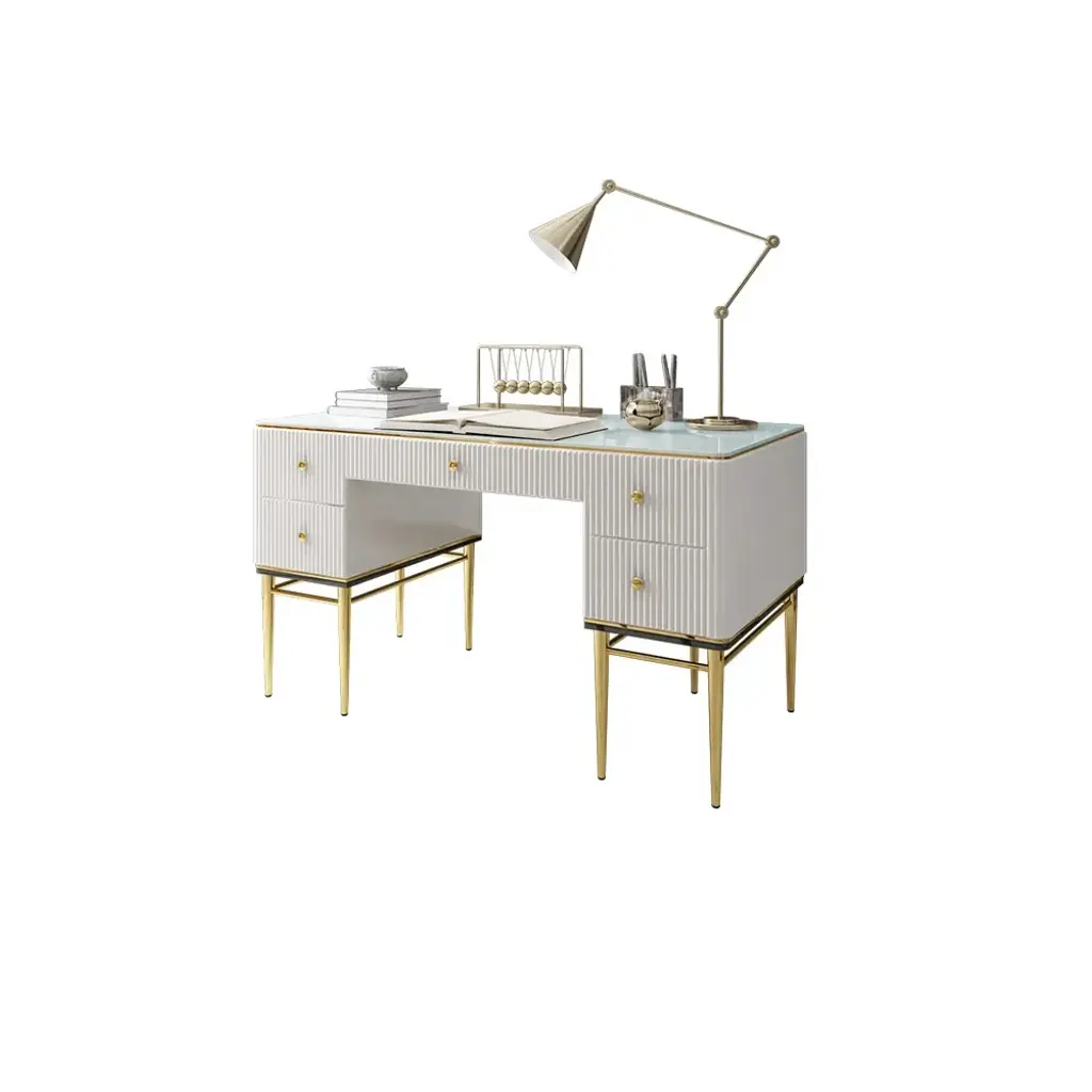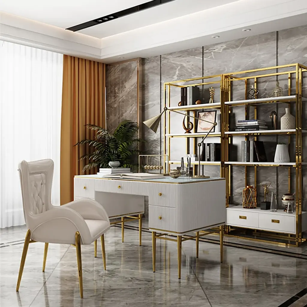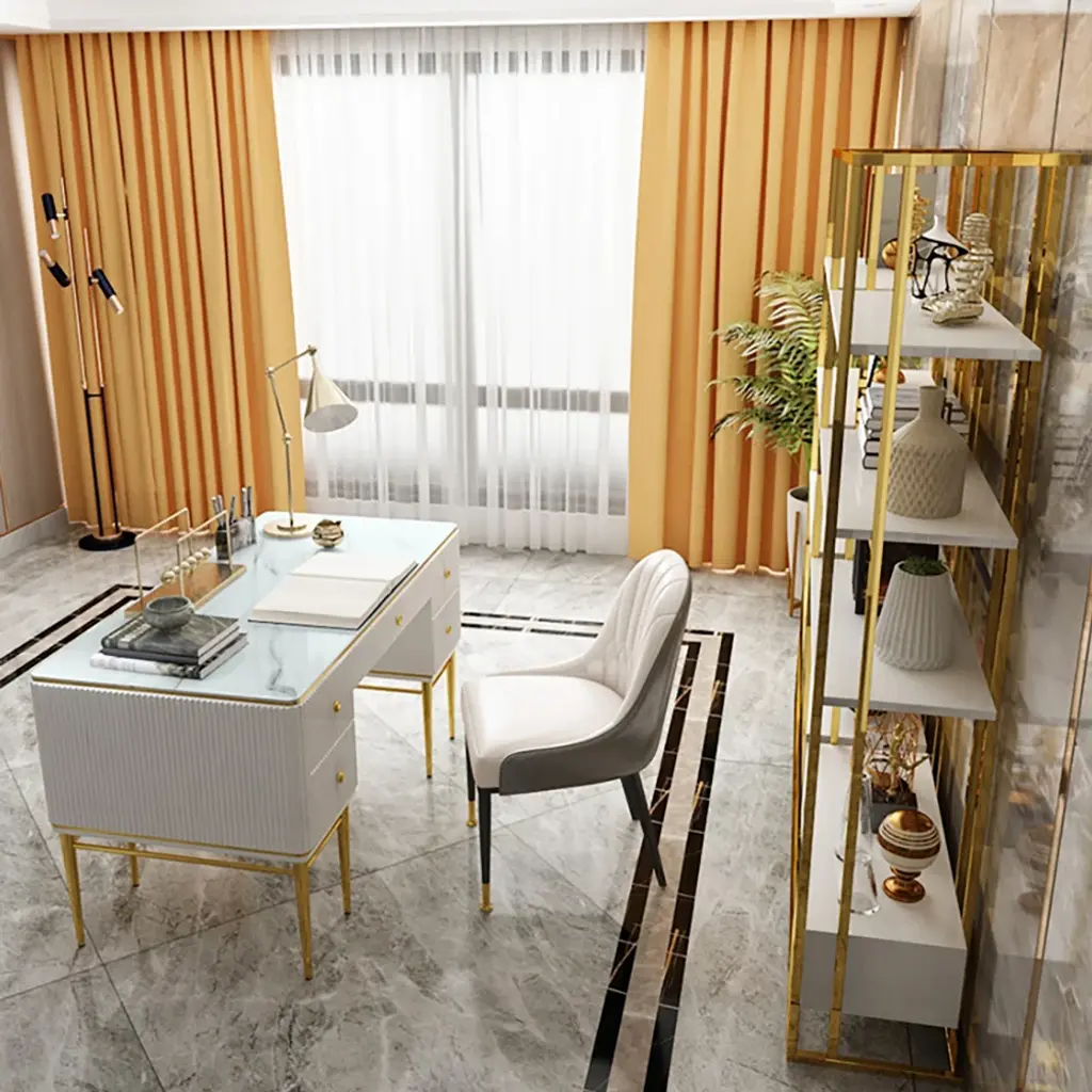 Elevate your workspace with this 55.1" executive desk, combining premium materials including solid wood, engineered wood, and tempered glass for lasting durability. The sleek white finish and stainless steel accents create professional elegance, while abundant storage keeps your office organized. Perfect for executives who value both style and functionality in their workspace.
