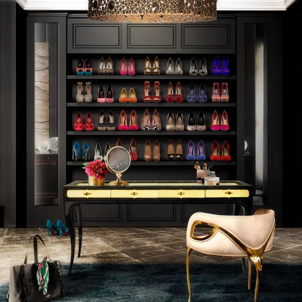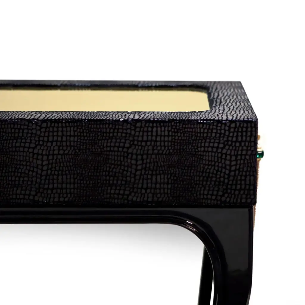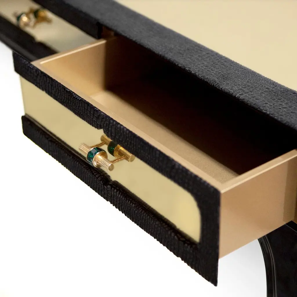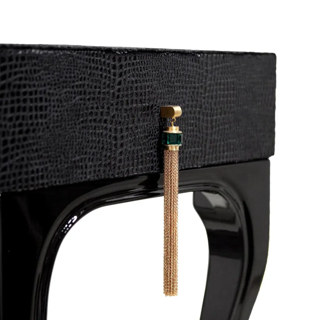 Exuding feelings of fantasy, this highly coveted desk is bold, daring and seductive. Her wooden frame is cloaked in an exotic fabric with a complementing metal top, juxtaposed with the mesmerizing movements of shimmering glass tassels.