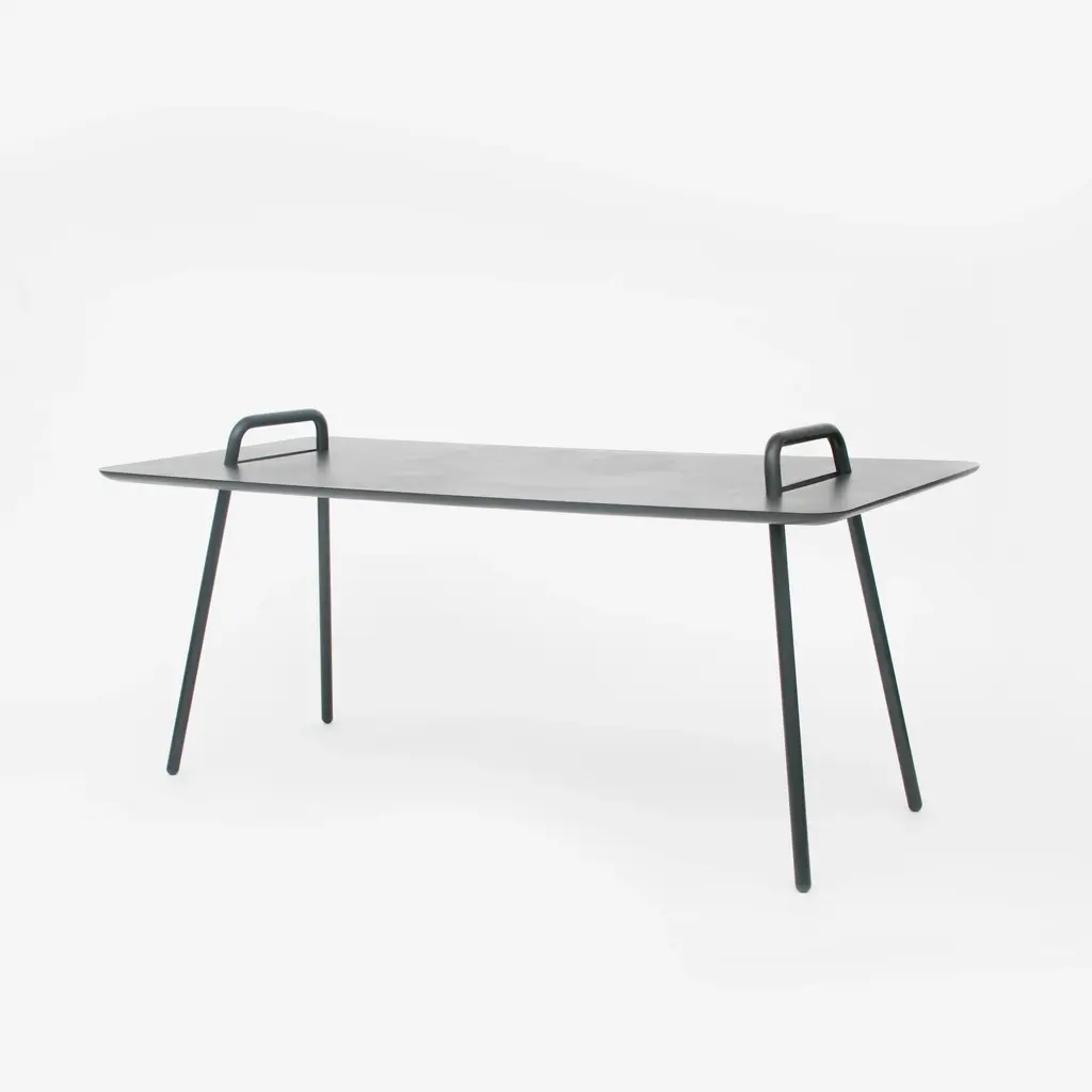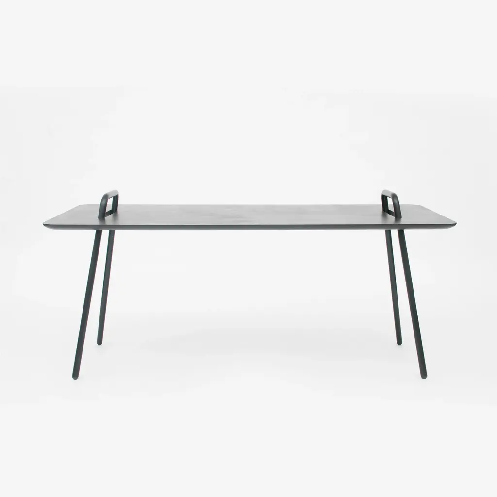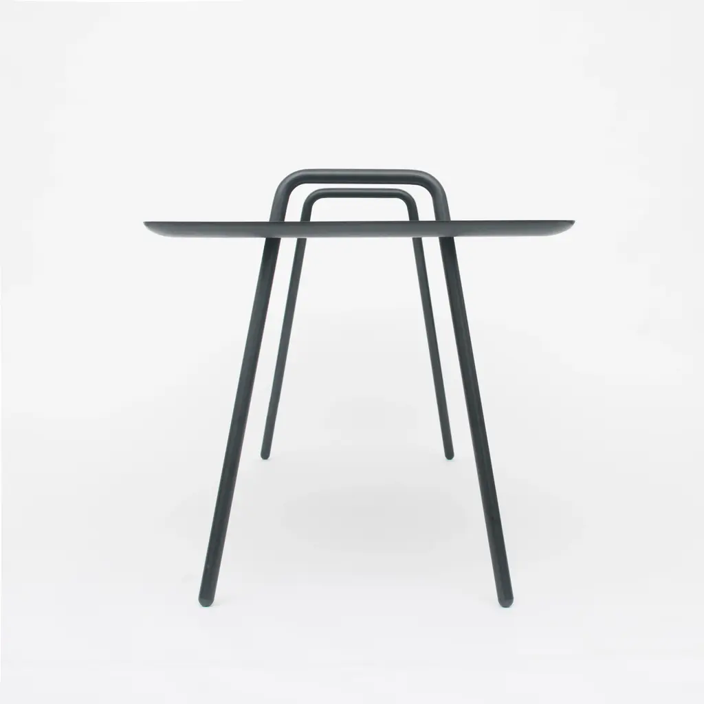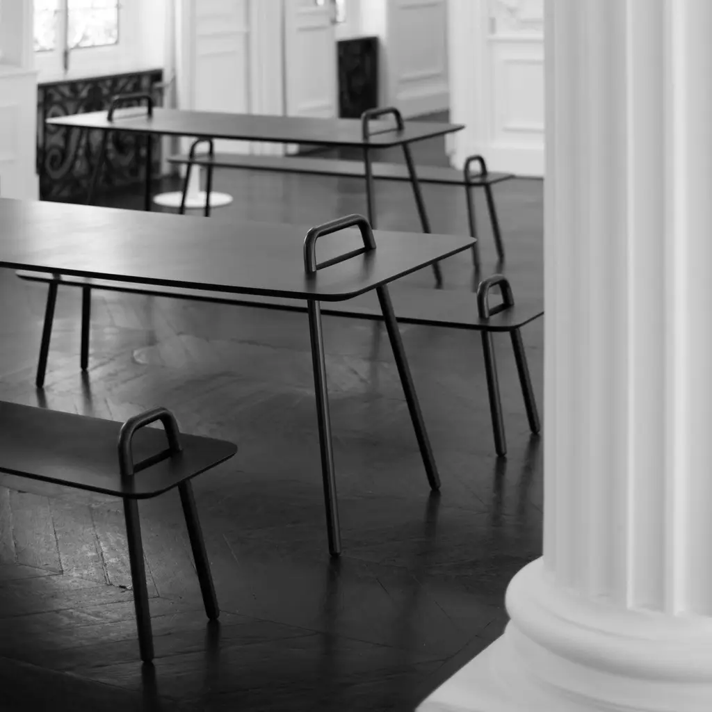The table or deskAGRAFEis a piece of furniture simply composed of 3 elements. Two curved powder-coated steel tubes, like staples, are slanted across a satin black Valchromat ™ tray to keep it standing. The steel legs fit perfectly to ensure total stability so that the top and feet are one. The two cutouts created in the wood enable the passage of cables laterally, which frees up space under the desktop and allows the desk to be used face-to-face in a co-working type of space. The desk can be easily dismantled for a flat storage if necessary. Stamped by Maker,Numbered,Stamped by Maker,Numbered