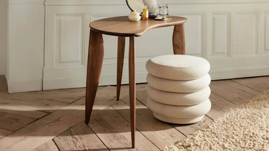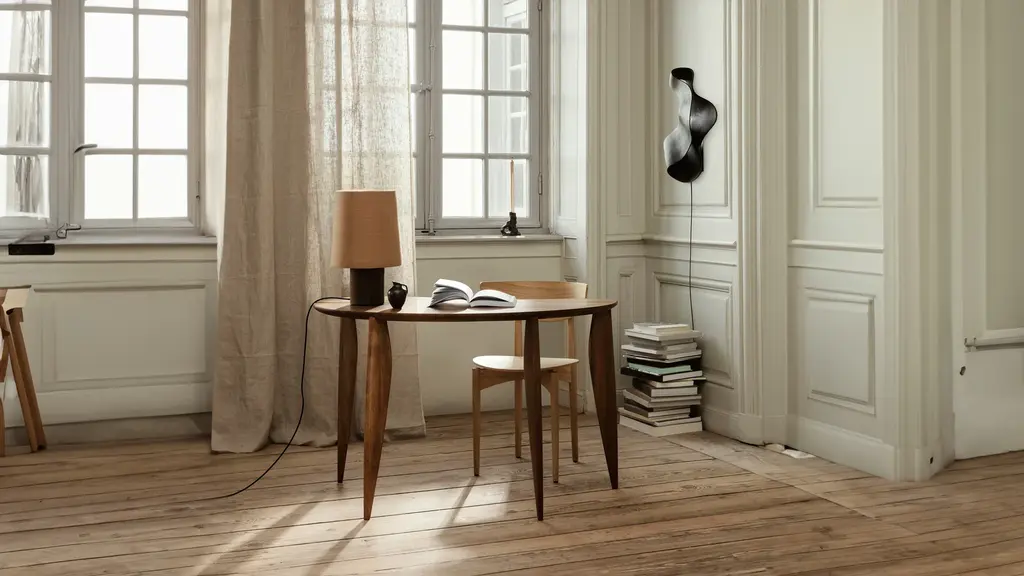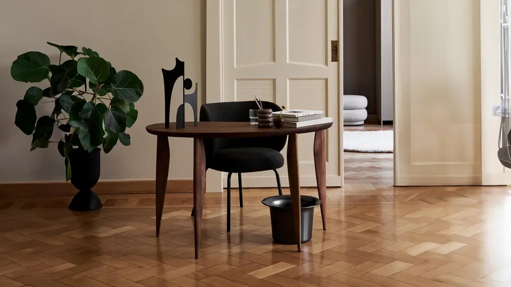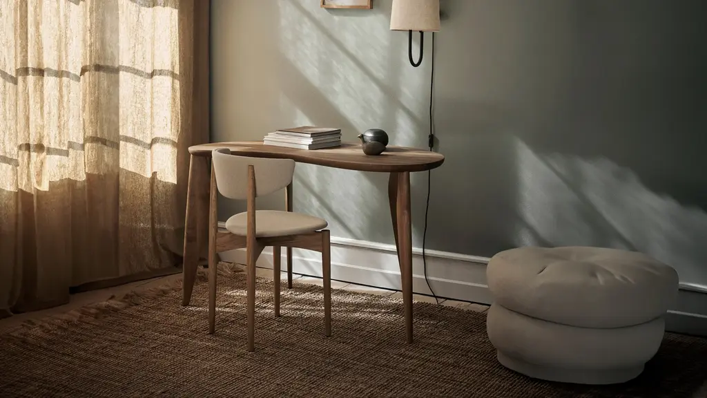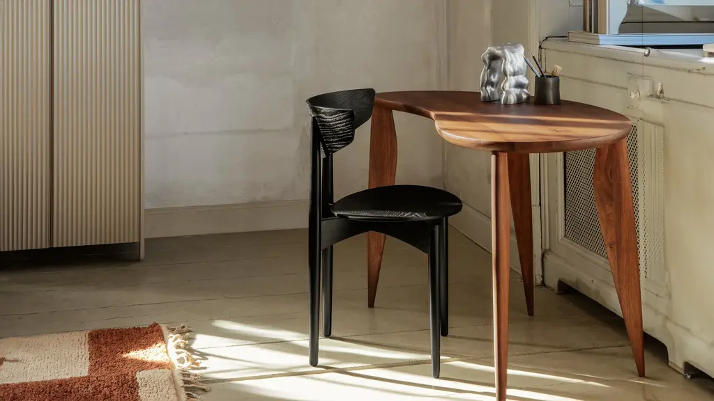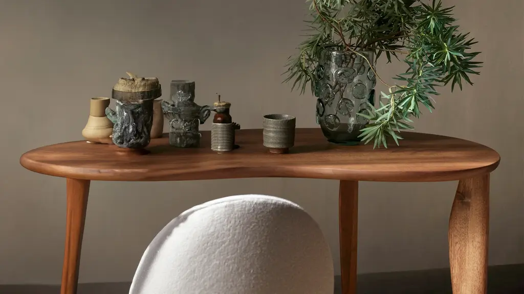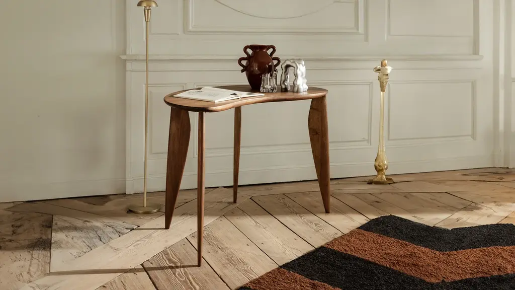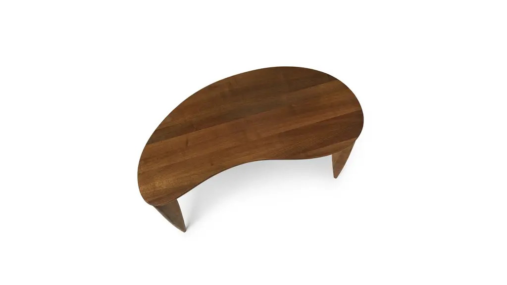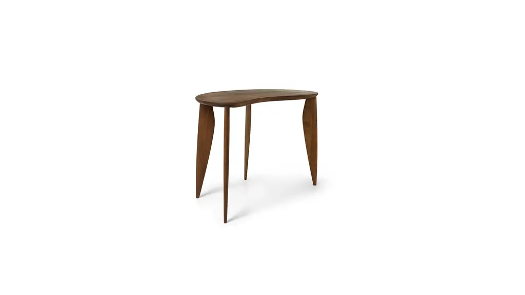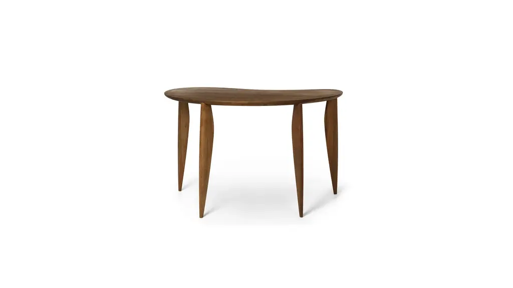 Made in solid FSC-certified European Walnut, the Feve Desk has an organic, delicate expression. As a reference to the distinctive shape, its name comes from the French word Fève, which means bean. The legs are carved into stretched elliptical shapes that emphasize the desks elegant, feminine silhouette and balance the design. The Feve Desk requires little space and can be used both as a desk, an entrance console, or a make-up table. Designed and produced by the Copenhagen-based studio Ferm Living.