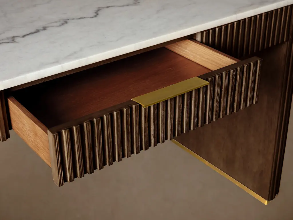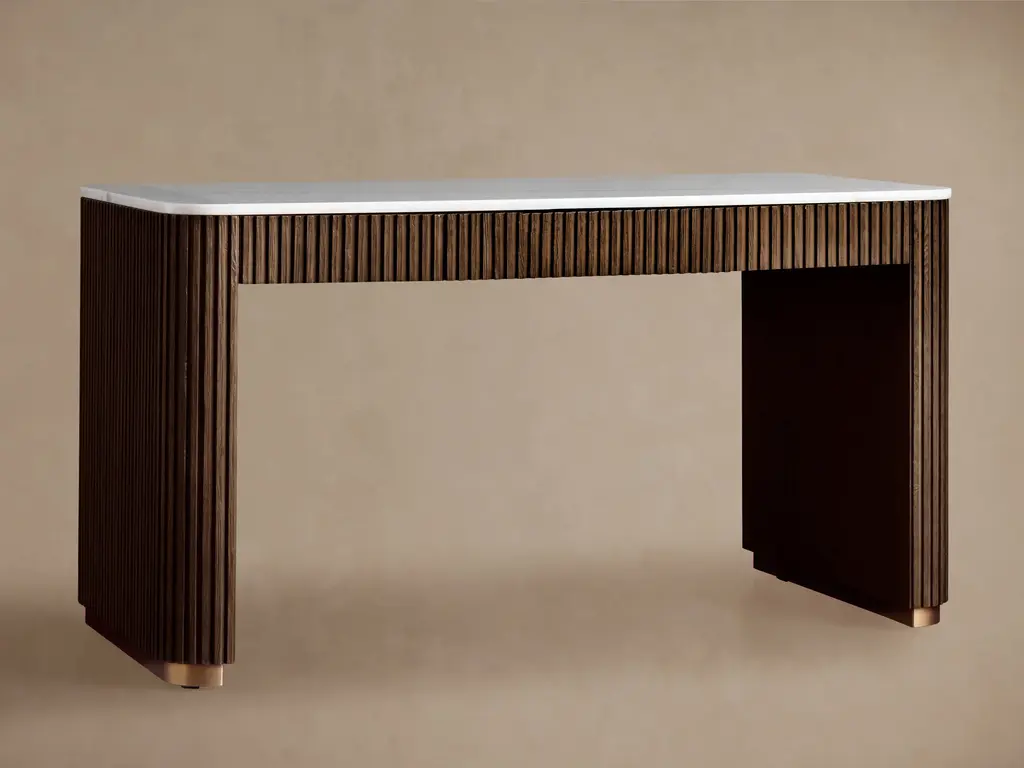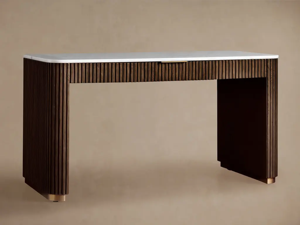 Our Finnley Writing Desk showcases a stunning mixed-material design that invites elevated style into any office space. Hand-finished pine from Finland or white oak wood is luxuriously complemented by stone tops, accented by zinc-alloy and reeded oak detailing. The result is an eclectic-yet-chic office collection that will inspire your most productive days.