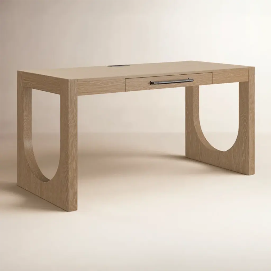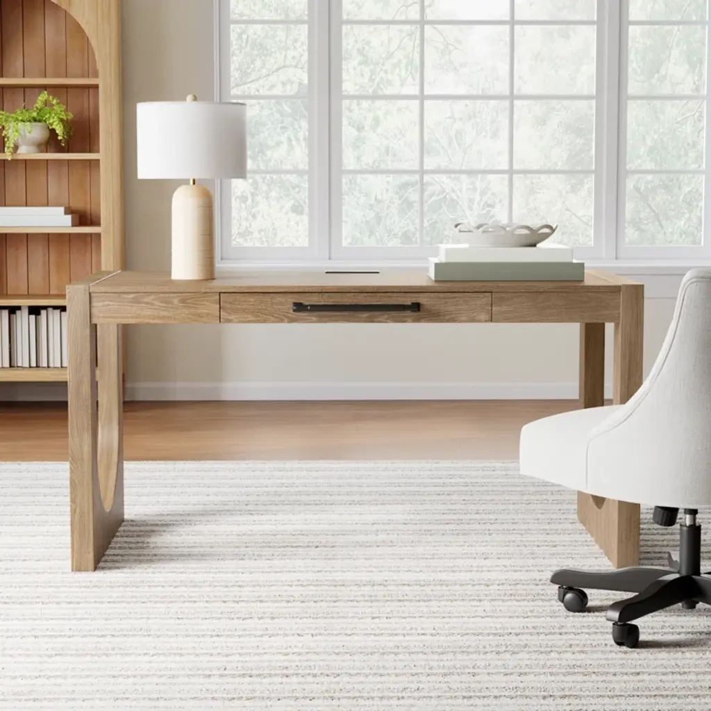 Introducing our collection meticulously crafted to elevate your workspace. Embracing a timeless aesthetic each piece boasts a natural oak finish delicately enhanced by a light glaze exuding sophistication and warmth. Featuring heavy bar pull hardware and bold U shapes on the desks and storage solutions that are sure to make a statement in any workspace.