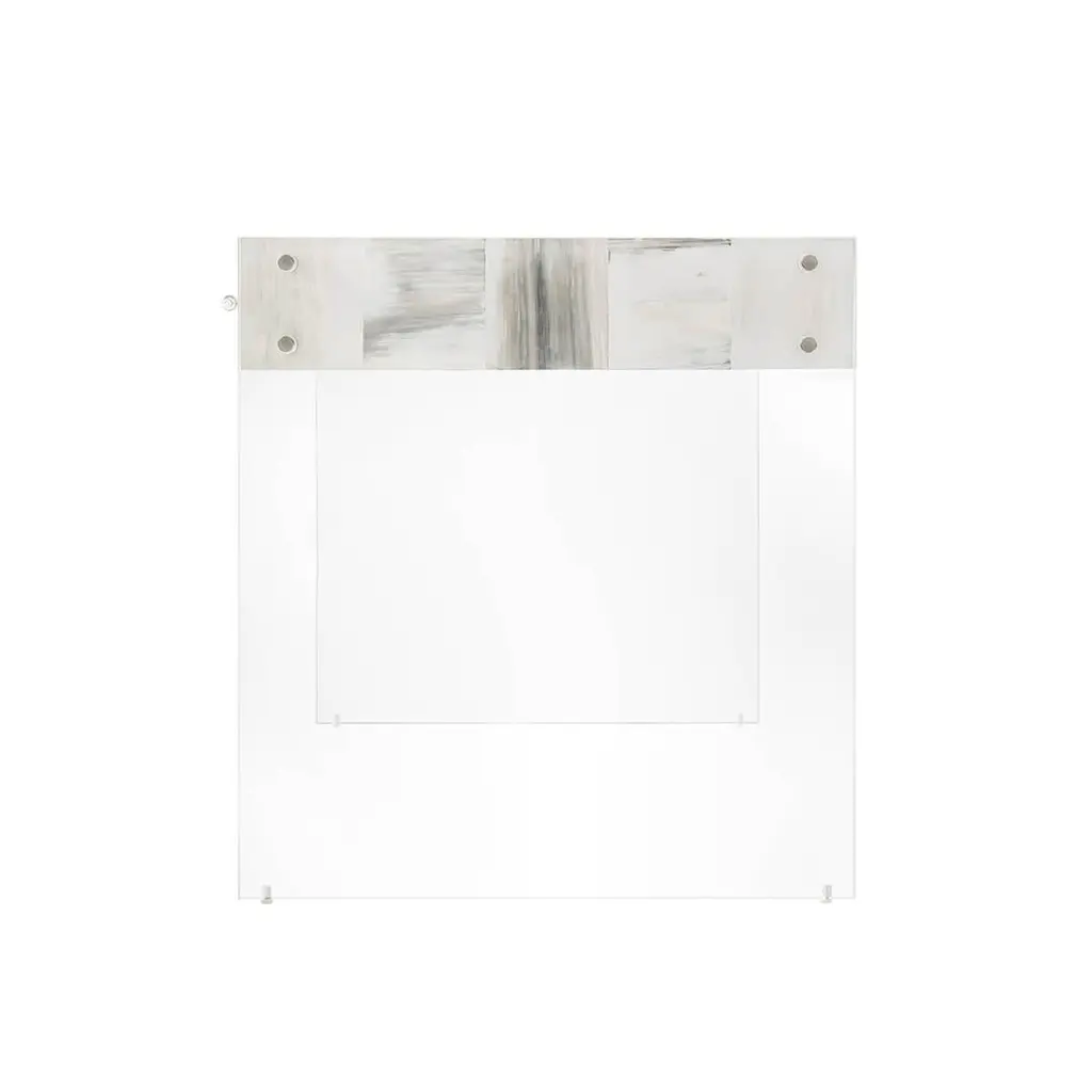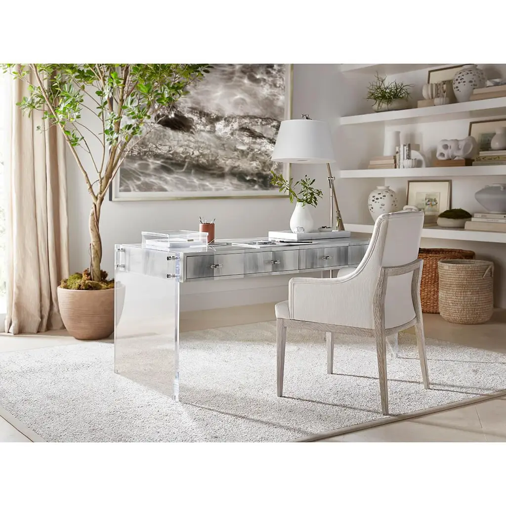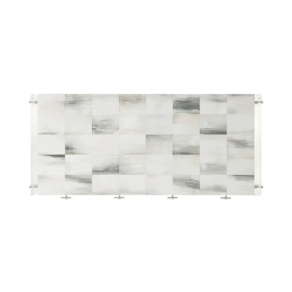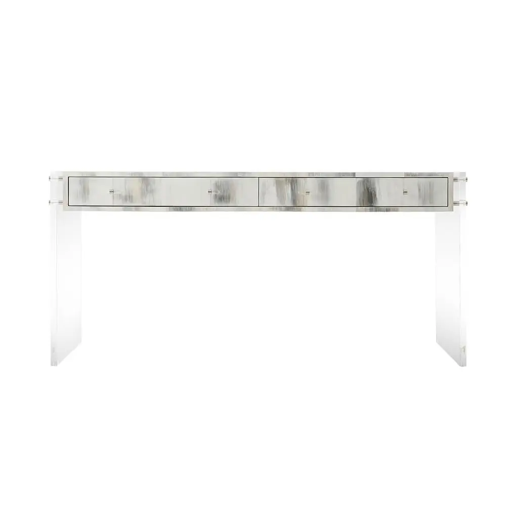 With a hand-painted faux horn tiled top with two frieze drawers. Acrylic baton pulls with stainless steel collars accent the acrylic end supports with stainless steel accents.Dimensions: 65" W x 28" D x 30" HClearance - 24"