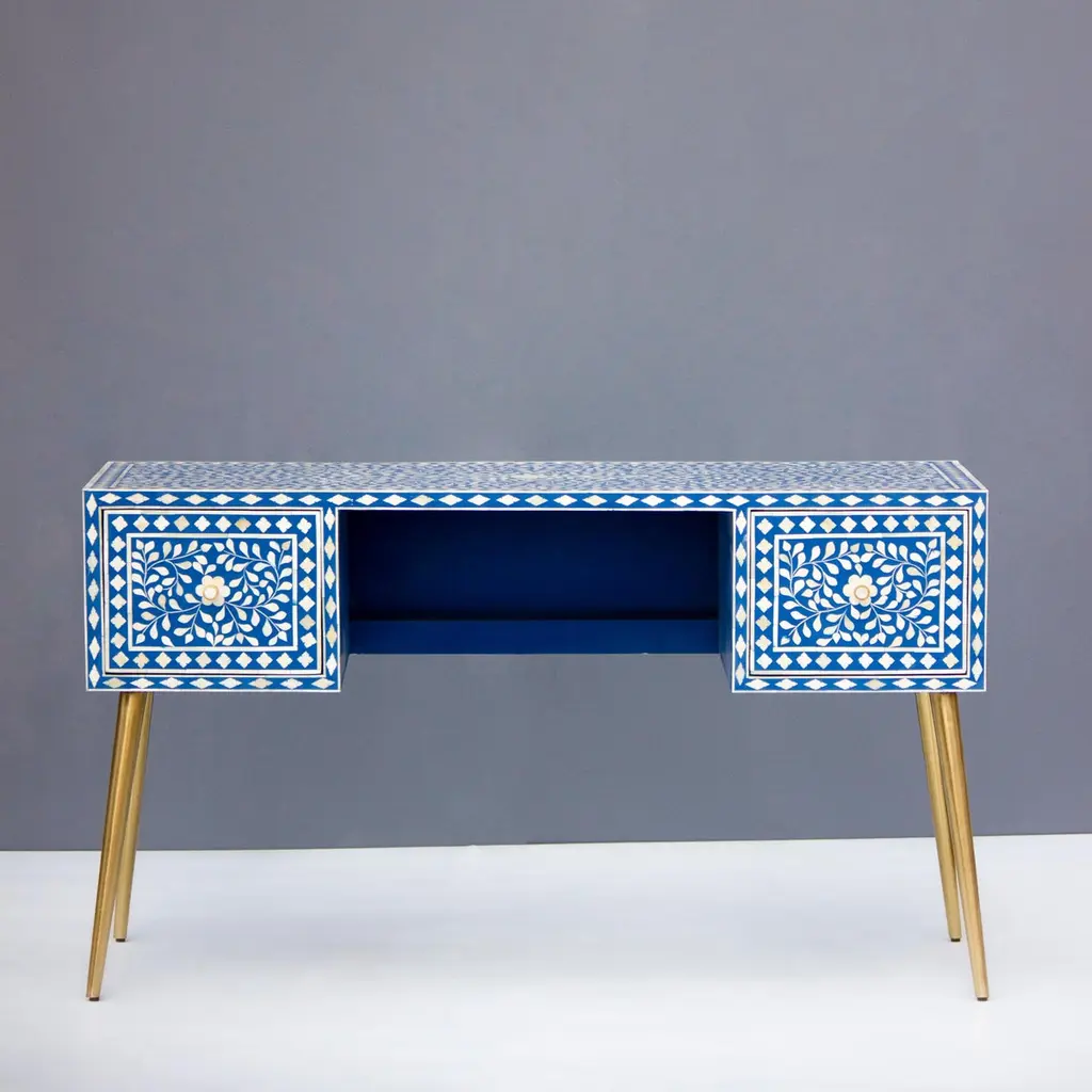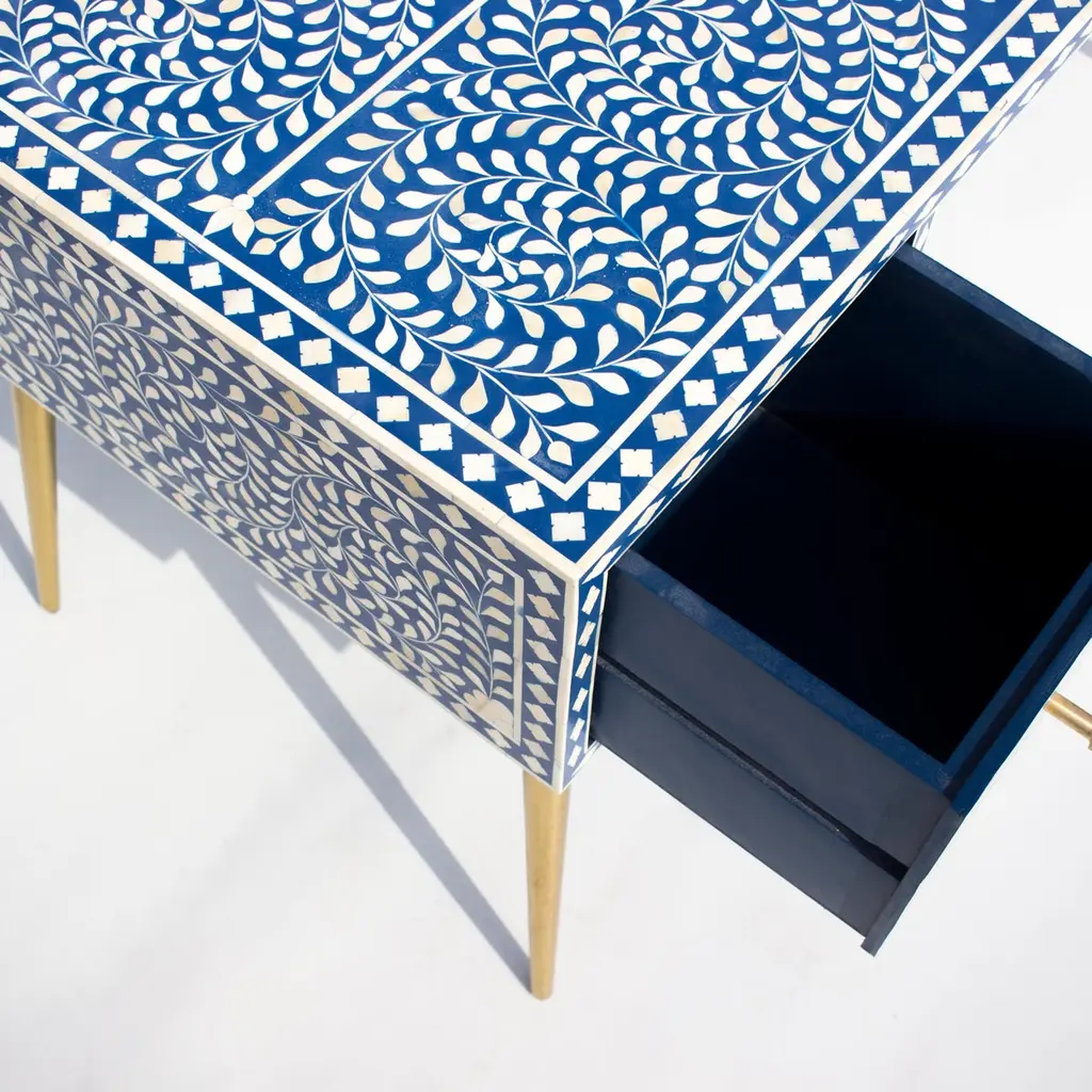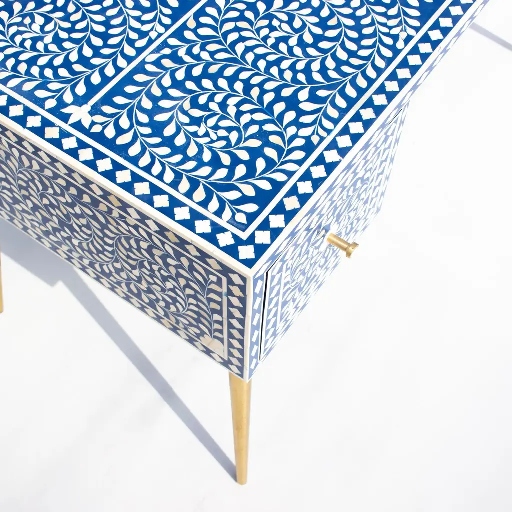 Elevate your home office or workspace with Artisanal's exquisite navy blue inlay desk—a stunning addition that seamlessly blends timeless craftsmanship with modern sophistication.Adorned with intricate spiral leaf and floral patterns, this desk showcases the artistry of traditional bone inlay, paying homage to the ancient art of decorated furniture. Finished with sleek brass-finish metal legs, the desk exudes modernity while retaining its classic allure.How It's Made:Handcrafted with meticulous care, each desk is a true masterpiece, created using a traditional inlay process. It features more than 2,000+ small pieces of bone, each carefully shaped into leaf or custom patterns. These pieces are precisely glued onto the surface to form the intricate design, followed by the application of color to enhance its beauty.Handcrafted in India by the artisans of ArtisanalFor added safety during transit, we pack the legs and knobs separately to ensure your desk arrives in pristine condition.Indulge in luxury and elevate your workspace with our bone inlay desk—a masterpiece that exudes elegance and sophistication, making it the perfect centrepiece for any home office or workspace.At Artisanal, our mission is to revive and preserve India's dying arts by blending age-old techniques with contemporary design. Every piece we create is a testament to this philosophy, merging the beauty of the past with the functionality and aesthetics of today.For the past six years, with a team of skilled artisans and innovative designers, we have crafted every item in-house to ensure the highest quality and attention to detail. Our timeless pieces are designed not only for the present but to be cherished and appreciated for years to come.