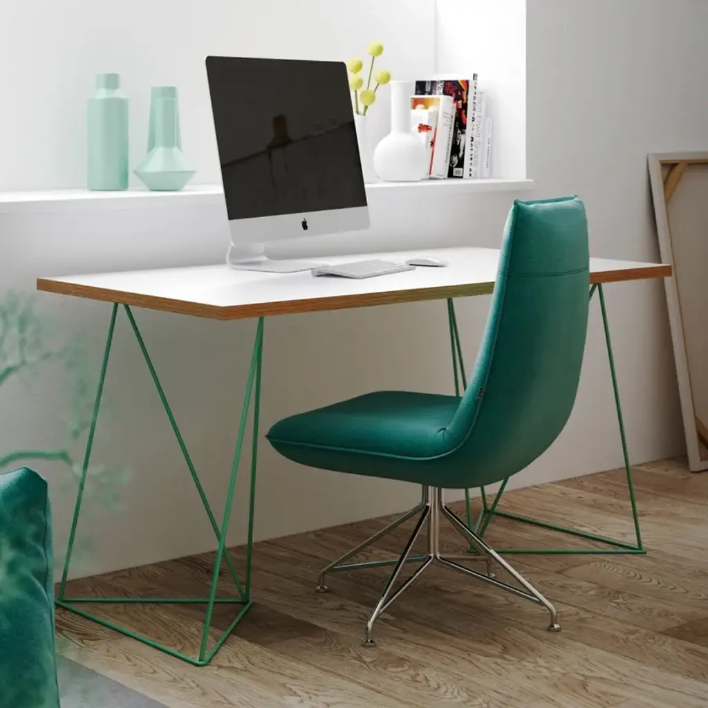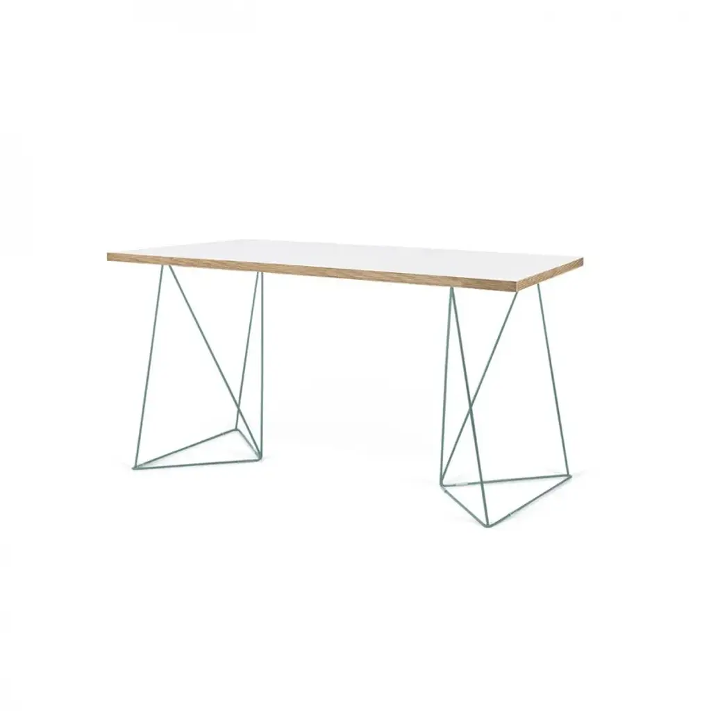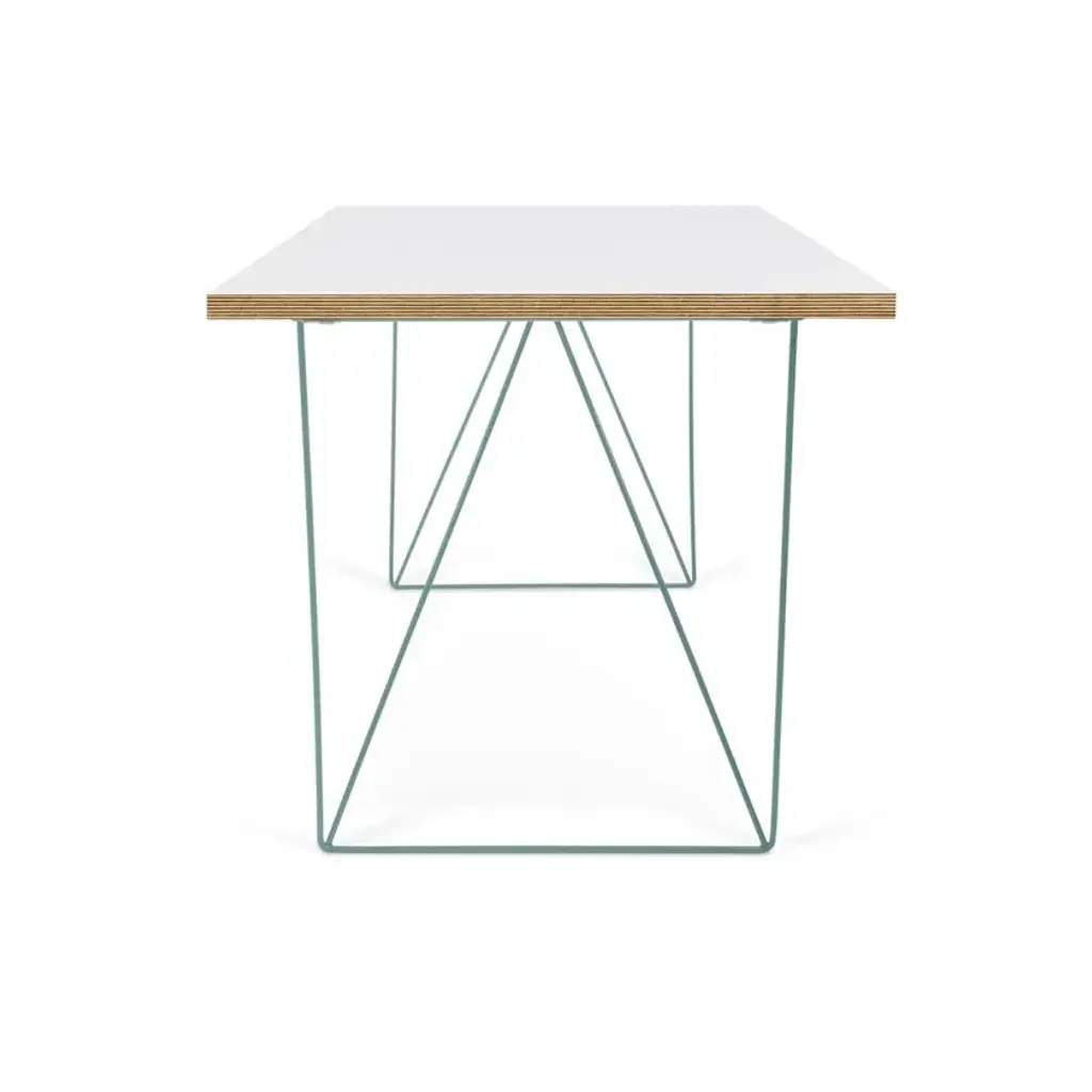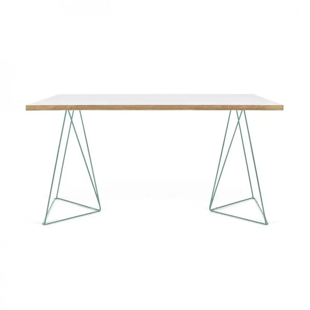 The Flow desk, similar the Multi desk with trestles, is scaled smaller for the home office with a resized top that is visually lighter. Available in two finishes, wild oak or pure white with plywood edges, there are two new colors available for the trestles - sea green or black.