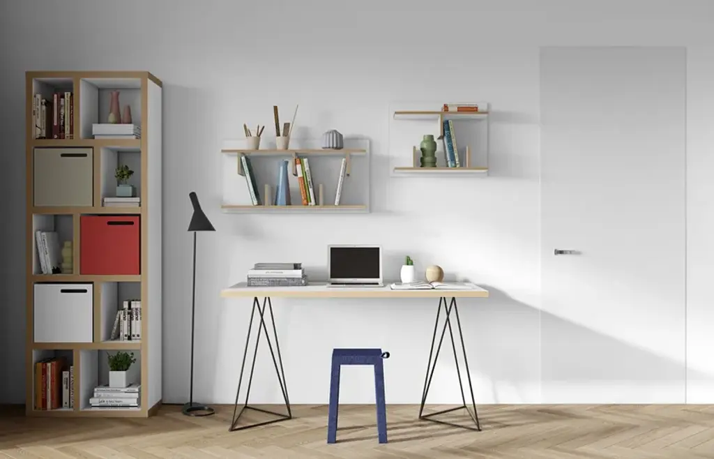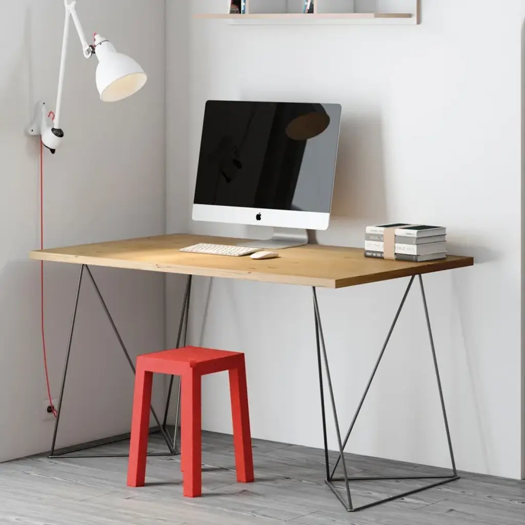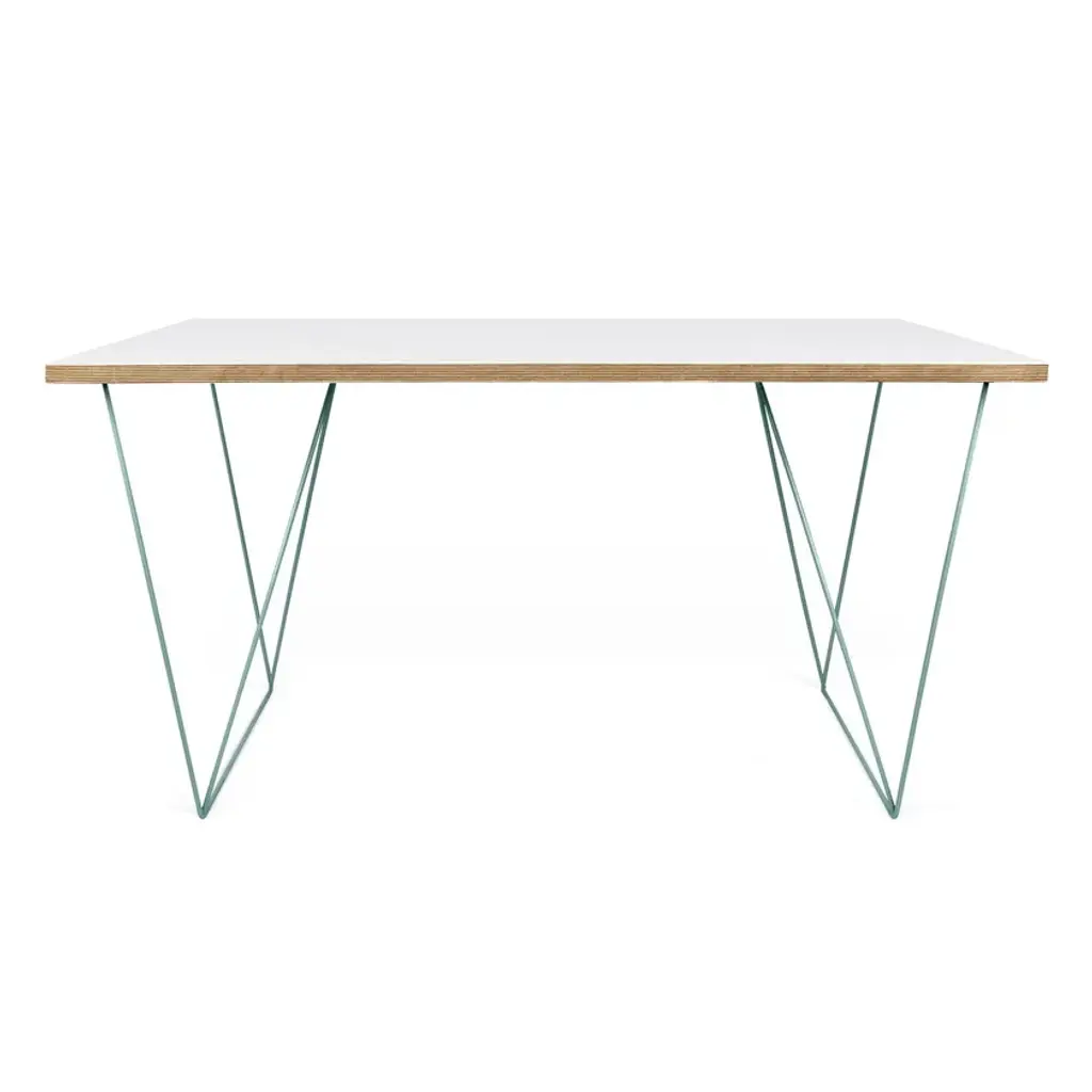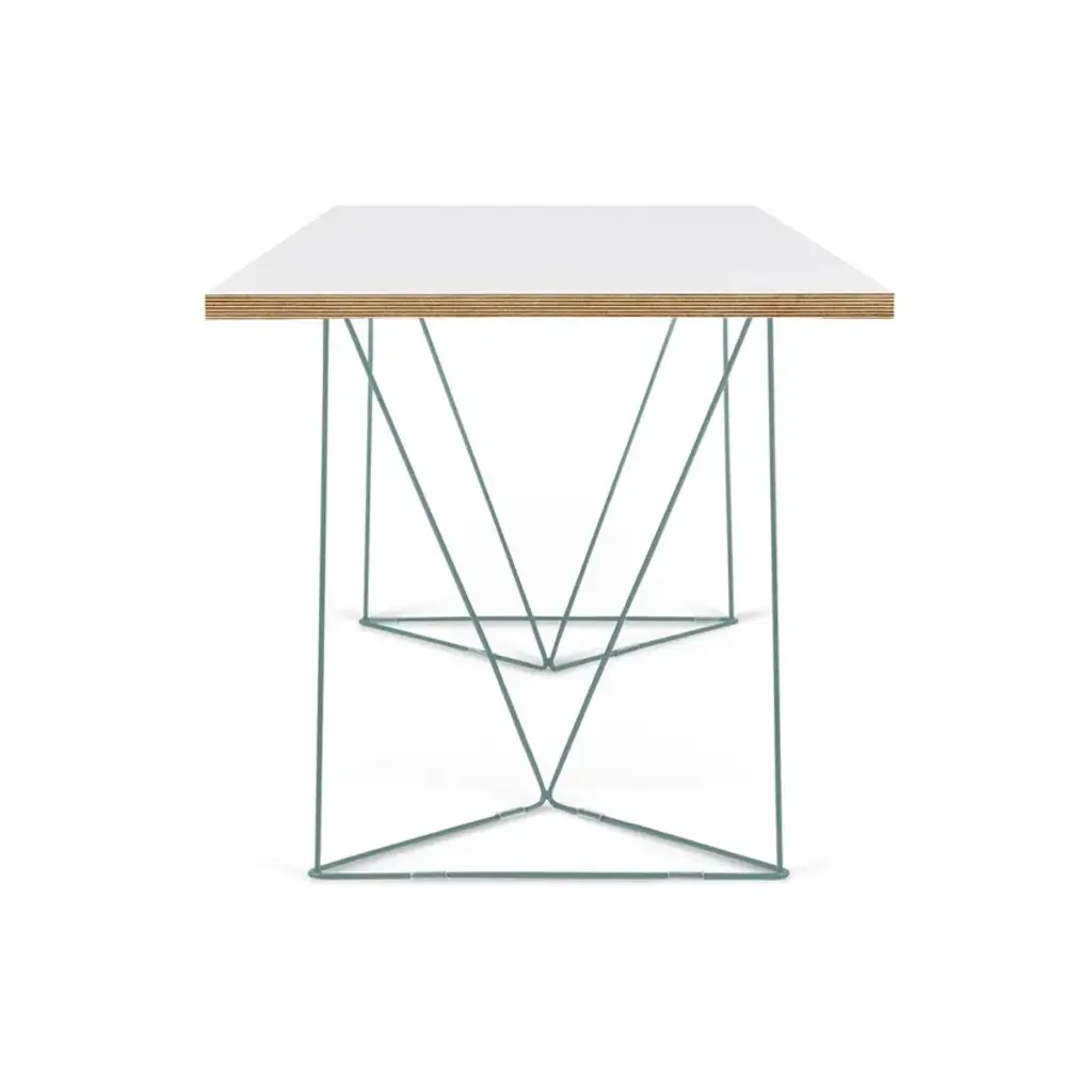 The Flow desk, similar the Multi desk with trestles, is scaled smaller for the home office with a resized top that is visually lighter. Available in two finishes, wild oak or pure white with plywood edges, there are two new colors available for the trestles - sea green or black.