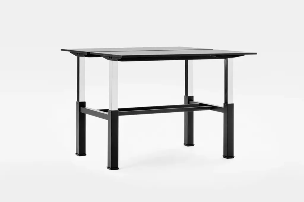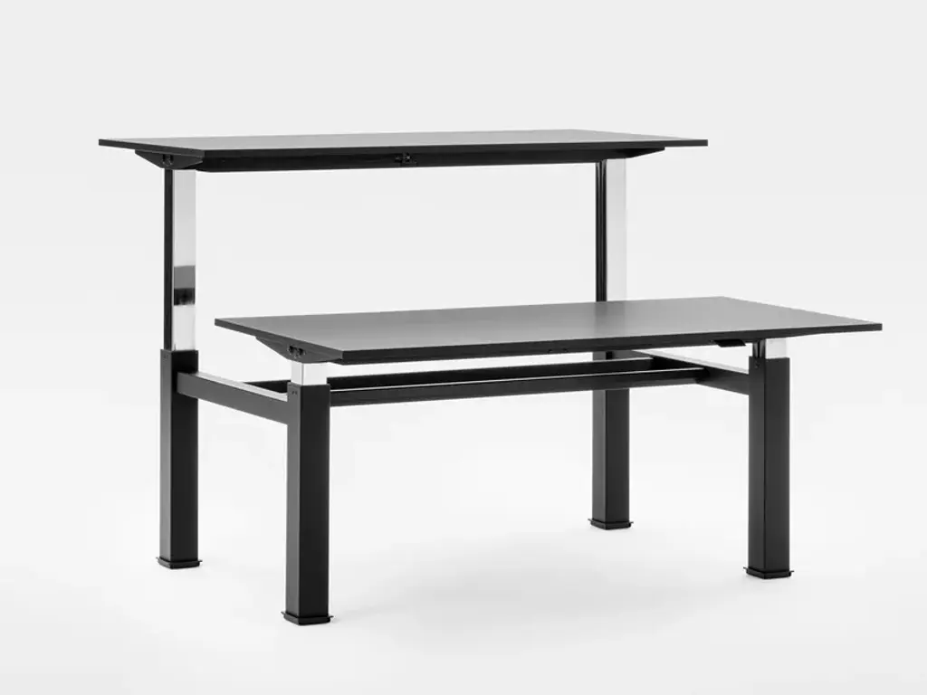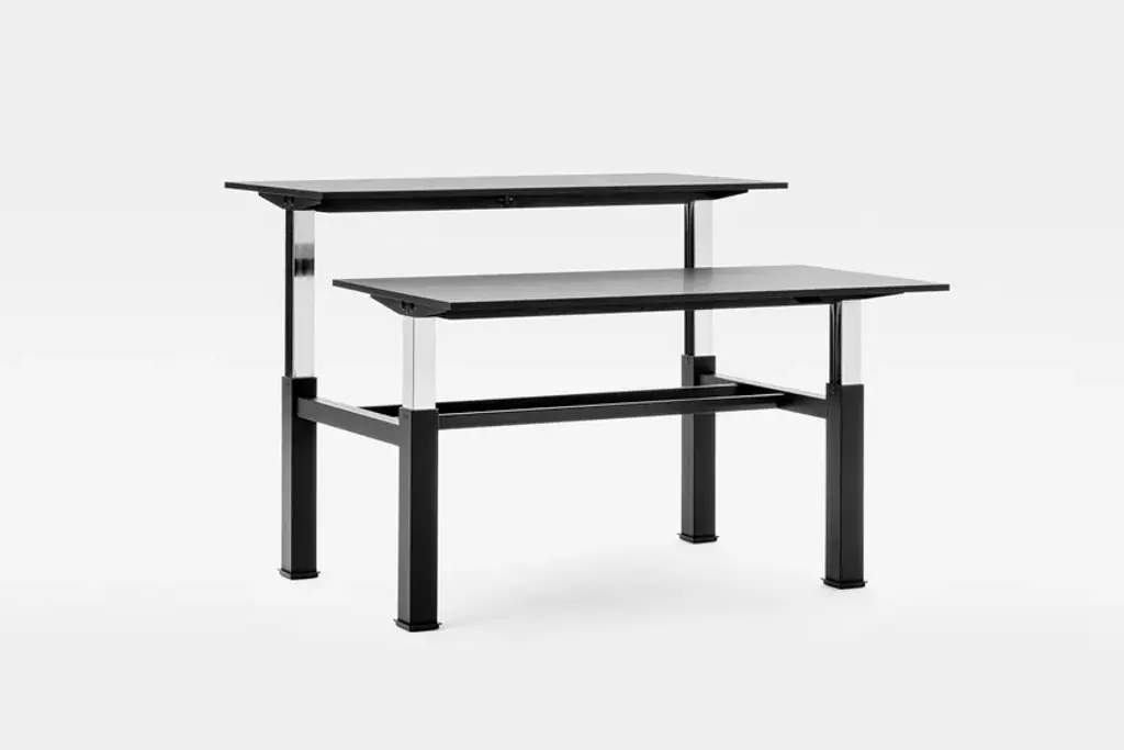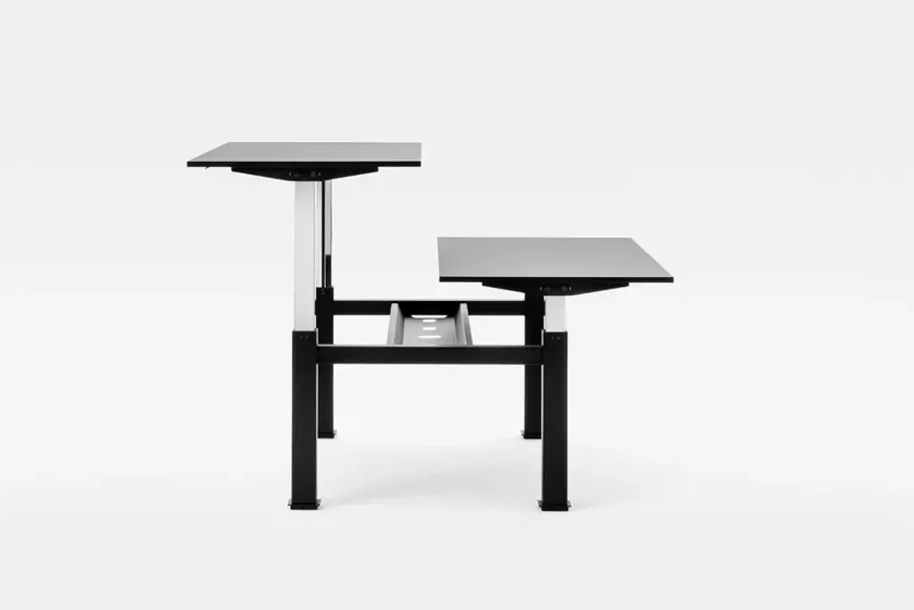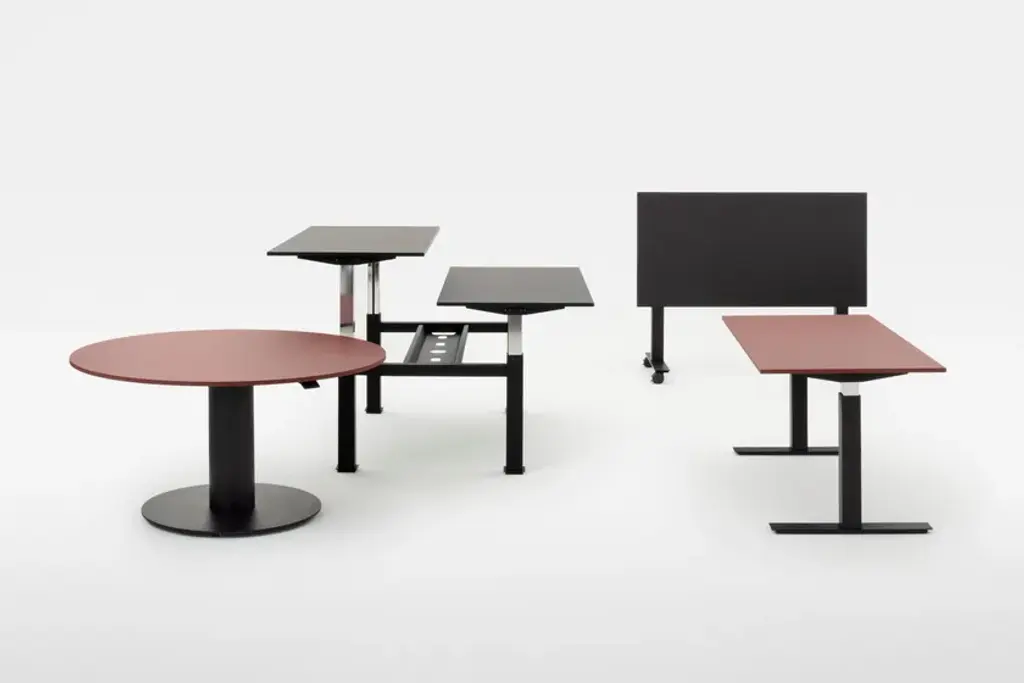 FOLLOW is height-adjustable table that effortlessly and noiselessly adjust to the user’s posture and need. Two desktops joined together by a single painted metal frame, each with a height adjustment handle in reinforced nylon. Available with multifunction unit for electrical wiring integrated in the top and with cable tray. A table that can be placed and moved anywhere: it is not connected to any cable as it does not need any electricity supply. Also available the sound absorbing partition panel able to create two autonomous but at the same time dynamic work spaces. The Follow tables collection it was acknowledged for its uniqueness and technological excellence by the European Union's research and innovation program H2020.The table frame (1140x980 mm for 299B Small - 1540x980 mm for 299B Large) is designed for optimal operation within a weight range (tabletop weight + accessory weight) between 23 and 31 kg per workstation/top for 299B Small, and between 30 and 38 kg for 299B Large.A load on the frame exceeding the maximum weight indicated (tabletop weight + accessory weight) causes a rapid lowering of the top when unlocked.A load on the frame below the minimum weight indicated (tabletop weight + accessory weight) causes a rapid raising of the top when unlocked.If a lighter tabletop is used or the workstation is not loaded, the installation of the "counter-balance kit" accessory (code 299FZ) can reduce the upward force by 1.2 to 9.6 kg, allowing the optimal operating range to be achieved.If a heavier tabletop is installed or if the workstation is further loaded (computer, phone, etc.), the upward force can be increased by 1.2 to 7.2 kg by removing six pre-mounted counterweights from the crossbeam.