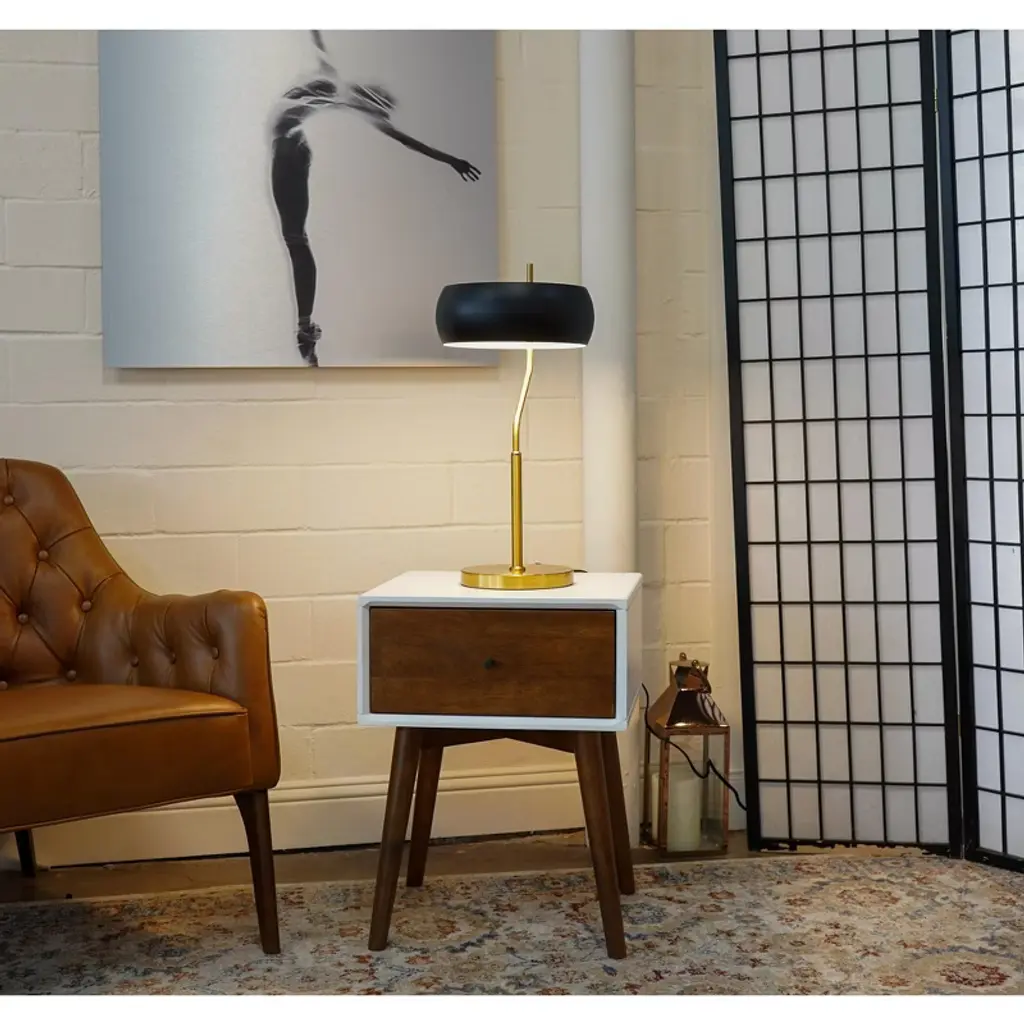 ·Gold Metal Base: Provides a luxurious and stable foundation, adding a touch of opulence to the overall design. ·Shade Design: Color: Black outer shade with a white inner lining for a dramatic contrast. Shape: Drum-shaped shade, offering a classic and versatile aesthetic. ·Switch and Cord: Switch Type: In-line switch for easy operation. ·Power Cord Color: Black, blending seamlessly with most decors. ·Ceramic Fixture: Ensures durability and adds sophistication. ·Bulb Base:E26/Medium (Standard) ·Minimum Voltage Required:110~120V ·Fitter Type:Threaded UNO ·Measures 11'' W x 11'' D x 22'' H with a 70.86'' power cord
