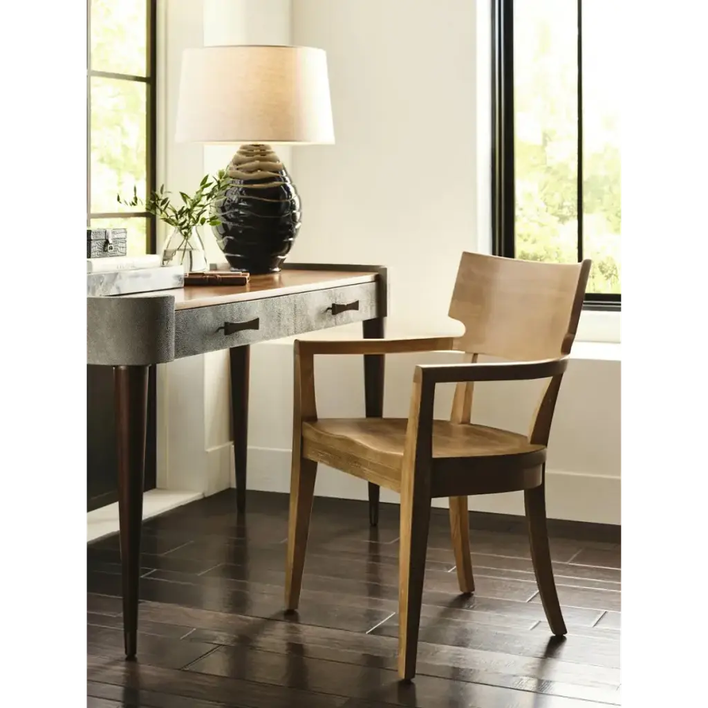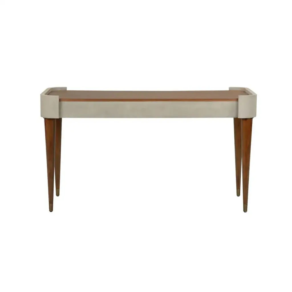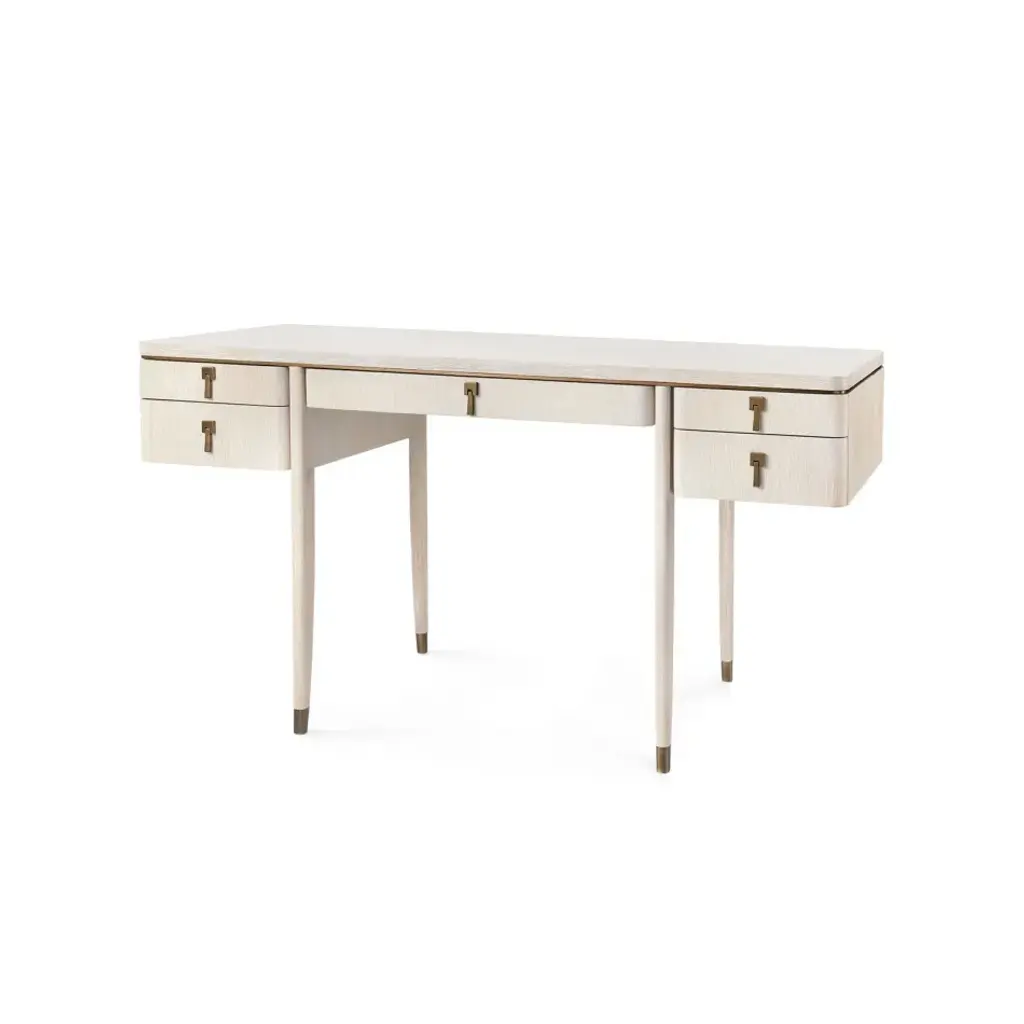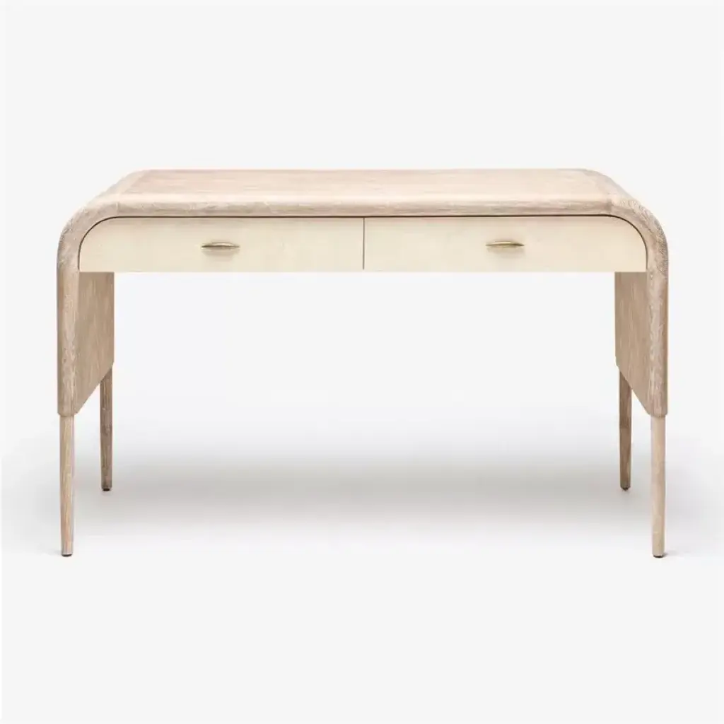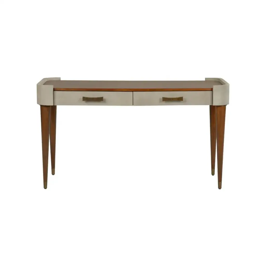 The Frances Writing Desk brings the elegance of the Jazz Age into your modern space, merging vintage charm with contemporary craftsmanship. Its striking design features a luxurious combination of creamy gray shagreen surrounding the frame, paired with a rich walnut top, creating a sophisticated contrast in both texture and tone. The desk is adorned with bow tie-inspired antique brass drawer pulls, adding a subtle nod to the era's refined style. Slender tapered legs, capped with brass accents, further enhance the desk's sleek, retro silhouette. Perfect for any workspace or study, this desk offers both functionality and timeless elegance, making it an exquisite centerpiece in any room.