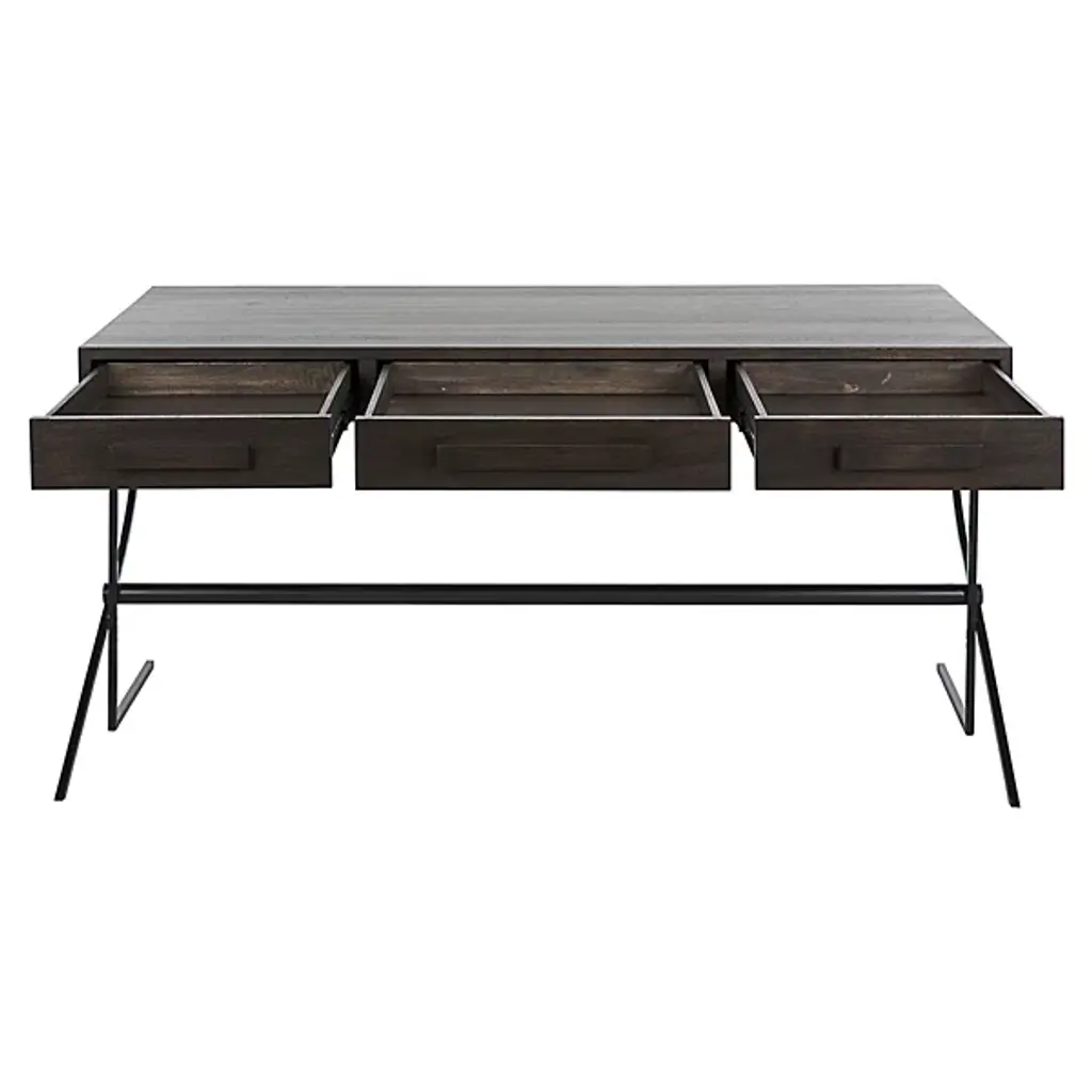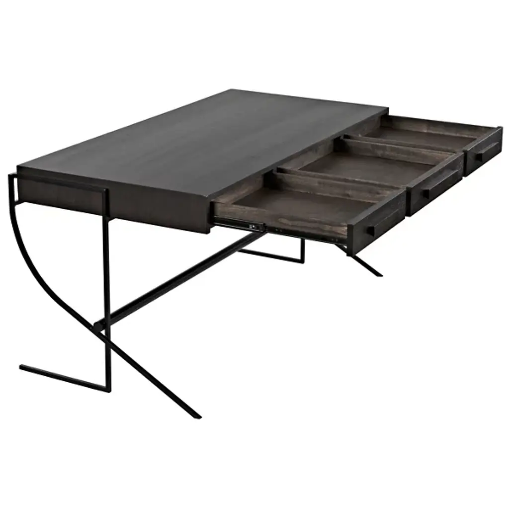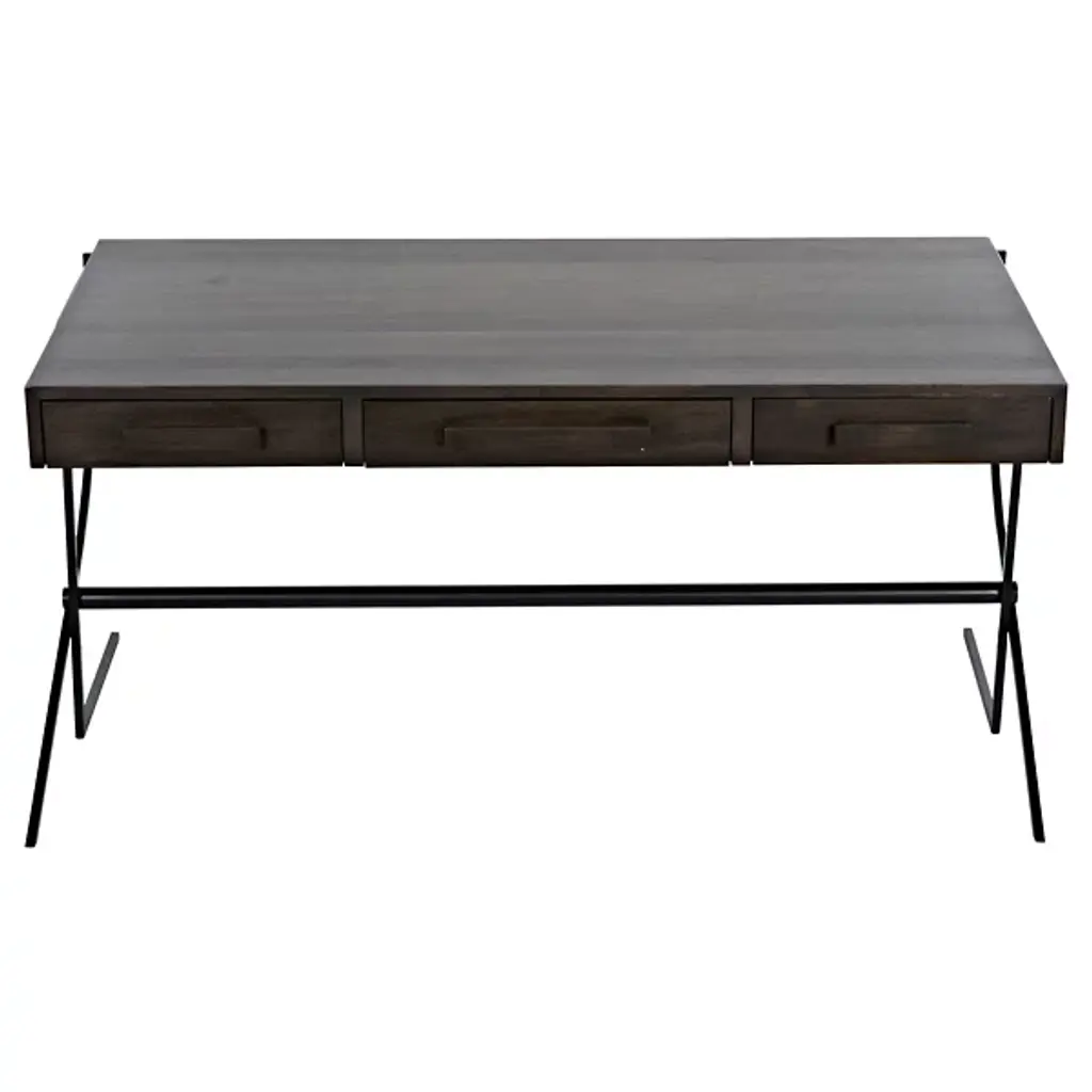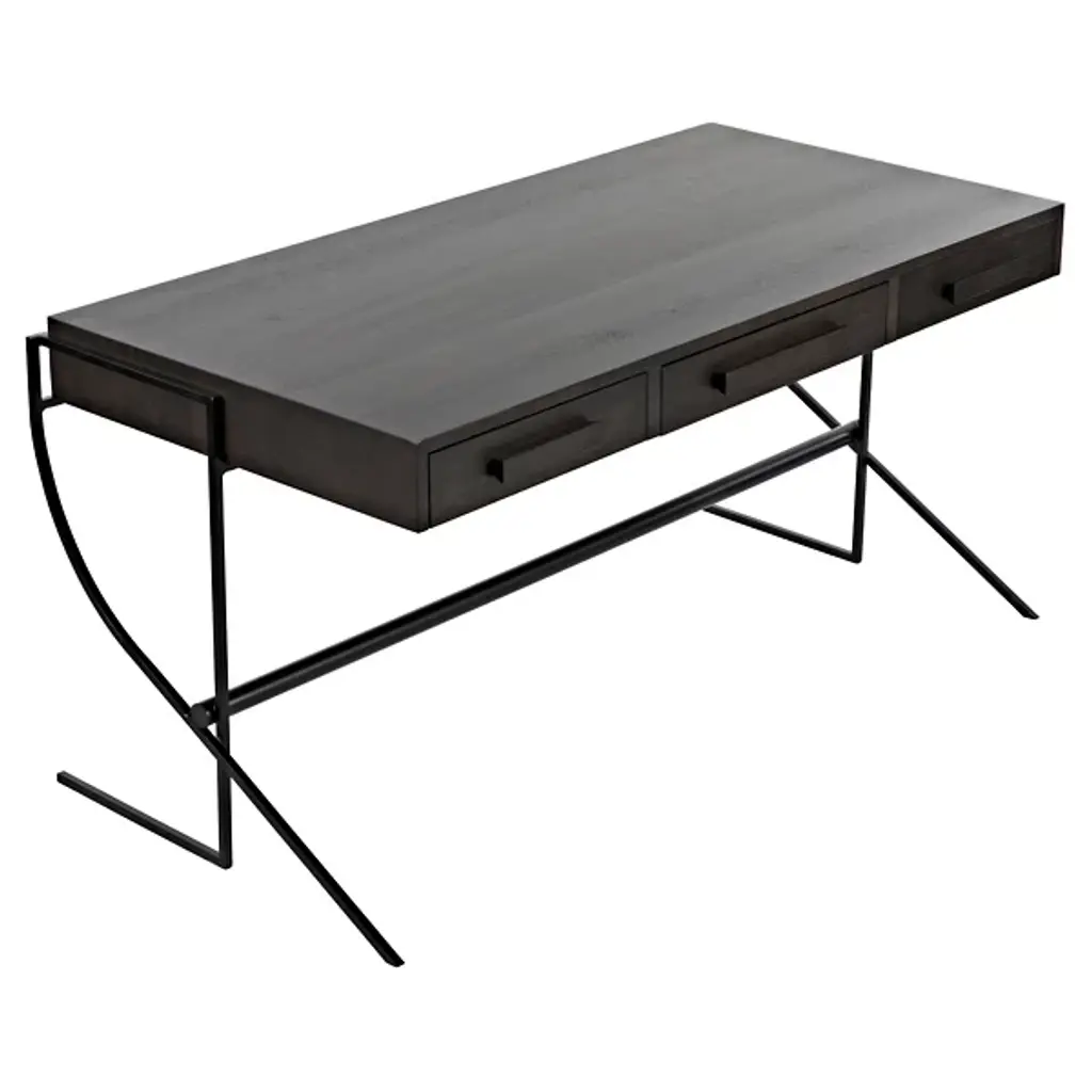 The Frank Desk from Noir creates visual harmony through the blend of warm walnut grain and crisp black steel lines. The rich wood veneer displays natural figuring across the desktop and drawer fronts, while the geometric steel frame provides clean contrast beneath. Three drawers span the width in a perfect symmetrical arrangement, each fitted with metal pulls that echo the base construction. The open space beneath the work surface maintains airiness, while the steel framework ensures structural integrity in the workspace furniture.