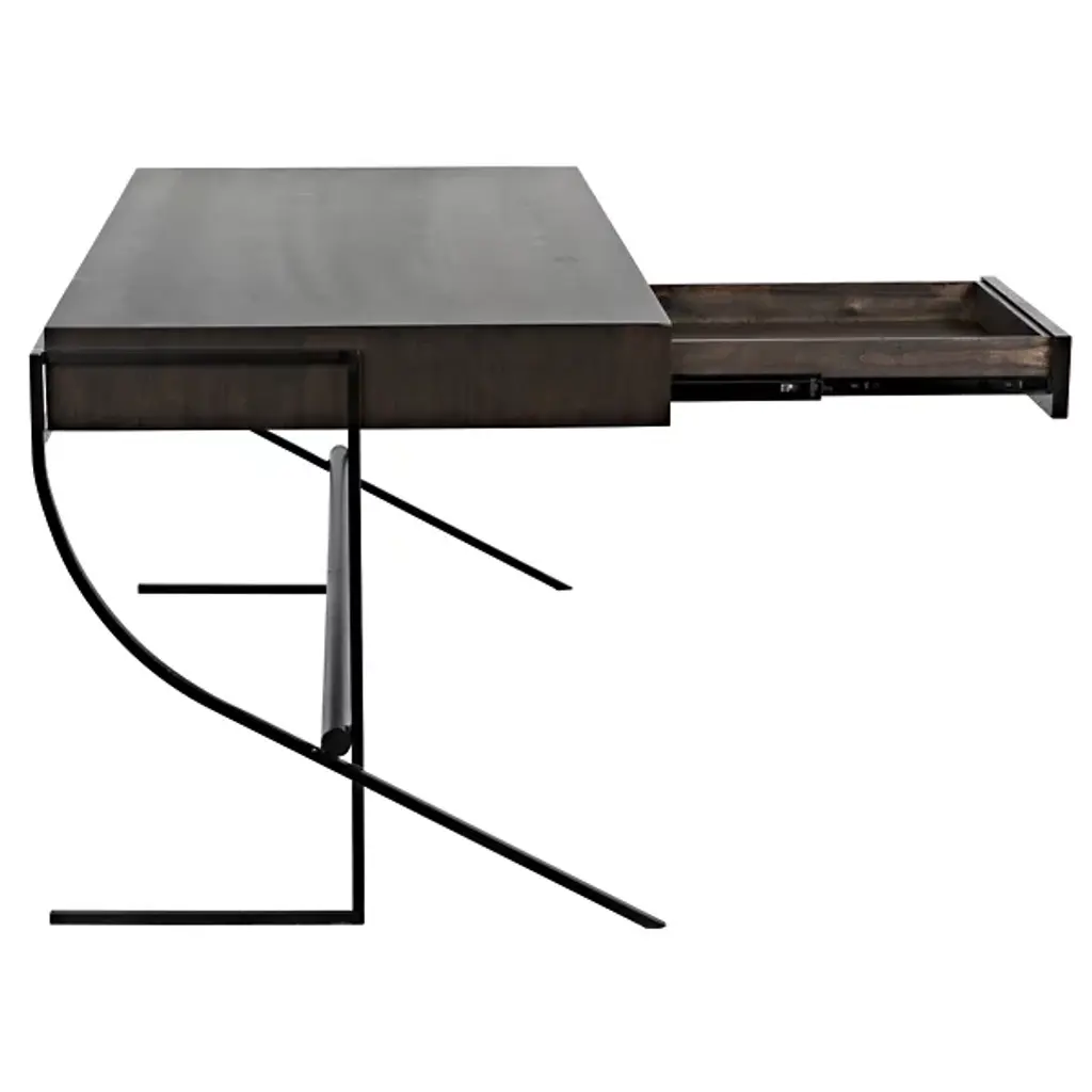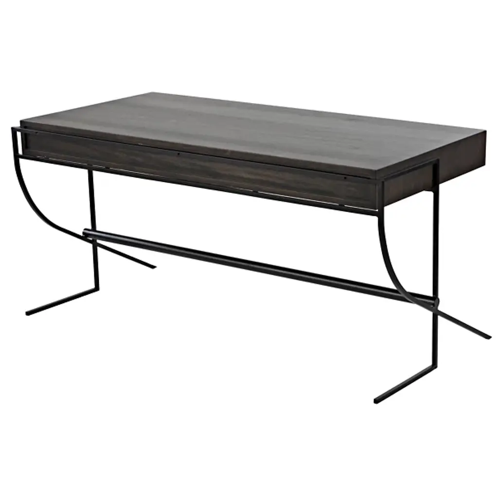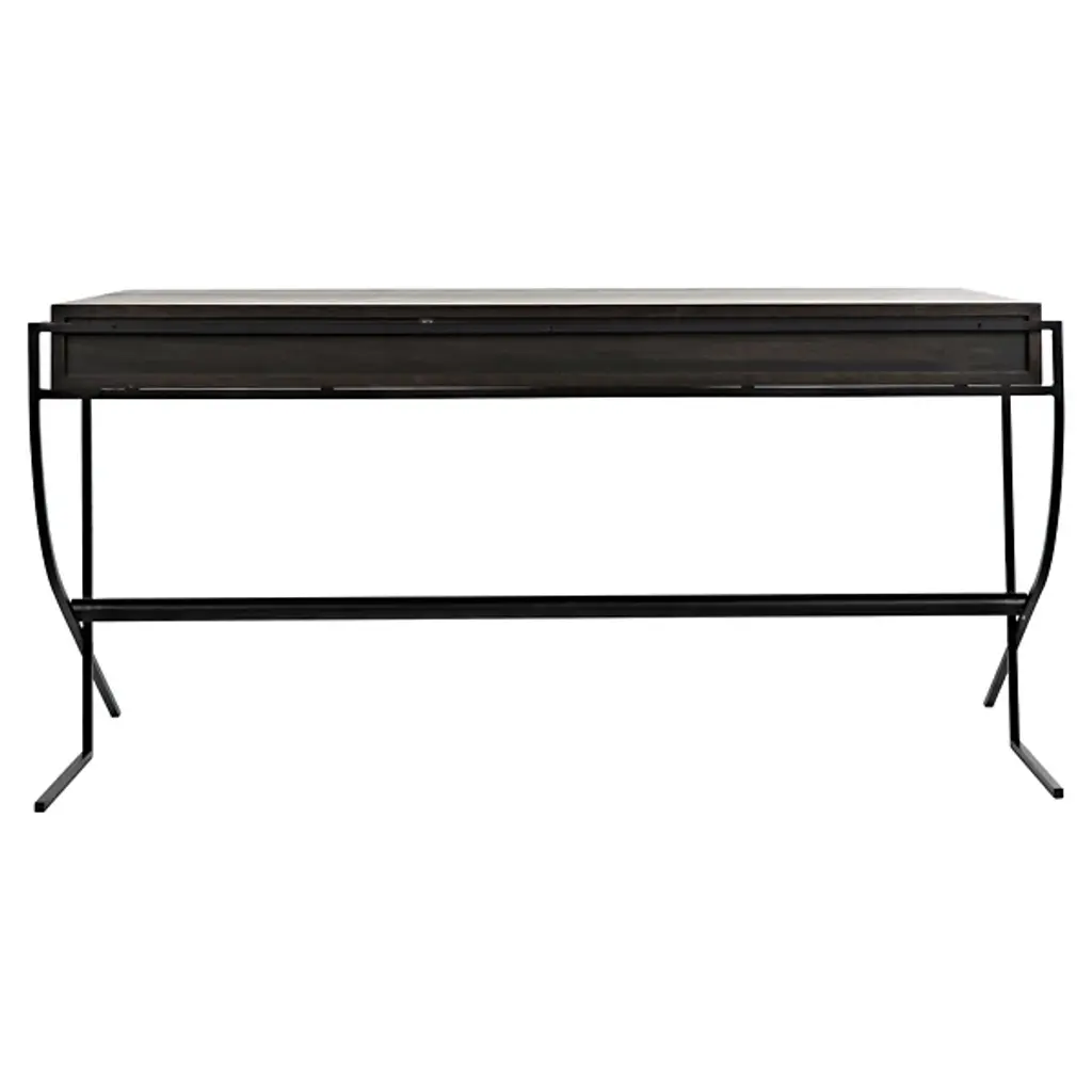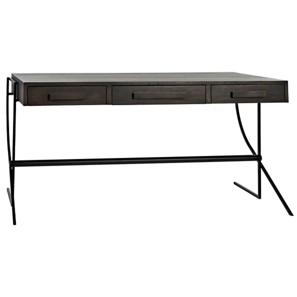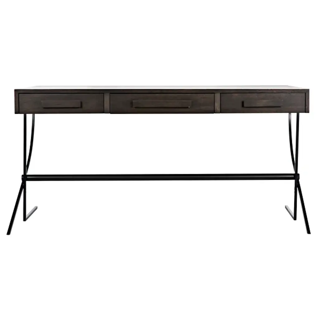 The Frank Desk from Noir creates visual harmony through the blend of warm walnut grain and crisp black steel lines. The rich wood veneer displays natural figuring across the desktop and drawer fronts, while the geometric steel frame provides clean contrast beneath. Three drawers span the width in a perfect symmetrical arrangement, each fitted with metal pulls that echo the base construction. The open space beneath the work surface maintains airiness, while the steel framework ensures structural integrity in the workspace furniture.