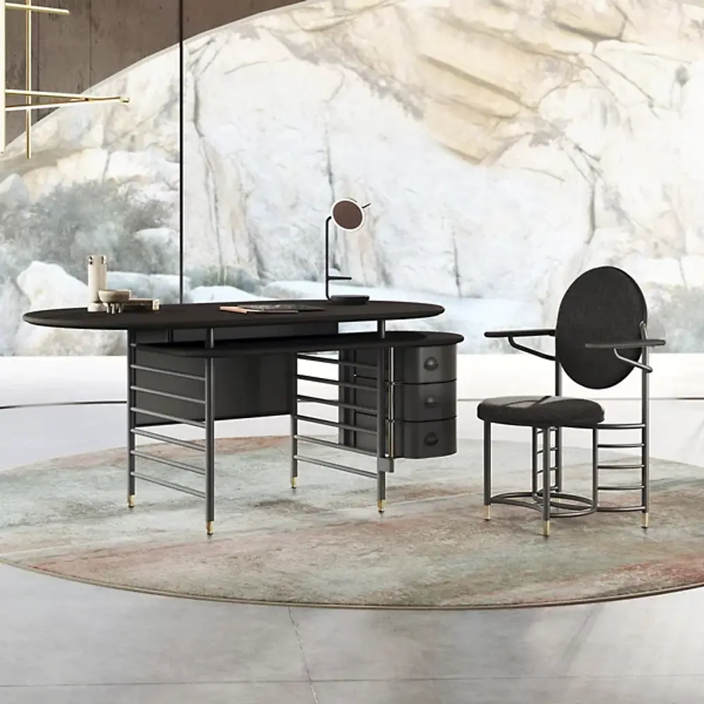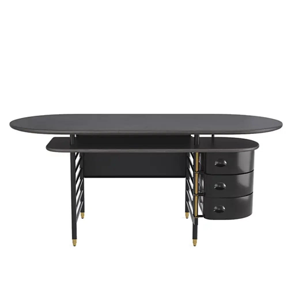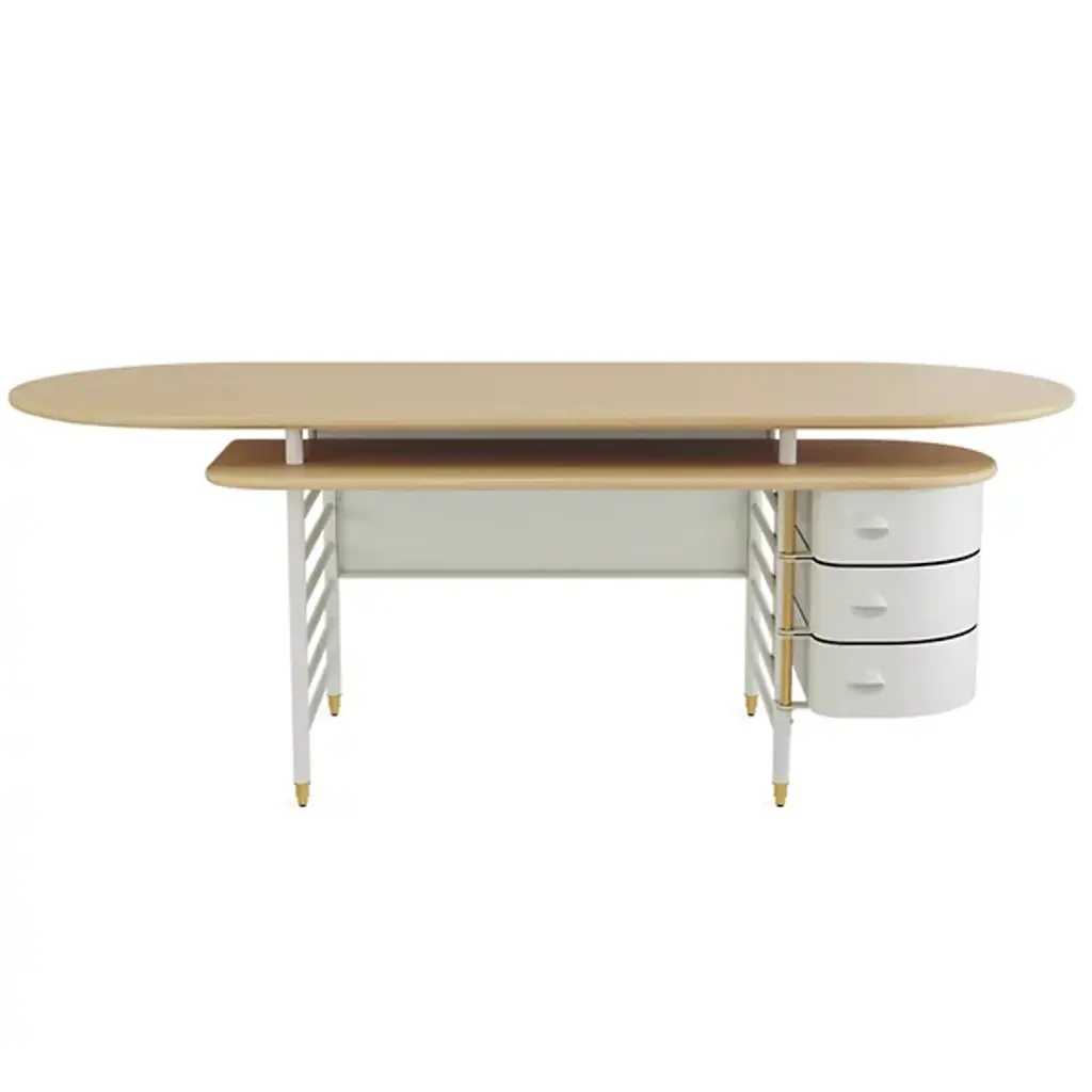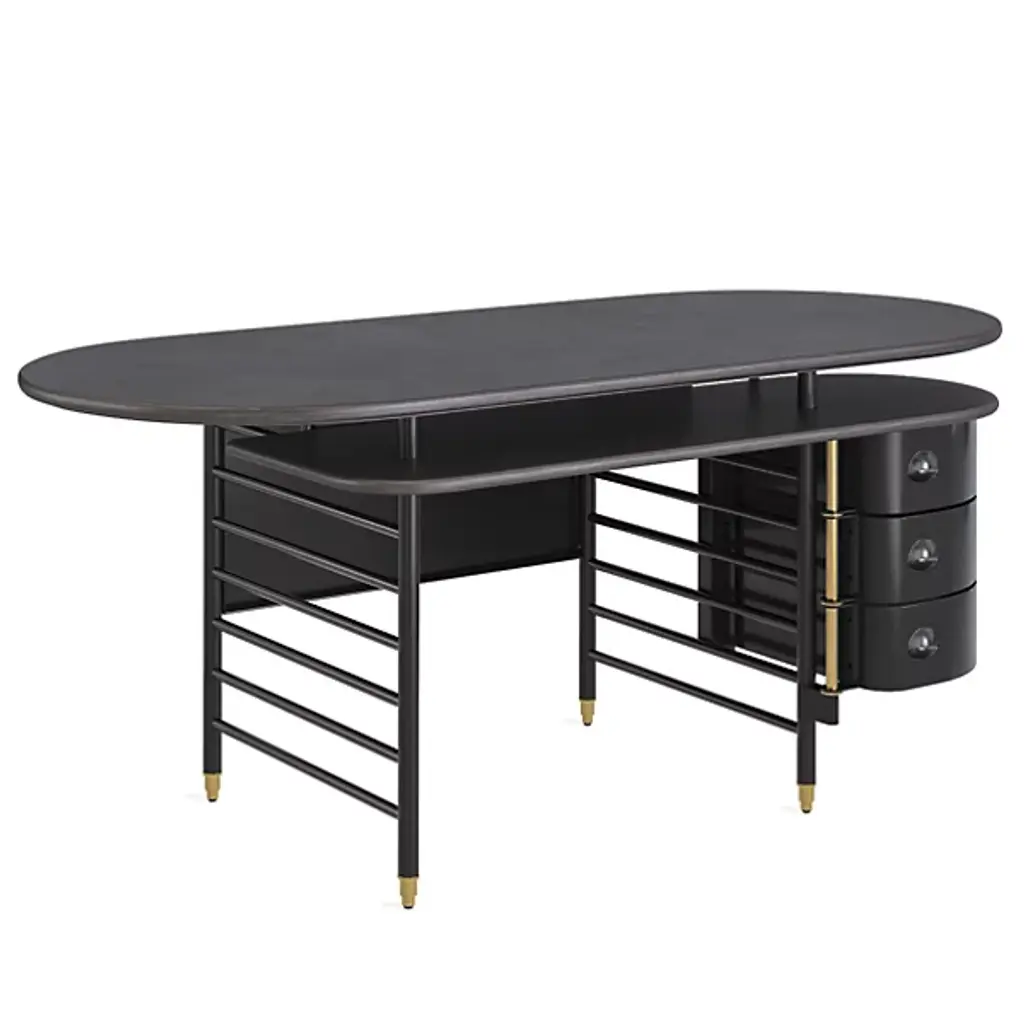 The Frank Lloyd Wright Racine Desk with Storage from Steelcase reimagines the furniture designs of the iconic architect with today’s storage, work, and comfort-setting needs. This piece references Frank Lloyd Wright’s 1939 pieces for the SC Johnson building in Racine, Wisconsin. The desk offers subtle changes like a secondary surface for storage or keyboards. This surface and the oval tabletop feature a solid wood construction that reminds one of Wright’s love of nature. The desk’s ladder-like base is designed for hanging elements like the handsome drawers on the side.