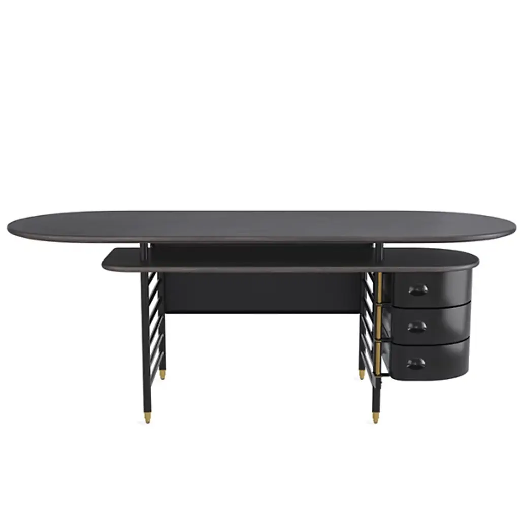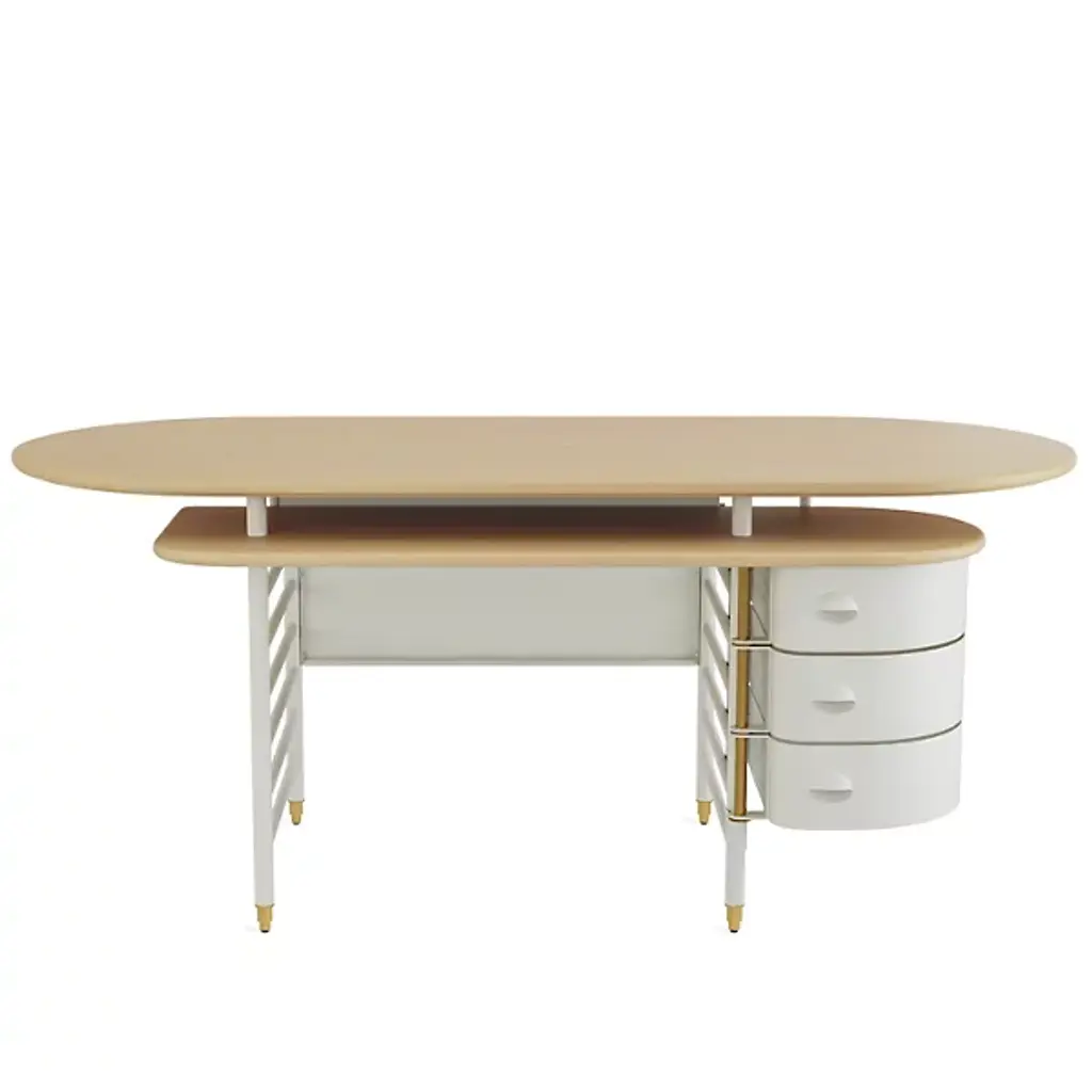 The Frank Lloyd Wright Racine Desk with Storage from Steelcase reimagines the furniture designs of the iconic architect with today’s storage, work, and comfort-setting needs. This piece references Frank Lloyd Wright’s 1939 pieces for the SC Johnson building in Racine, Wisconsin. The desk offers subtle changes like a secondary surface for storage or keyboards. This surface and the oval tabletop feature a solid wood construction that reminds one of Wright’s love of nature. The desk’s ladder-like base is designed for hanging elements like the handsome drawers on the side.