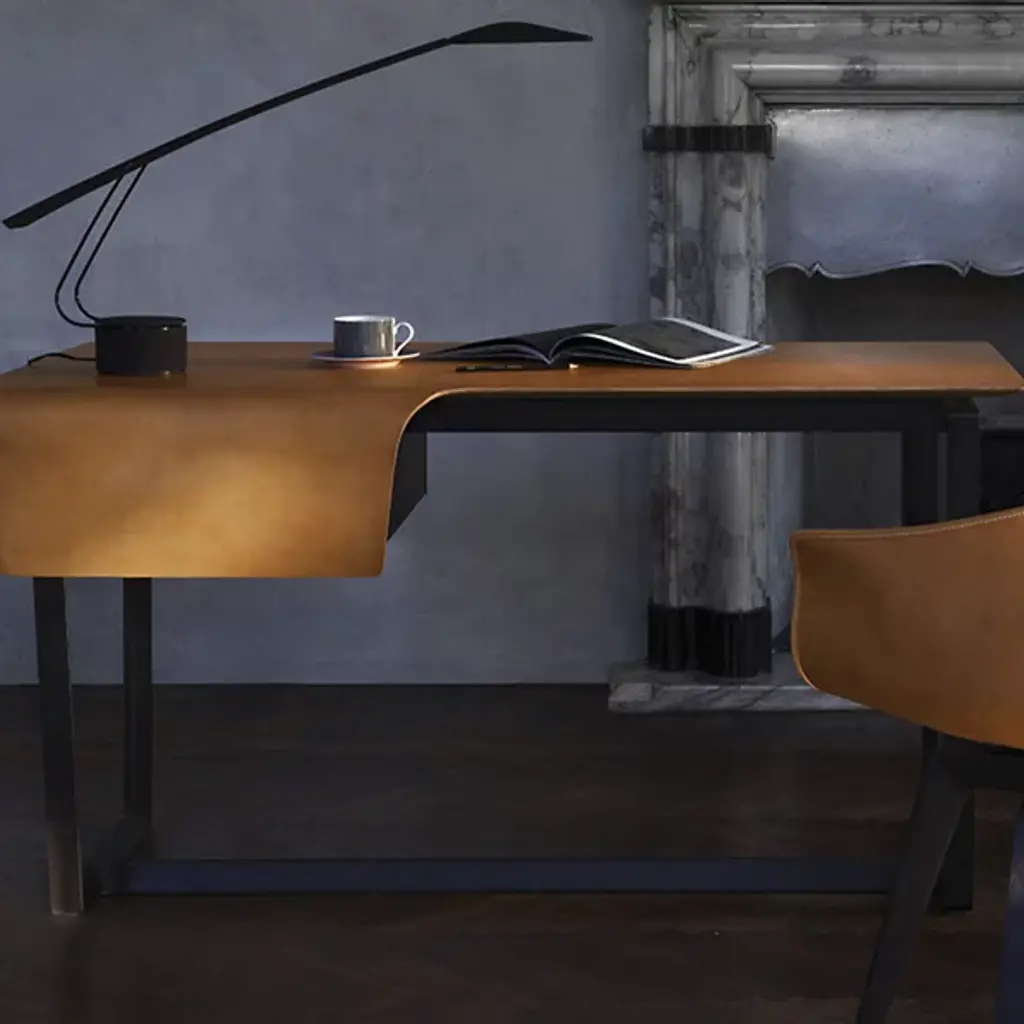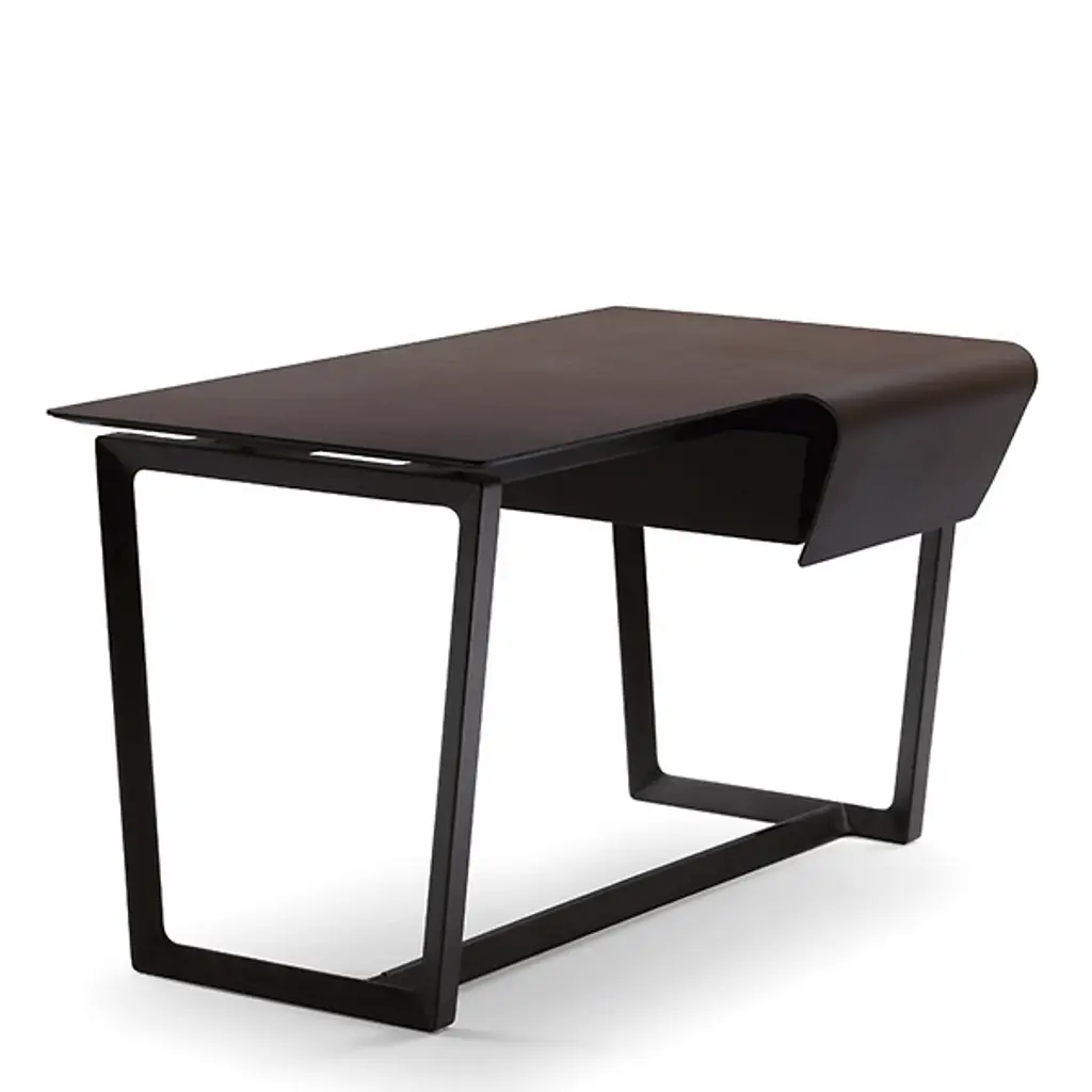 An unforgettable intersection of light and gorgeous geometry, the Fred Desk from Poltrona Frau adds impact to its surroundings with unforgettable intricacy. A Roberto Lazzeroni design made in Italy. It ascends from trapezoidal, solid ash sides joined by a single crossbar. All of the wooden elements bevel inward, creating a lighter presence and setting a drawer with robust metal runners beneath a curving tabletop. The curving continuous top is fashioned from rich and robust saddle leather hand-incised with cold-hammered markings that express a signature, decorative character, arcing down over the drawer and remaining firm without visible support, contrasting well with the smooth wood structure below. The Fred Desk coordinates well with the curving Ginger chair but can stand easily on its own.