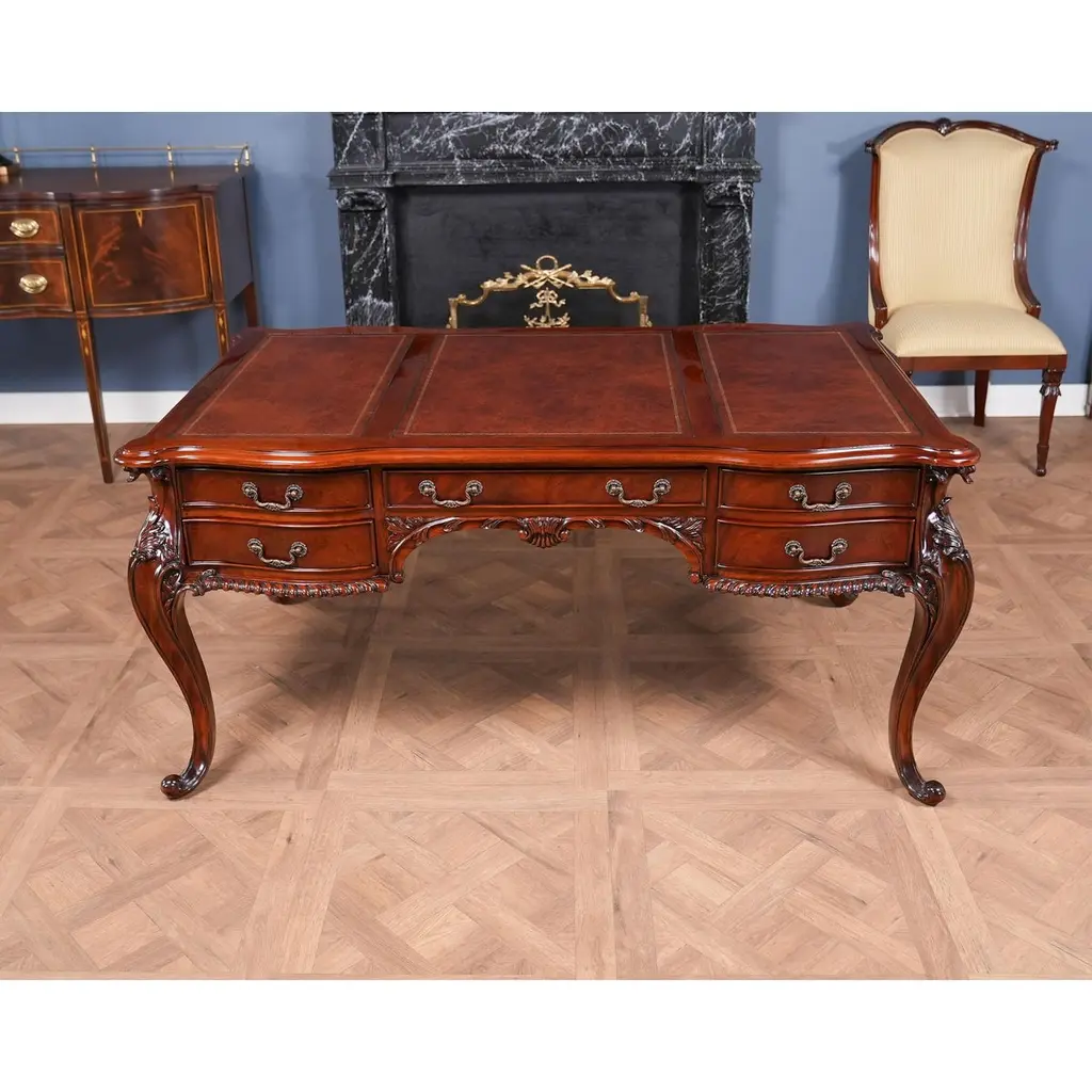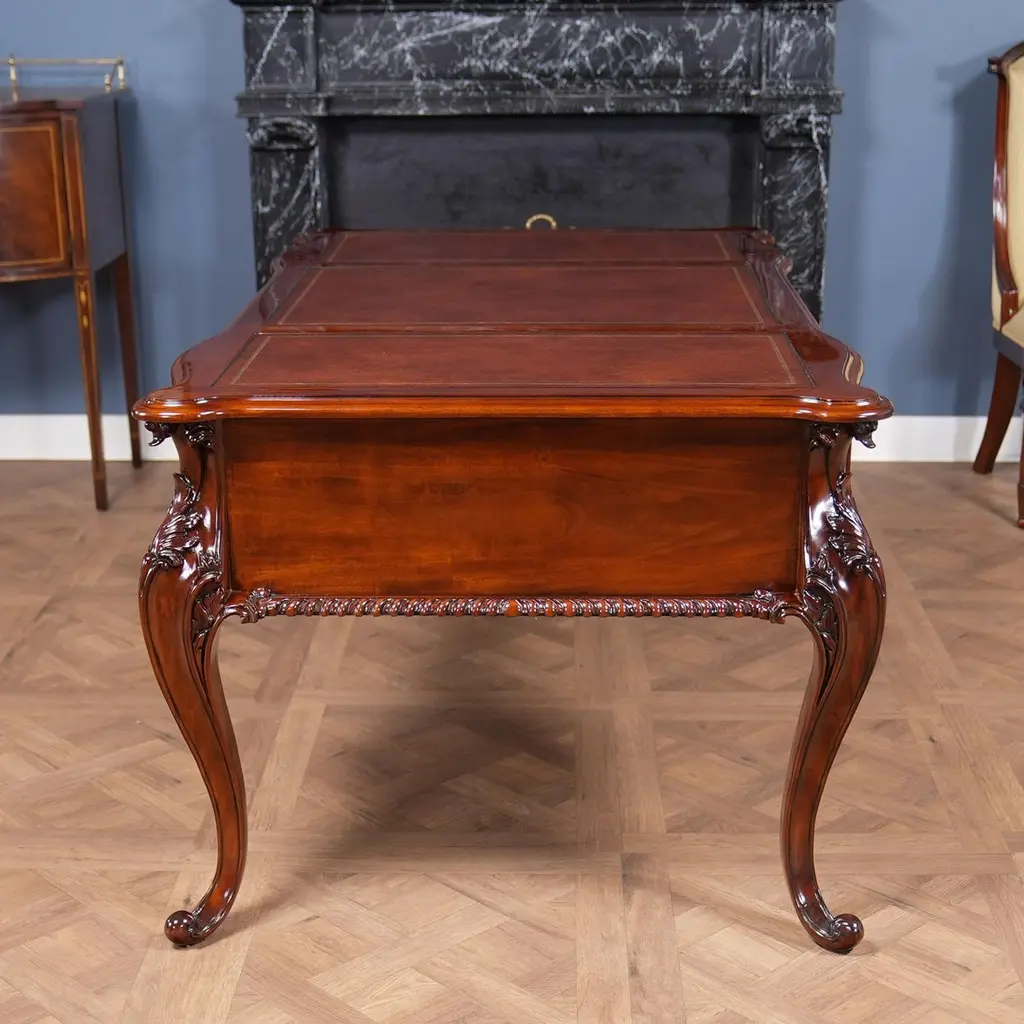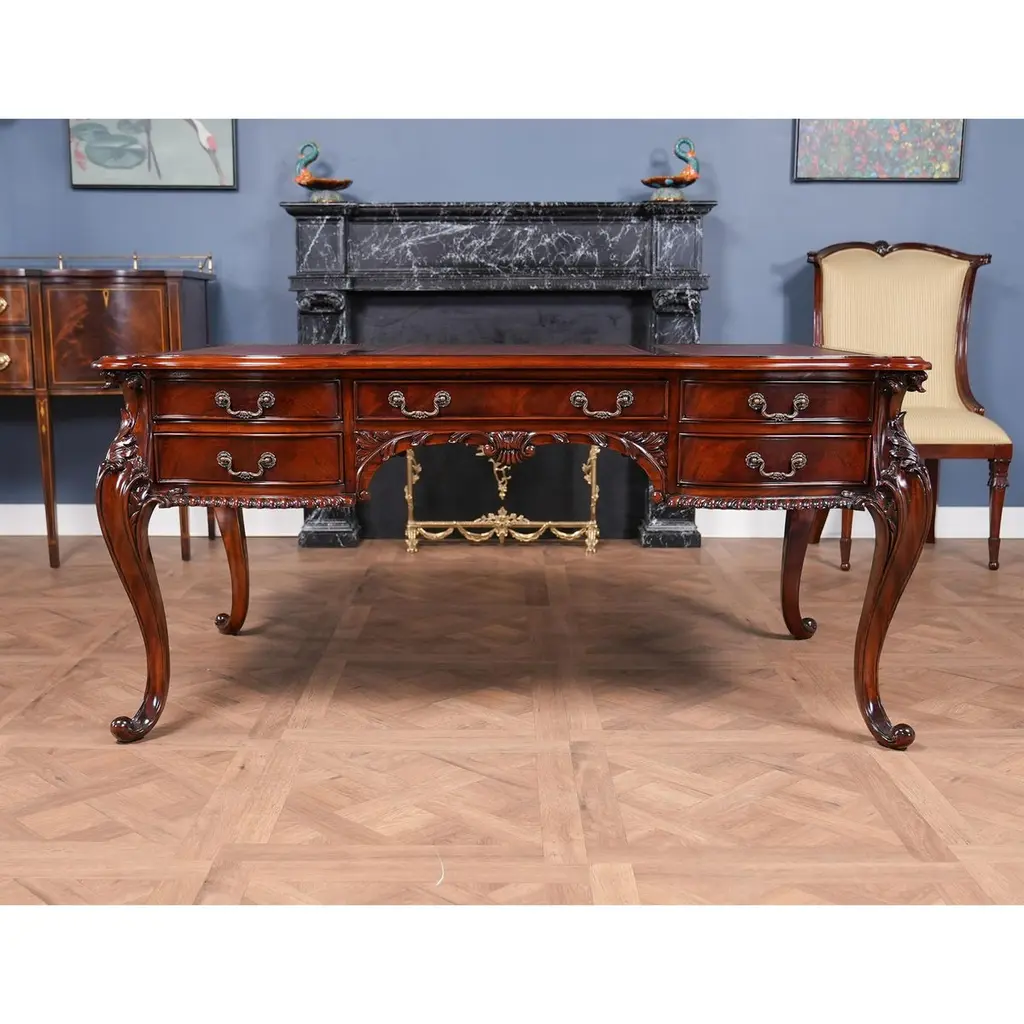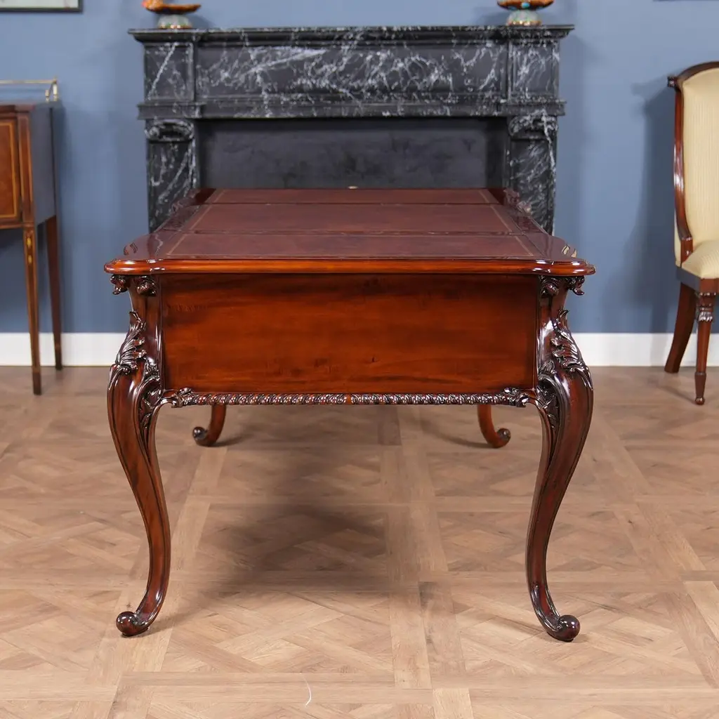 This Chippendale style Mahogany and Leather French Desk is produced by Niagara Furniture. A high quality writing desk that sets the standard for beauty and function among antique reproductions. Constructed from the finest grained mahogany the top also boasts three, full grained, genuine leather panels with antiques style gold tooling. The desk has cabriole legs with carvings at both the feet and knees as well as carvings under the banks of drawers and along the sides. The French Desk offers ample storage with five drawers, the visitor side having five faux drawers in the form of moldings.Kneehole is approximately 21 inches wide and 22.5 inches high.Measures 64″w x 38″d x 31″h metric 163 97 79