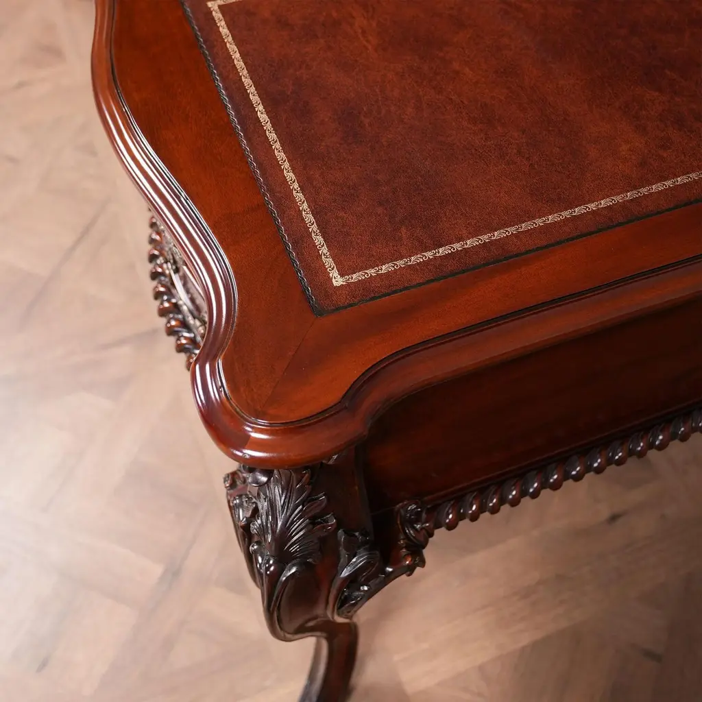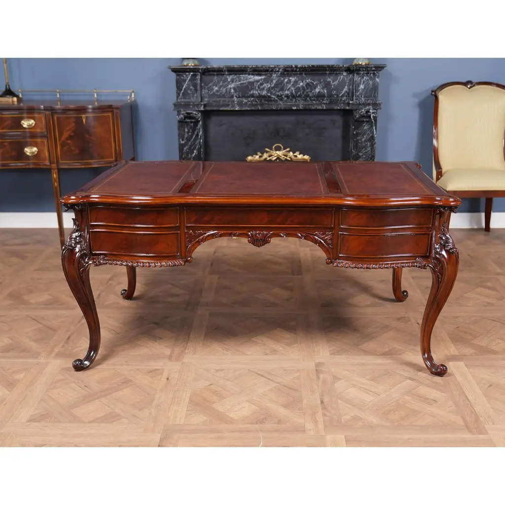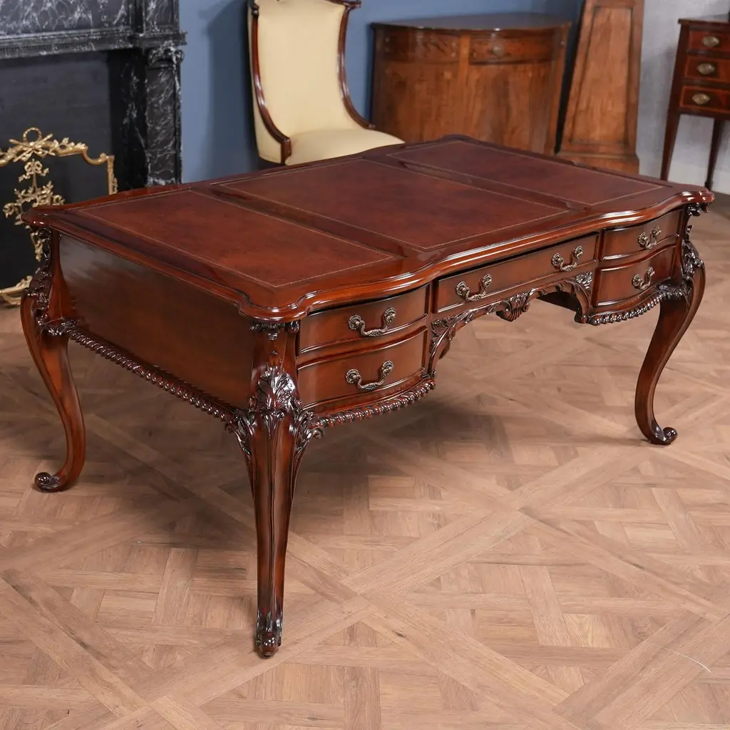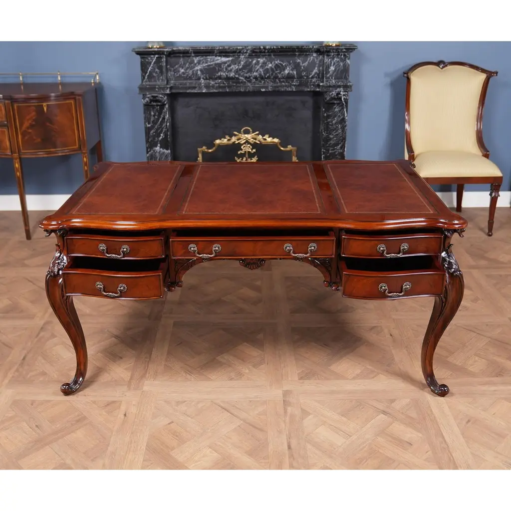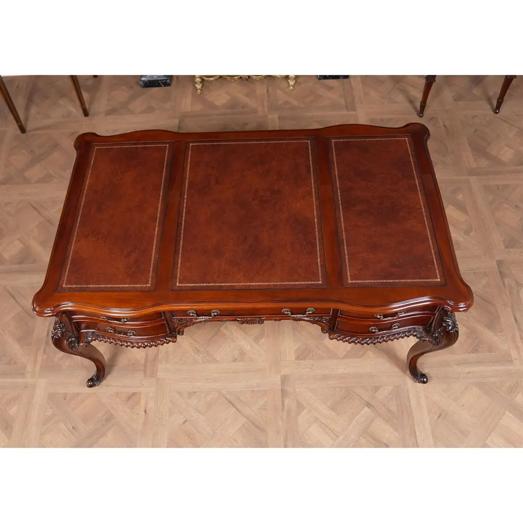 This Chippendale style Mahogany and Leather French Desk is produced by Niagara Furniture. A high quality writing desk that sets the standard for beauty and function among antique reproductions. Constructed from the finest grained mahogany the top also boasts three, full grained, genuine leather panels with antiques style gold tooling. The desk has cabriole legs with carvings at both the feet and knees as well as carvings under the banks of drawers and along the sides. The French Desk offers ample storage with five drawers, the visitor side having five faux drawers in the form of moldings.Kneehole is approximately 21 inches wide and 22.5 inches high.Measures 64″w x 38″d x 31″h metric 163 97 79