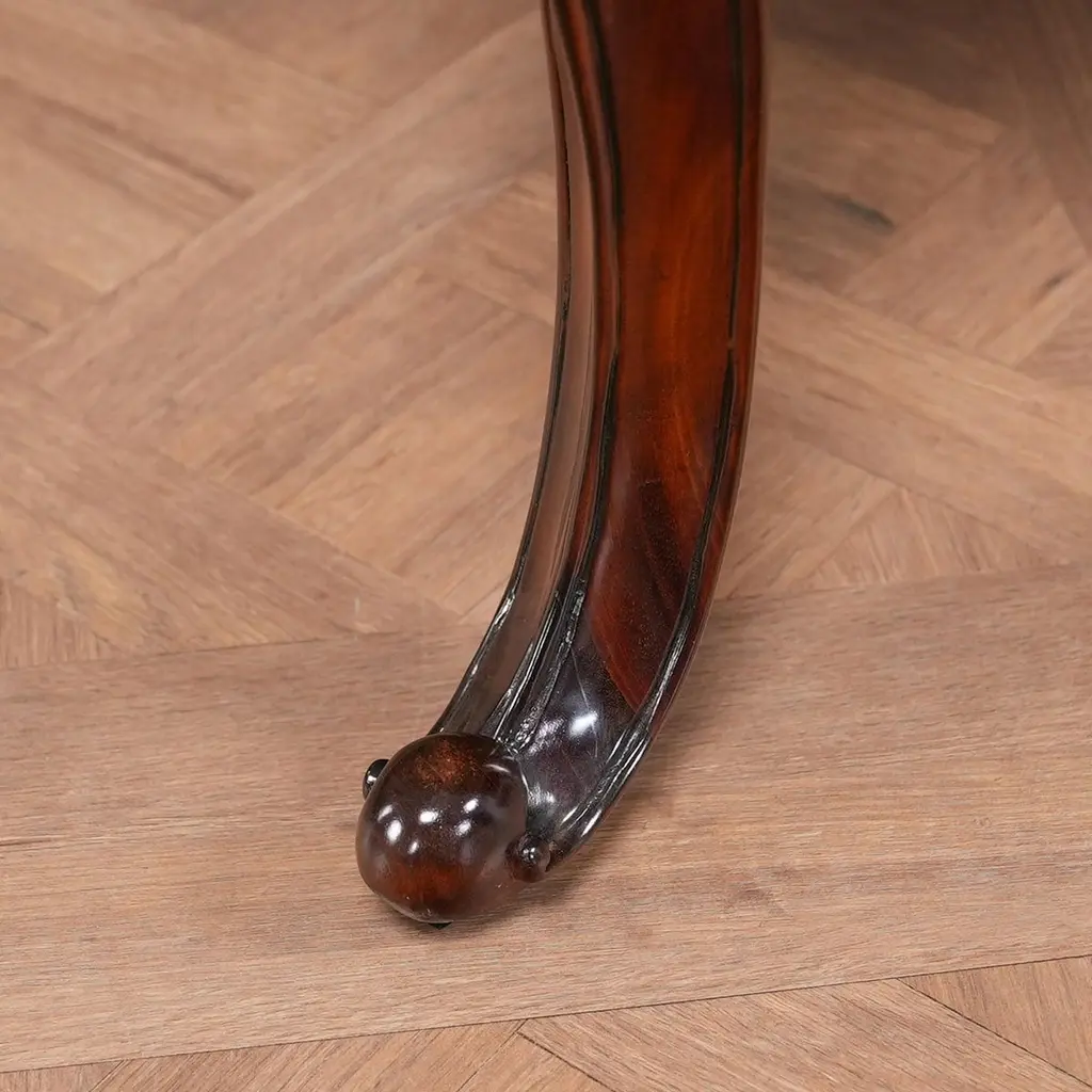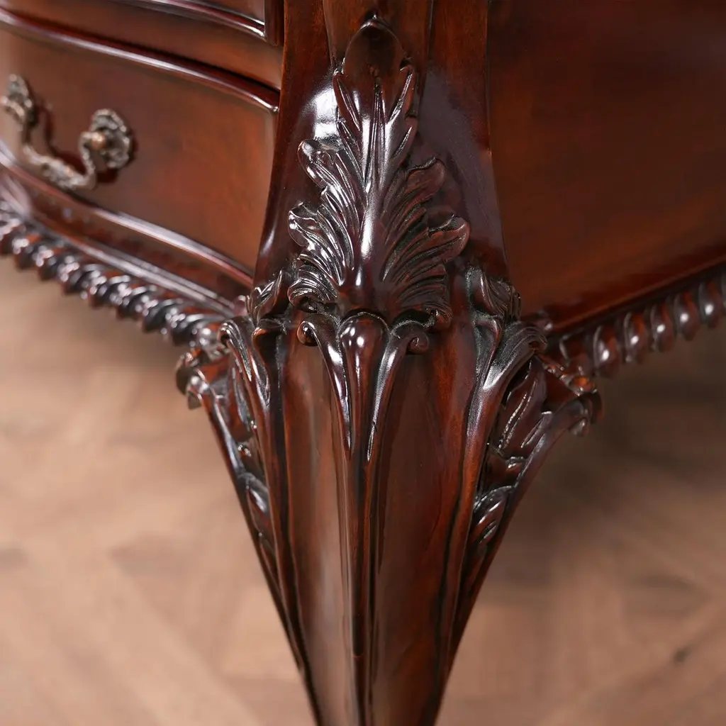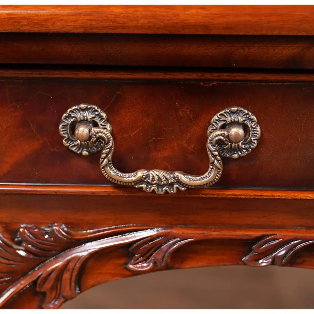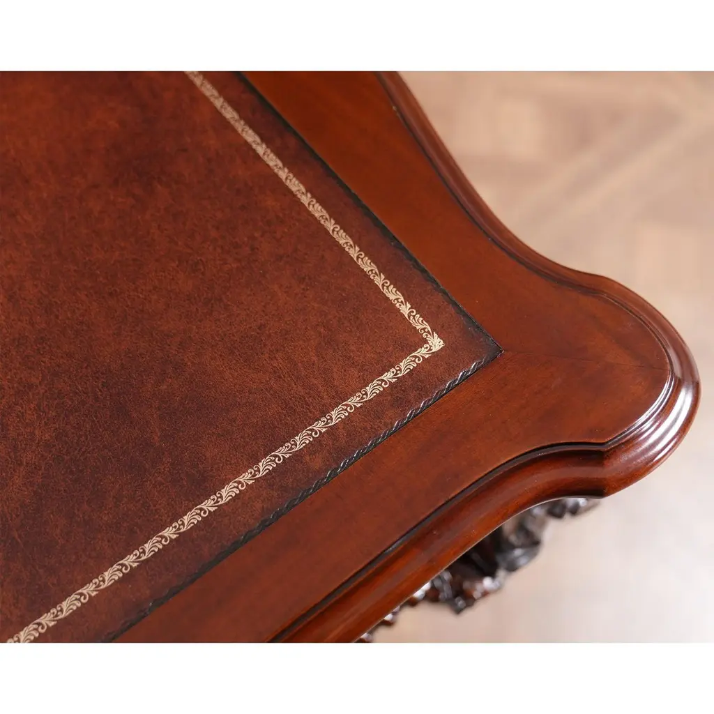 This Chippendale style Mahogany and Leather French Desk is produced by Niagara Furniture. A high quality writing desk that sets the standard for beauty and function among antique reproductions. Constructed from the finest grained mahogany the top also boasts three, full grained, genuine leather panels with antiques style gold tooling. The desk has cabriole legs with carvings at both the feet and knees as well as carvings under the banks of drawers and along the sides. The French Desk offers ample storage with five drawers, the visitor side having five faux drawers in the form of moldings.Kneehole is approximately 21 inches wide and 22.5 inches high.Measures 64″w x 38″d x 31″h metric 163 97 79