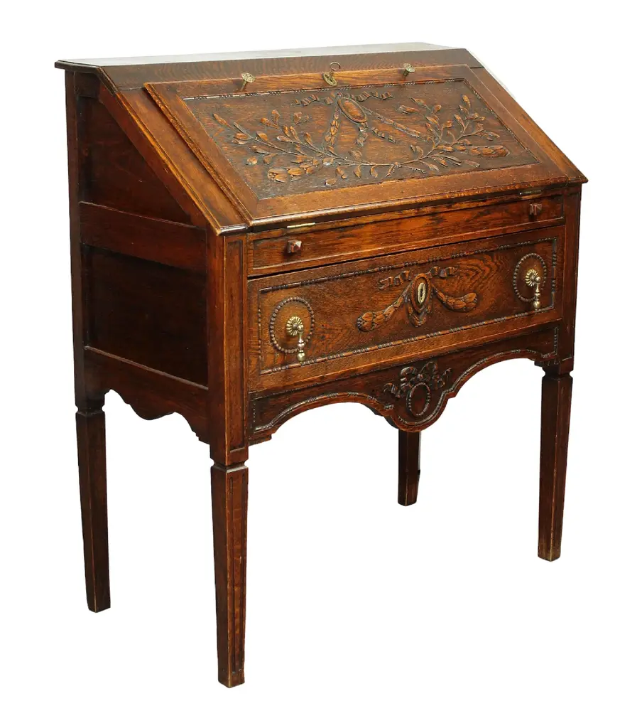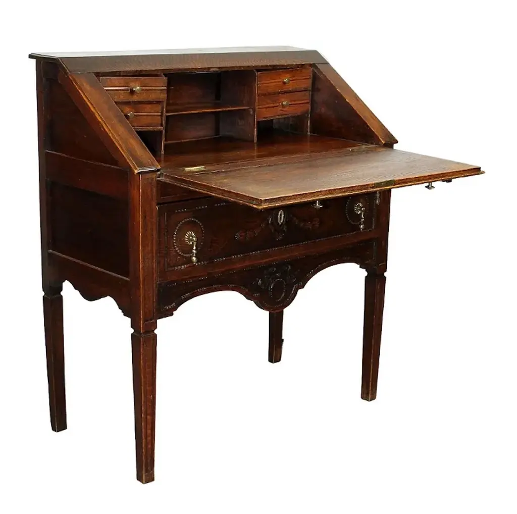 French Louis XVI style fall front writing desk in carved oak. No maker's marks.