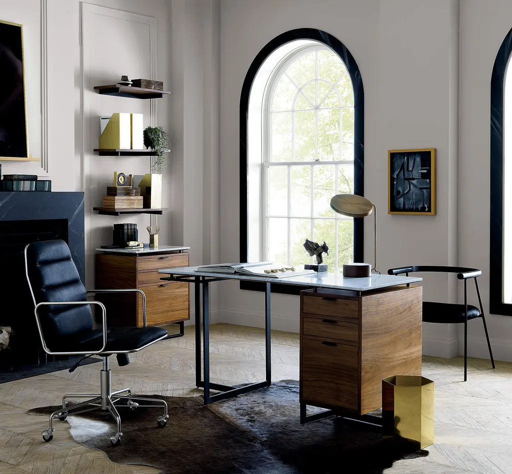 Warm wood and metal desk works hard round the clock. Set of drawers make space for desk accessories, with a bottom drawer designed for hanging files. Minimalist black metal frame creates an airy base for marble top that always looks sleek. Learn about VUUE on our blog. CB2 exclusive.