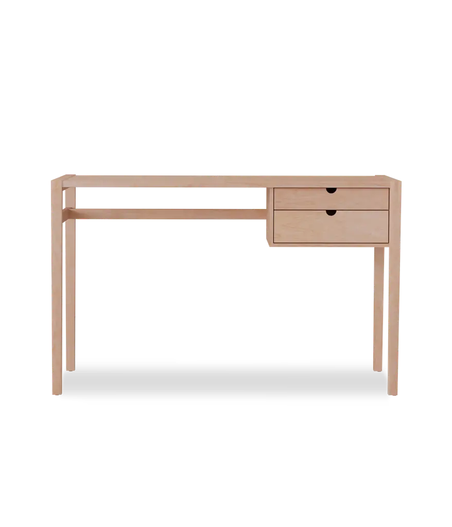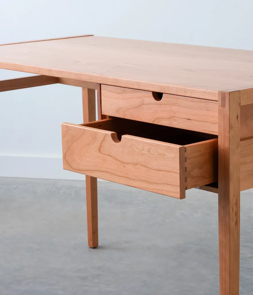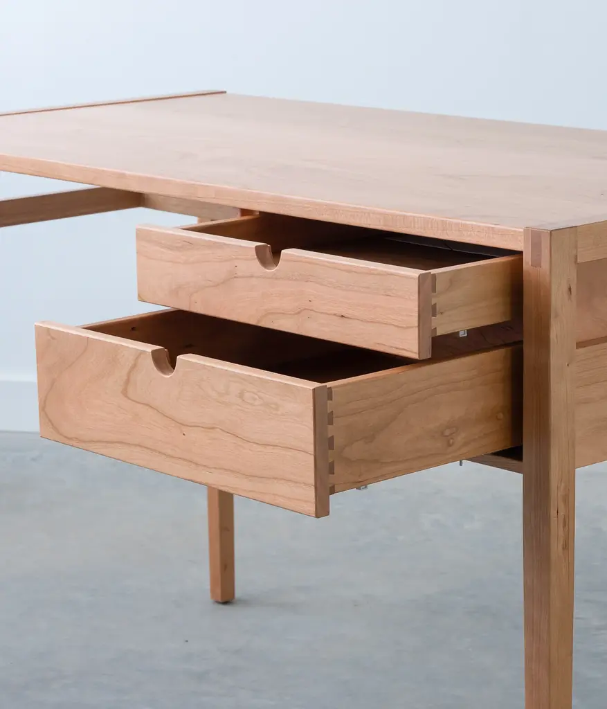 The Garfield desk - built with exposed mortise and tenon joinery. Features two dovetail drawers, with self-closing under-mount slides.
