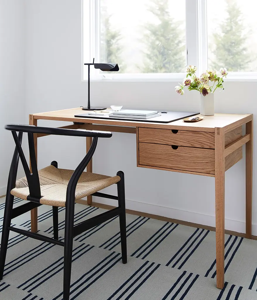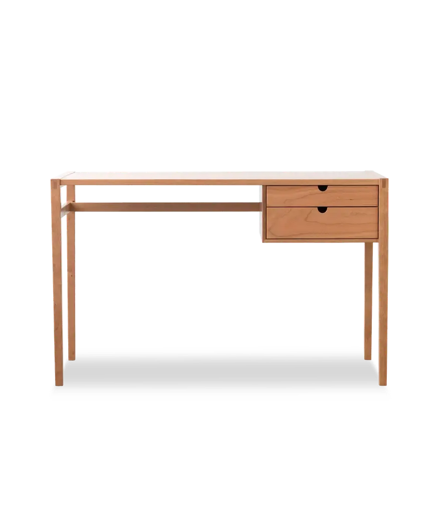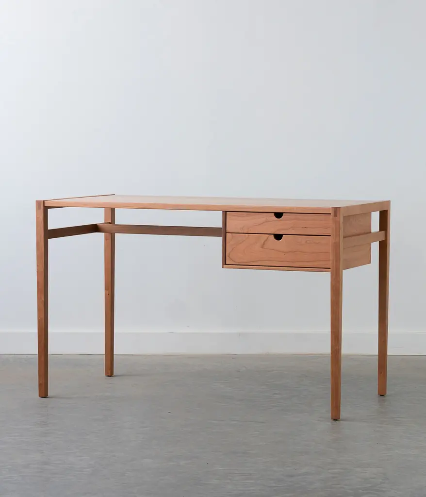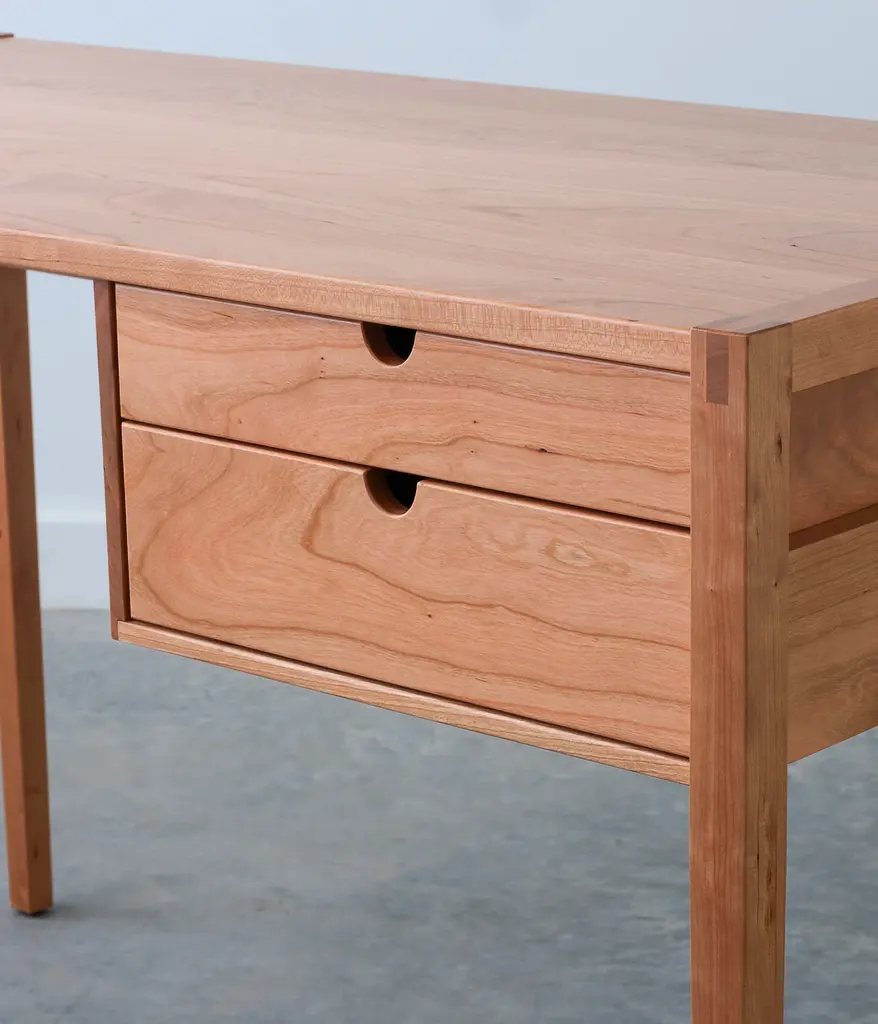 The Garfield desk - built with exposed mortise and tenon joinery. Features two dovetail drawers, with self-closing under-mount slides.