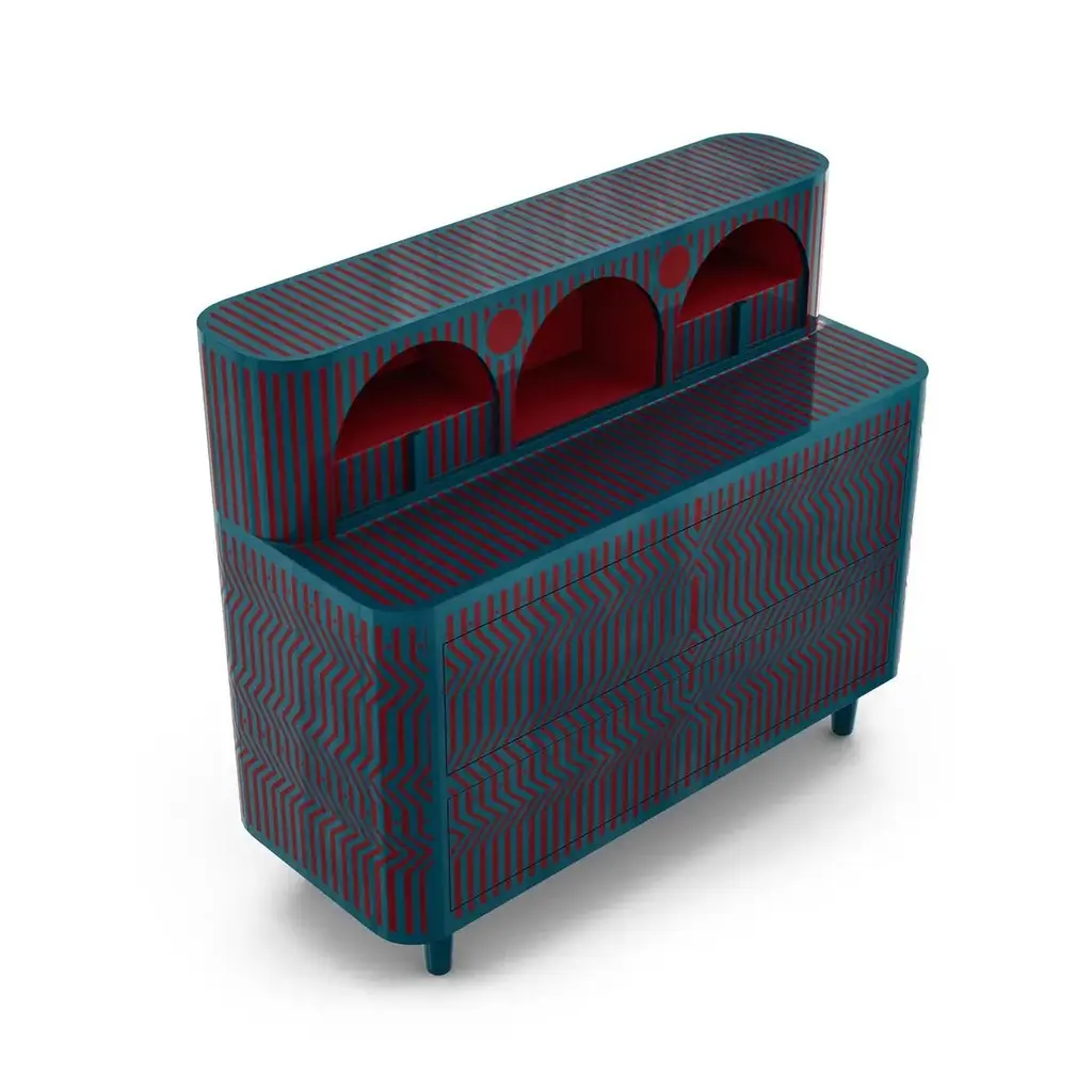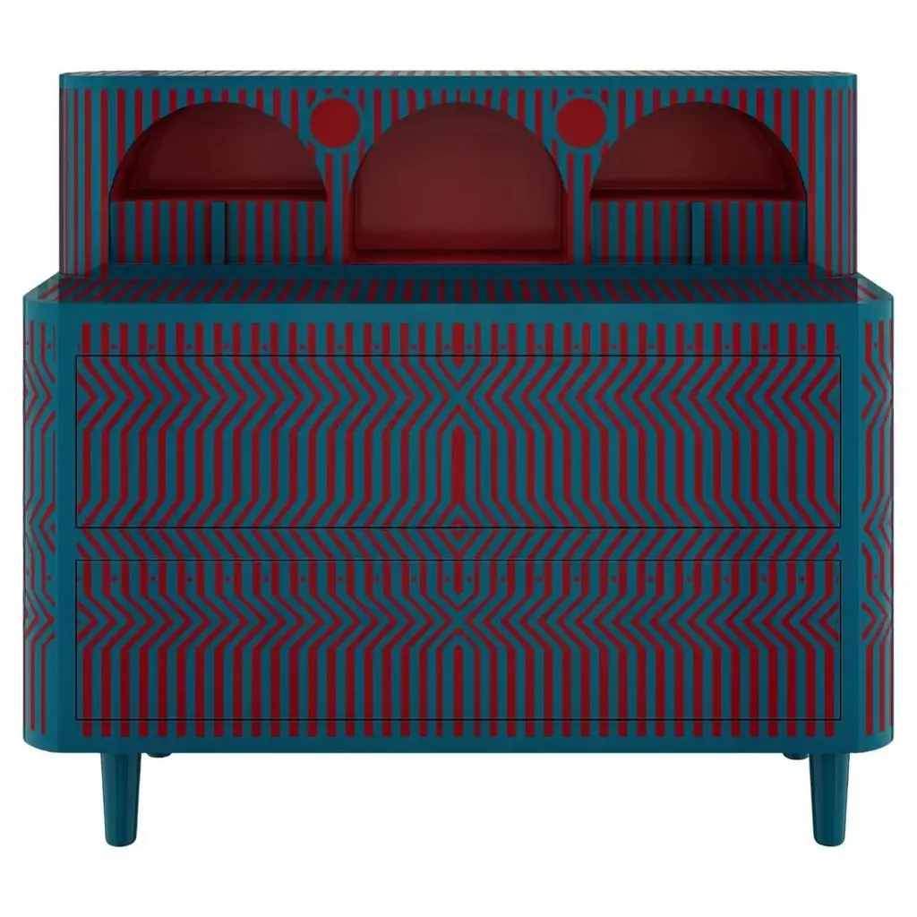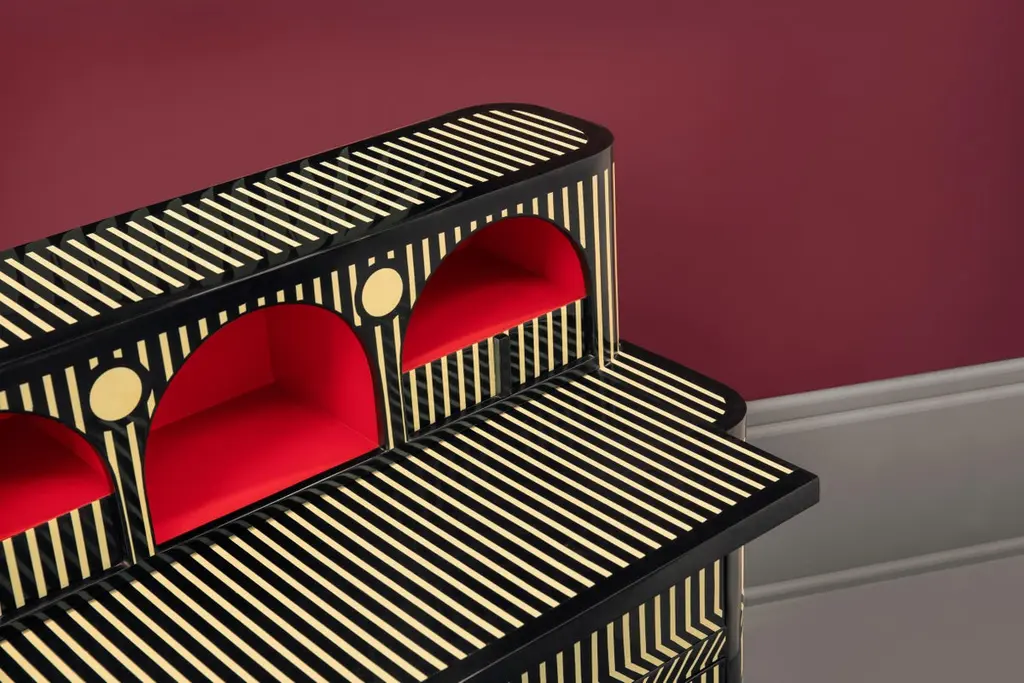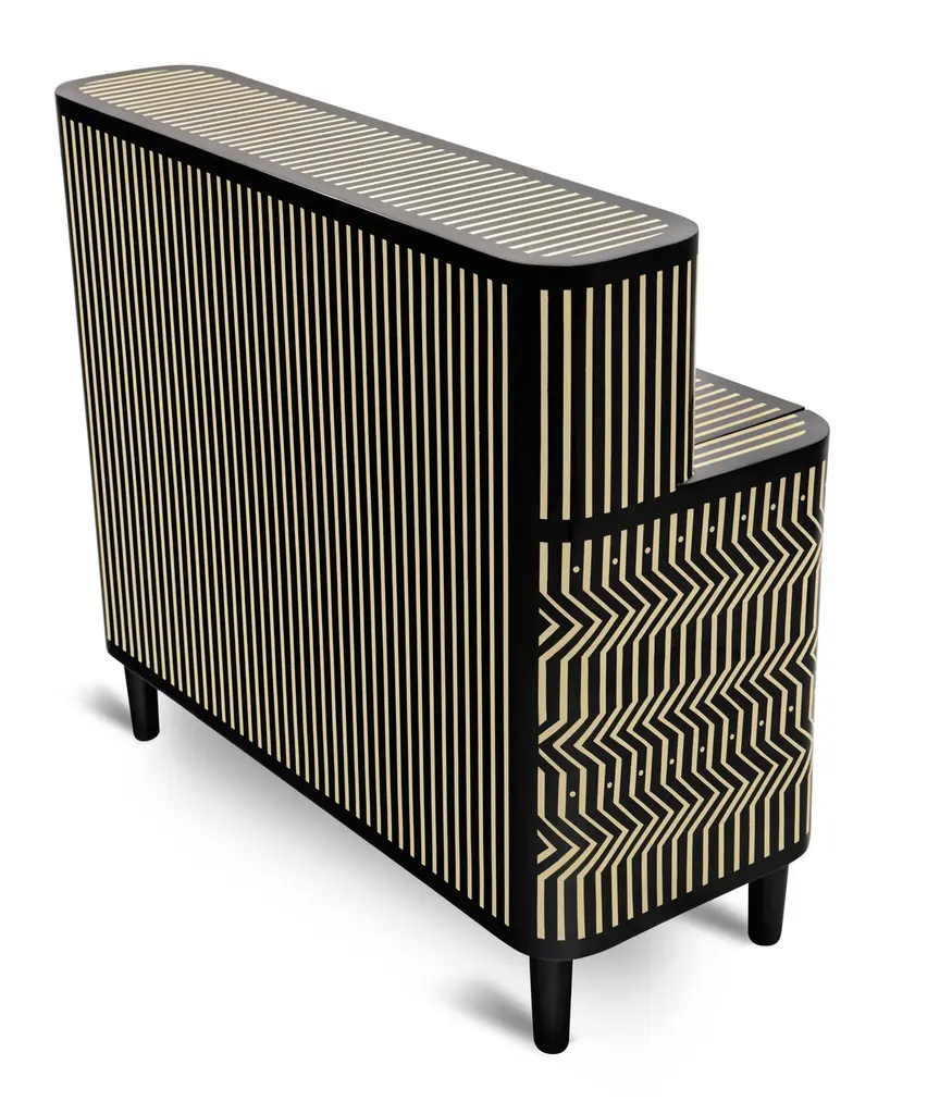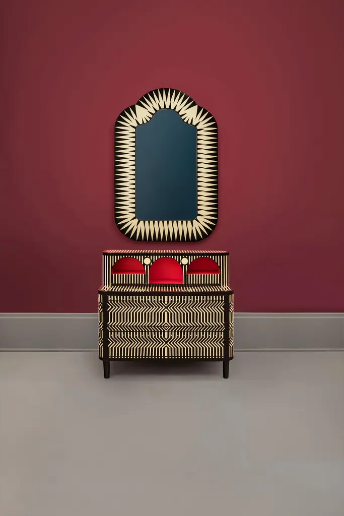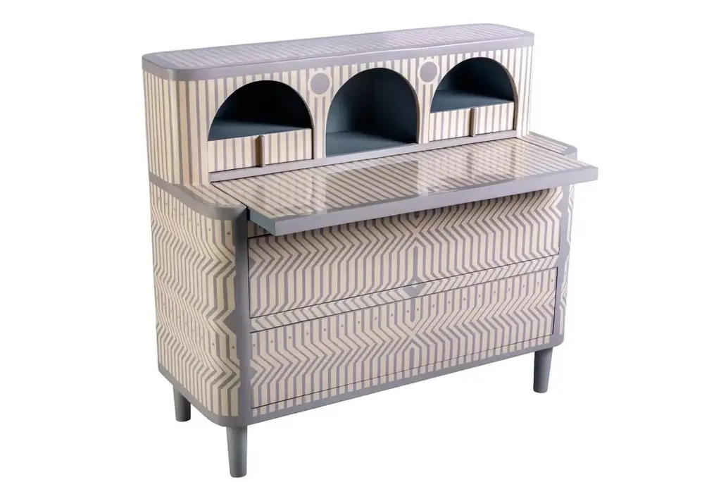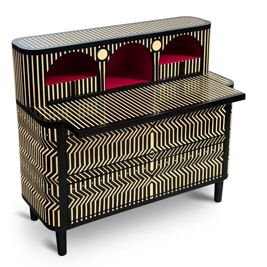 General Study Desk Writing Table by Matteo Cibic is a formidable study table, which has an extendable writing top, and small details, which is reminiscent of a traditional desk. The size and colours can be customised upon request.India's handicrafts are as multifarious as its cultures, and as rich as its history. The art of bone and horn inlay is omnipresent here. Artisans from the Northern region of Sarai Tarin, to Bengal in the East, and Trivandrum in the South, have imbibed the ancient technique from Himalayan tribes, and have made their own mark along the way. The intricately crafted combs, vases, toys, and other objets d'art have long been a connoisseur's delight, and a means of livelihood for millions. When the founders of Scarlet Splendour and designer Matteo Cibic went on tour, in search of inspiration for their first collection, they were captivated by the exquisite bone marquetry. They decided to make a contemporary version of the playfully geometric designs, which would be accepted across the world. Cibic then developed a resin compound, and the company carried out trials with the material until they found the right mix. The resin would replicate ivory inlay, on a base of plywood, ultimately smoothened and lacquered to have no visible or tactile end. Each piece of the Vanilla Noir collection would then be made in India, by local craftsmen using locally sourced materials and pigments. The aim was to combine Indian workmanship and Western aesthetic in such a way that each piece appears timeless, and with multiple roots. In the unique decorative imprints one would recognize Indian styles, and also unexpected drifts to Italian design. The company's founders wanted to proudly showcase the fine art and making capabilities of their native India, and give the craftsmen due recognition. They have successfully paid homage to their heritage by elevating indigenous art and taking it to global design platforms.Care: Wipe gently with dry soft cloth. Liquid spillage must be wiped without delay.Please note: Each piece in the Vanilla Noir collection exalts the handmade, the painstakingly crafted, the authentic. A piece may have slight variations and tiny imperfections but these are the marks of an artisan, a testament to the individuality of each work of art. It is our belief that these variations infuse our objects d'art which desire and we assert our right to make the necessary qualitative changes. Prices do not include VAT. VAT may be applied depending on the ship-to location.