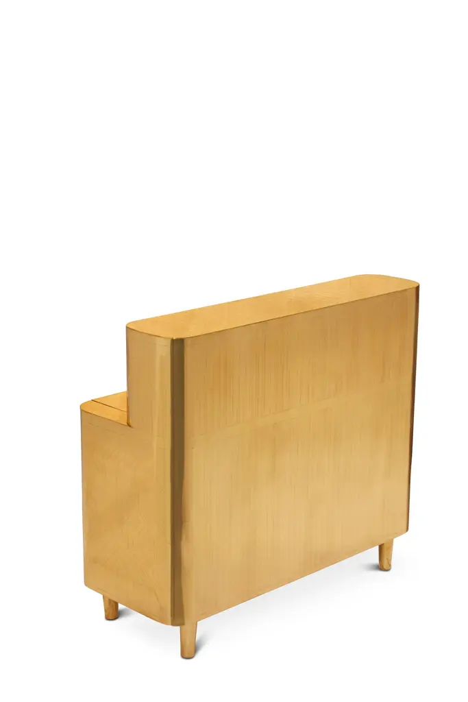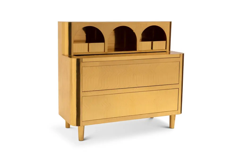 General Study Desk Writing Table in Brass by Matteo Cibic is a chic study table in brass, with an extendable writing top and small details, reminiscent of a traditional desk.Matteo Cibic designed the Vanilla Noir collection for Scarlet Splendour in 2014-15. The collection over the years comprises of over fifty beautiful pieces of furniture finished in resin inlay work painstakingly handcrafted in India. The forms of these pieces are delightfully unique, some are reminiscent of Art Deco style and some are playful with quirky shapes. But always soft edged and charming. The founders of Scarlet Splendour couldn't have enough of this chic Italian line develop by Cibic. So after much deliberation amongst them, it was decided that this collection should be produced in a more opulent and precious material, brass was the obvious choice. Marquetry has long been a Craft in India, be it of metal, semi-precious stones, bone, ivory or wood. Brass inlay work is a popular handicraft right from Rajasthan and Uttar Pradesh in the north to Tamil Nadu in the south. This craft is used in the Vanilla Noir Oro collection as brass is meticulously crafted on wood to create strong graphic patterns. Paradoxically, the patterns remain subtle as well because there is no contrasting color or material used in the inlay. The result has been an elegant, decadent collection, a Fine contemporary take on a traditional craft.Care: Wipe gently with dry soft cloth. Liquid spillage must be wiped without delay.Please note: Each piece in the Vanilla Noir Oro collection exalts the handmade, the painstakingly crafted, the authentic. A piece may have slight variations and tiny imperfections but these are the marks of an artisan, a testament to the individuality of each work of art. It is our belief that these variations infuse our objects d'art which desire and we assert our right to make the necessary qualitative changes. Prices do not include VAT. VAT may be applied depending on the ship-to location.