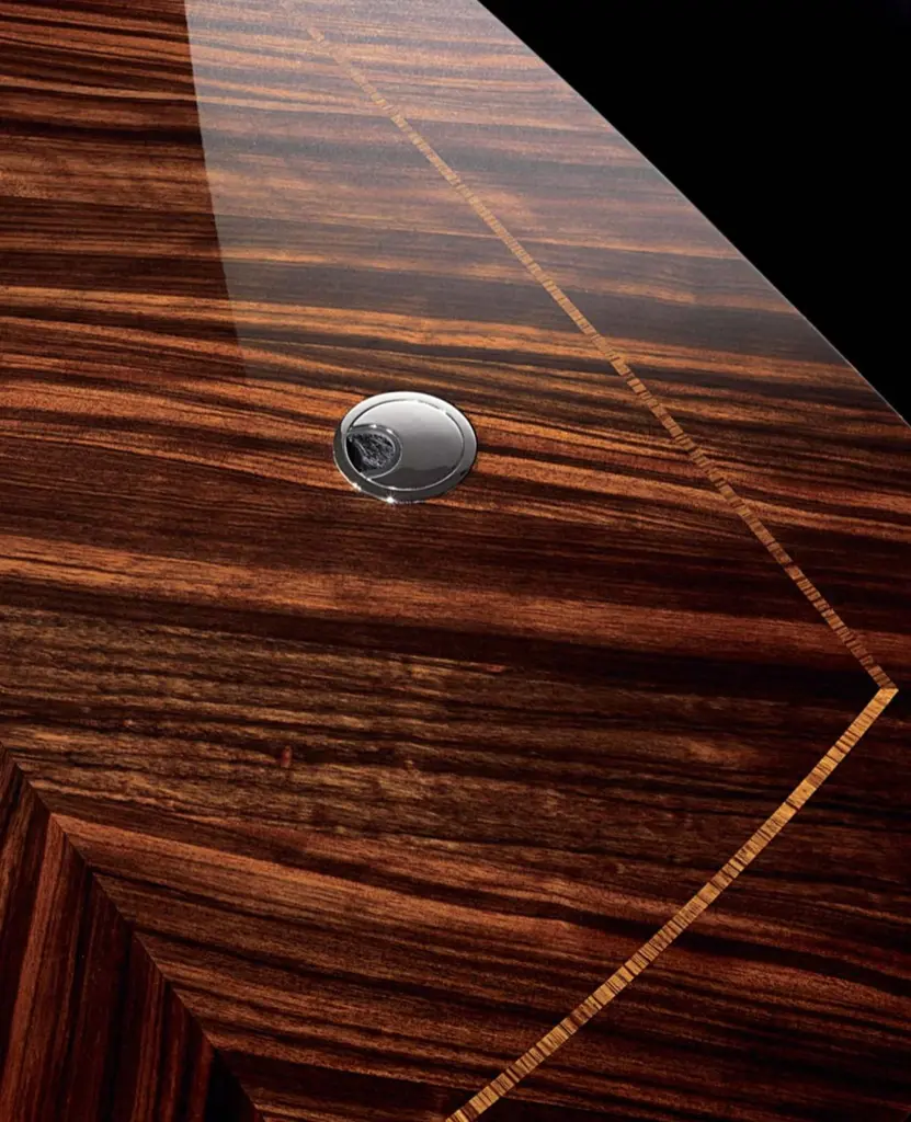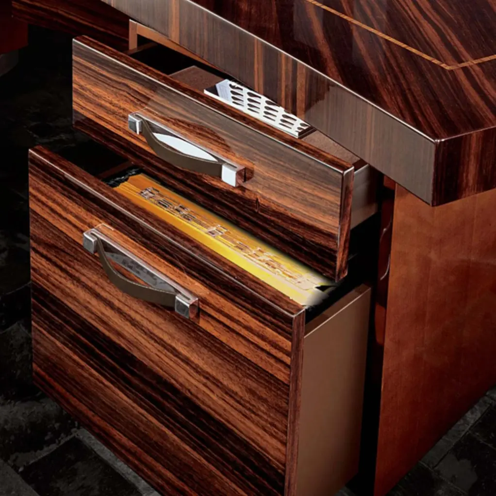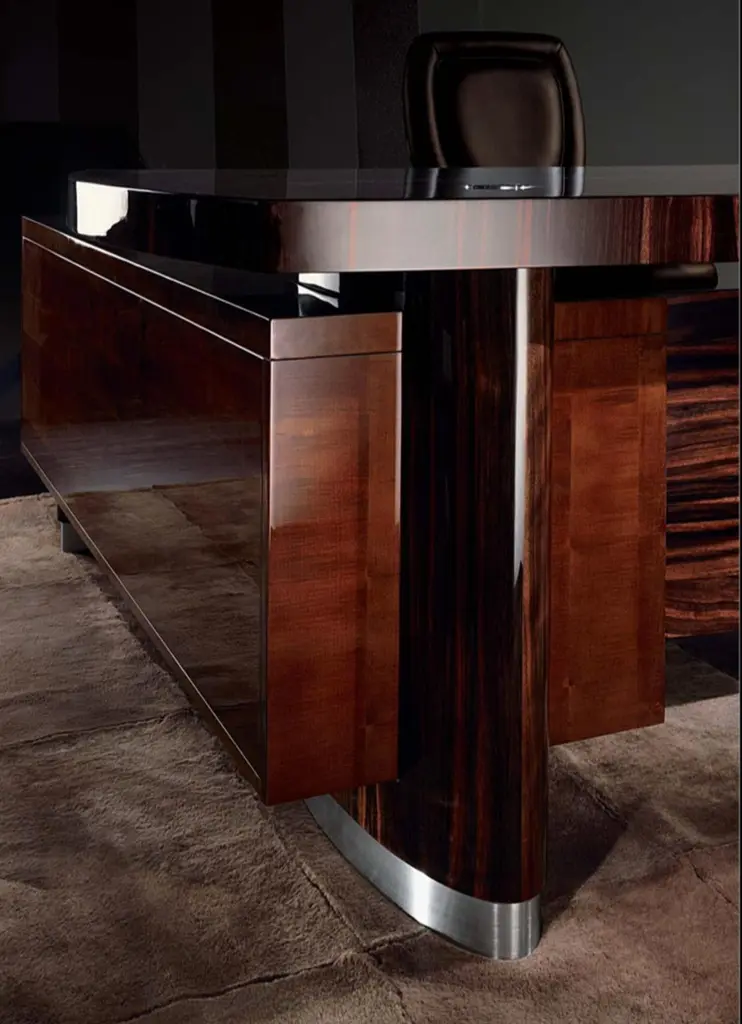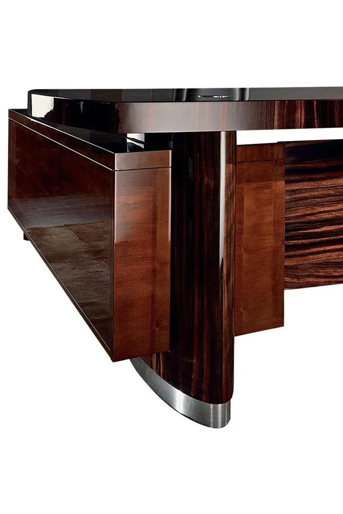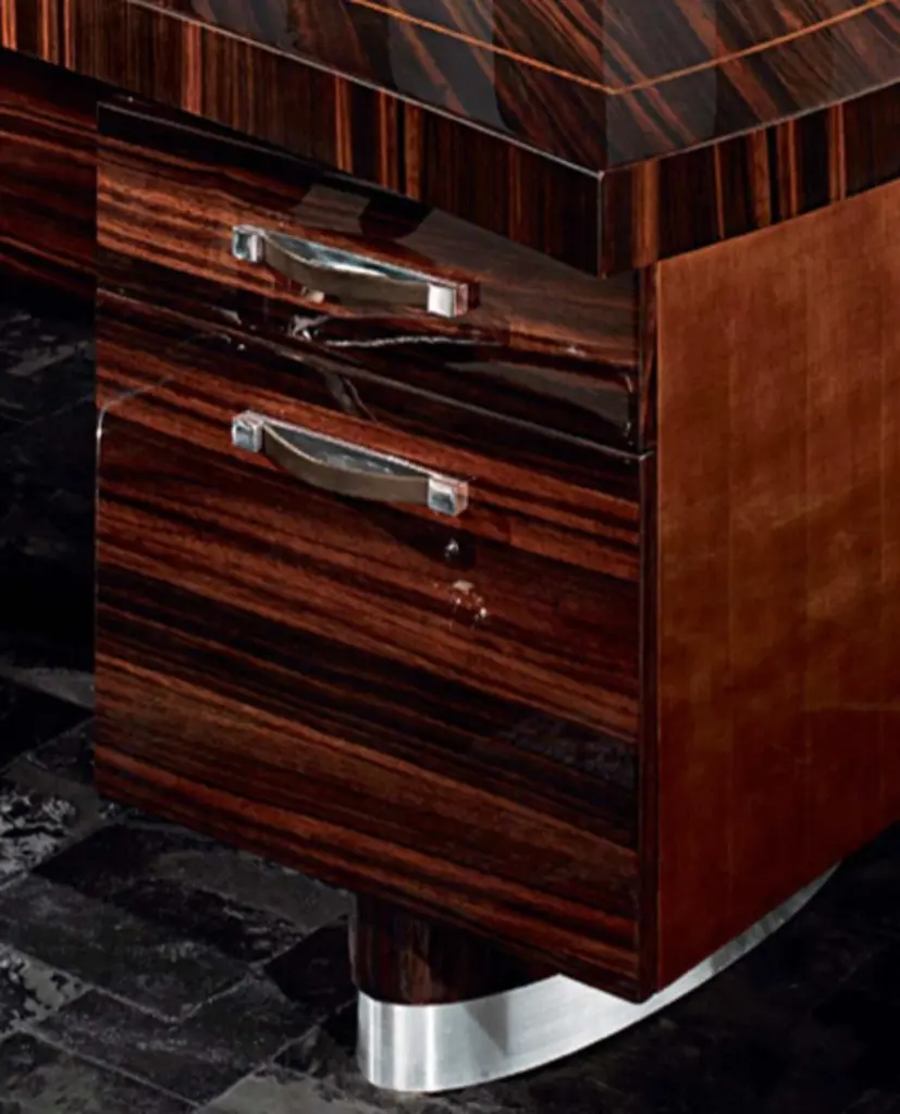 Indulge in the epitome of luxury with this exquisite desk. Its ebony Macassar top, adorned with a Zebra veneer filet in high gloss polyester, exudes opulence. Velvet-lined drawers offer plush storage, while brushed stainless steel feet add a modern touch. A fusion of craftsmanship and elegance, this desk is a statement of refined taste and sophistication.Desk with top in ebony Macassar with 6 mm filet in Zebra veneer in high gloss polyester with 1 full extension drawer with bottom velvet.inside and 1 file drawer on each side.Center pencil drawer with bottom velvet inside.The cabinet bases are made with combination of ebony Macassar and caramel British sycamore with feet in brushed stainless steel.