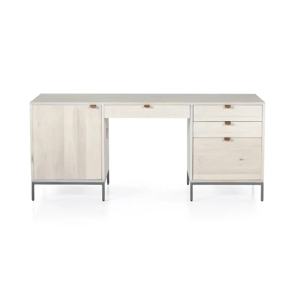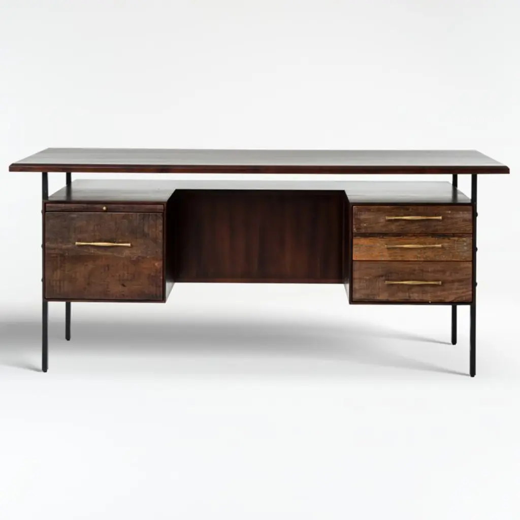 The Glenn Desk is a contemporary writing desk featuring a wooden top and ample storage with a sleek, matte-black metal frame and accents.