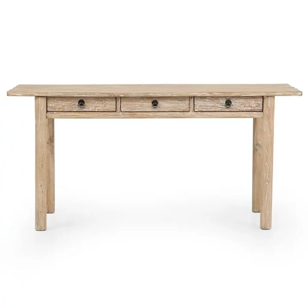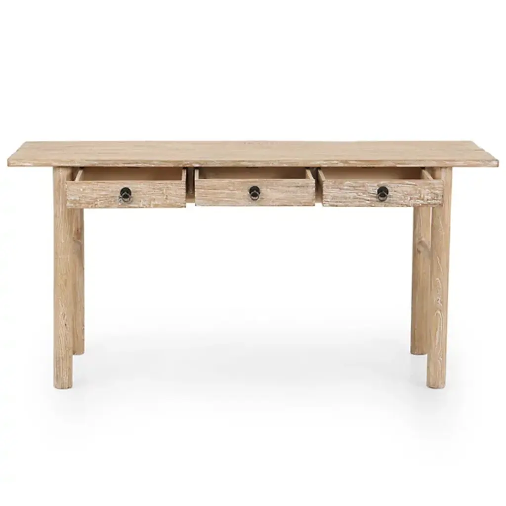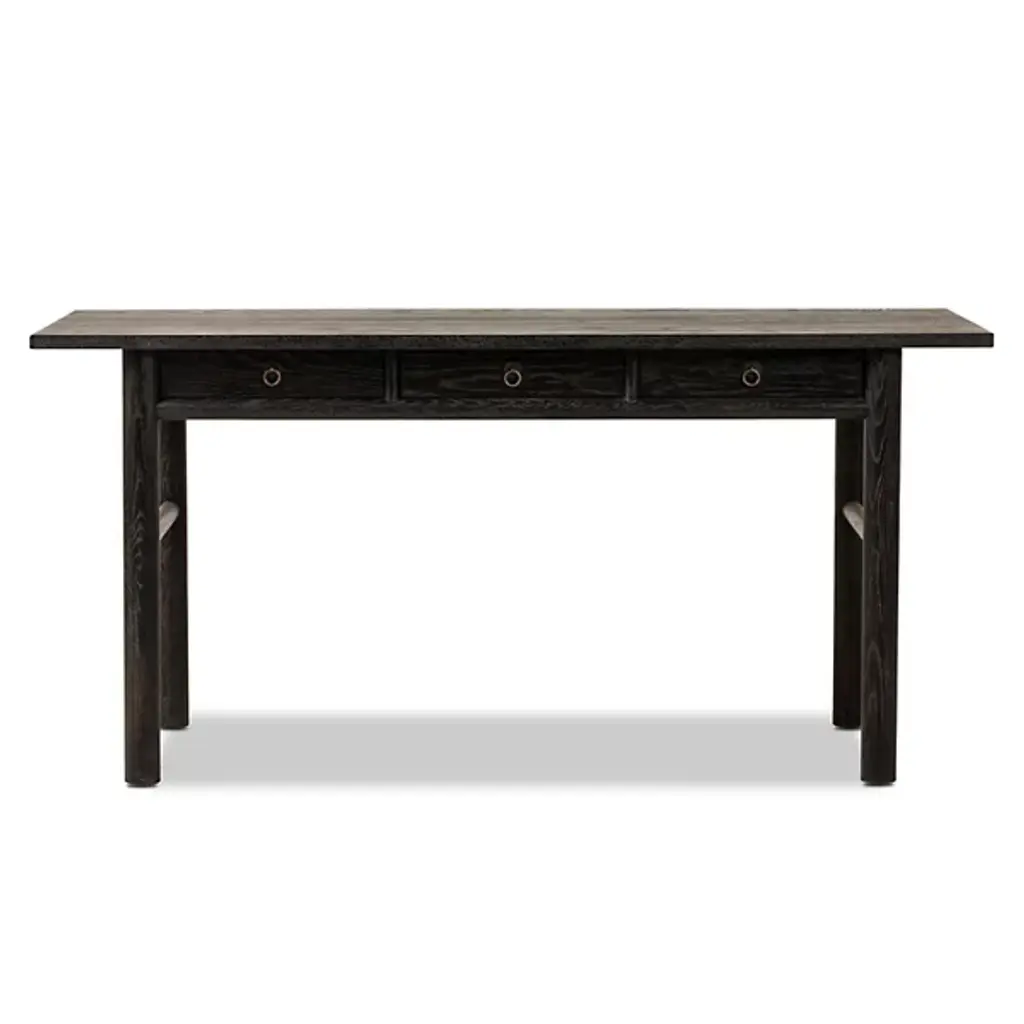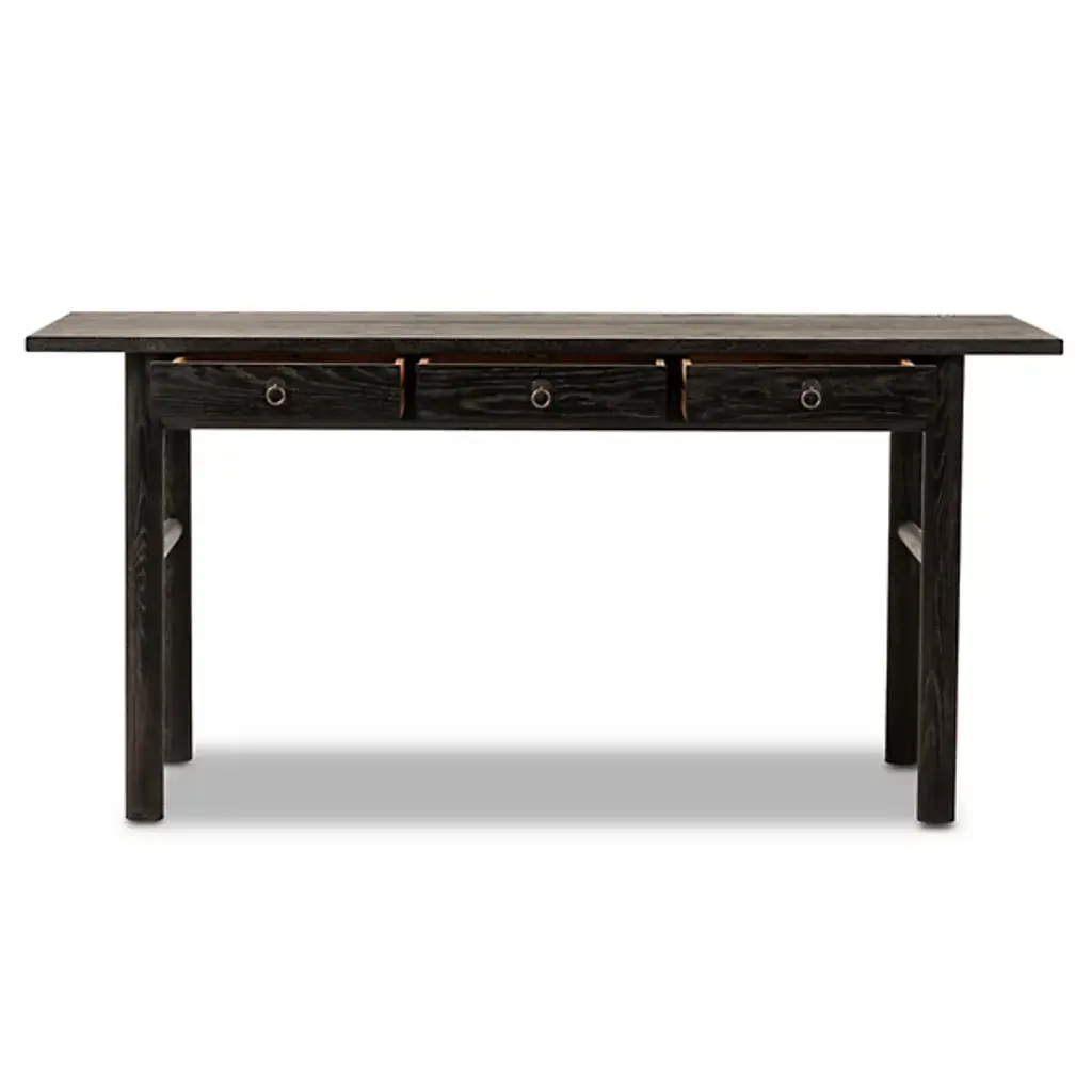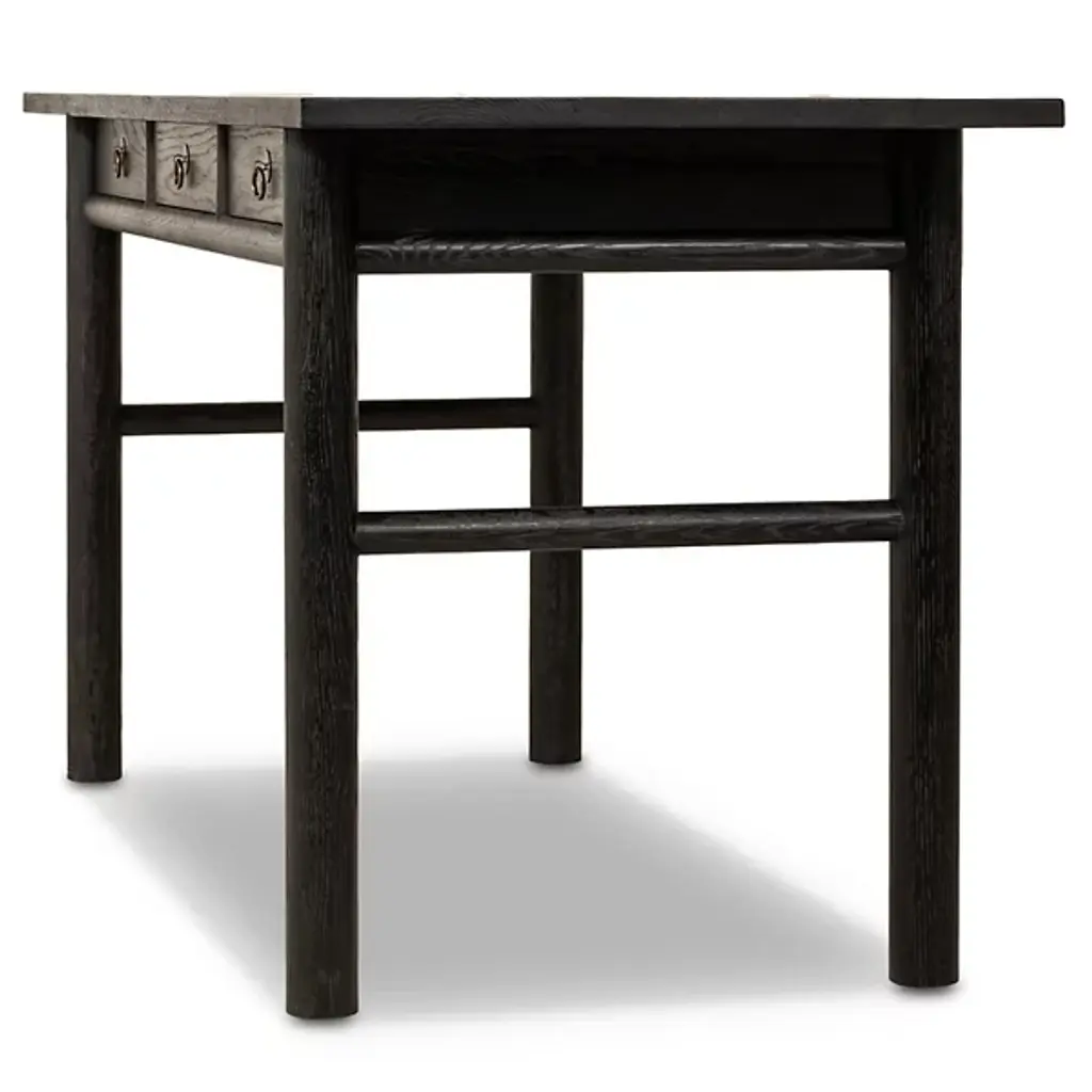 The Griffith Desk from Four Hands puts a contemporary twist on classic Chinese design. Made from distressed oak, this altar-style desk exudes rustic charm while offering a sleek workspace. Three spacious pencil drawers, adorned with copper-clad ring pull hardware, provide a refined touch of vintage appeal. Perfect for home offices or creative spaces, this elegant desk combines lasting craftsmanship with modern functionality, making it a statement piece that blends seamlessly into any interior.