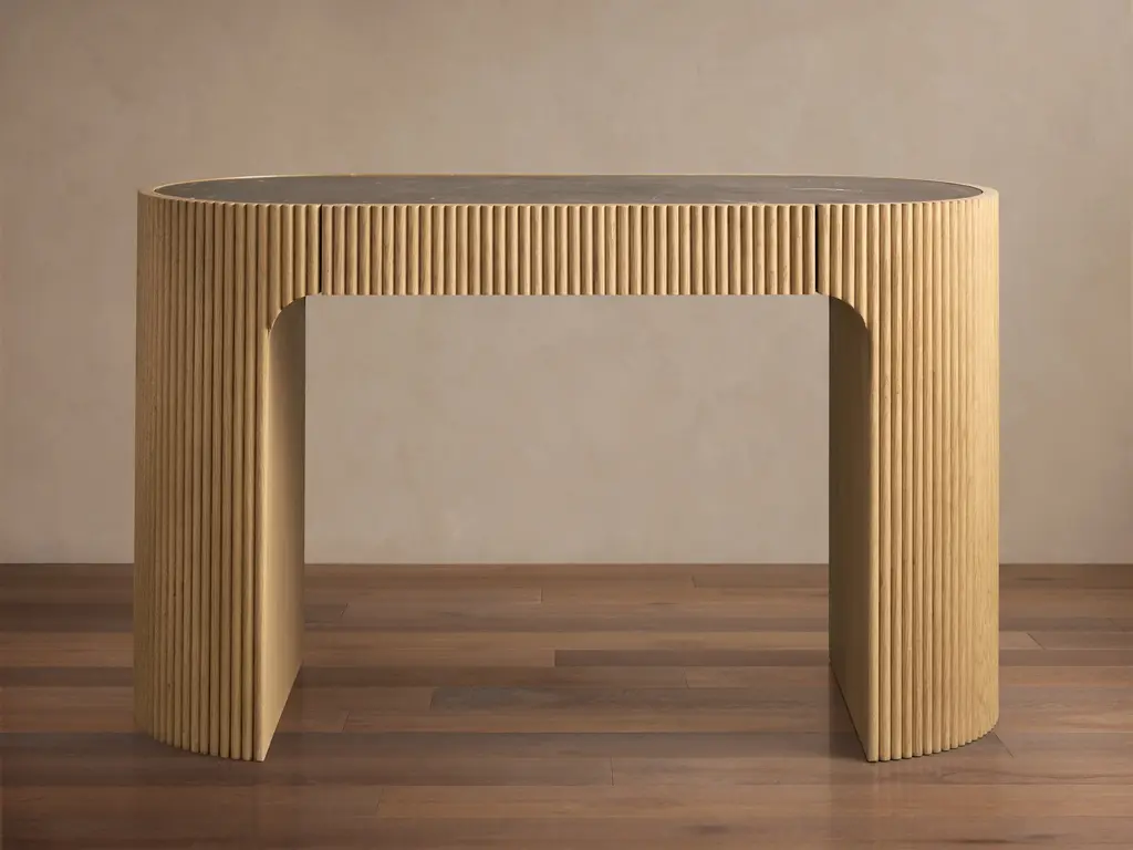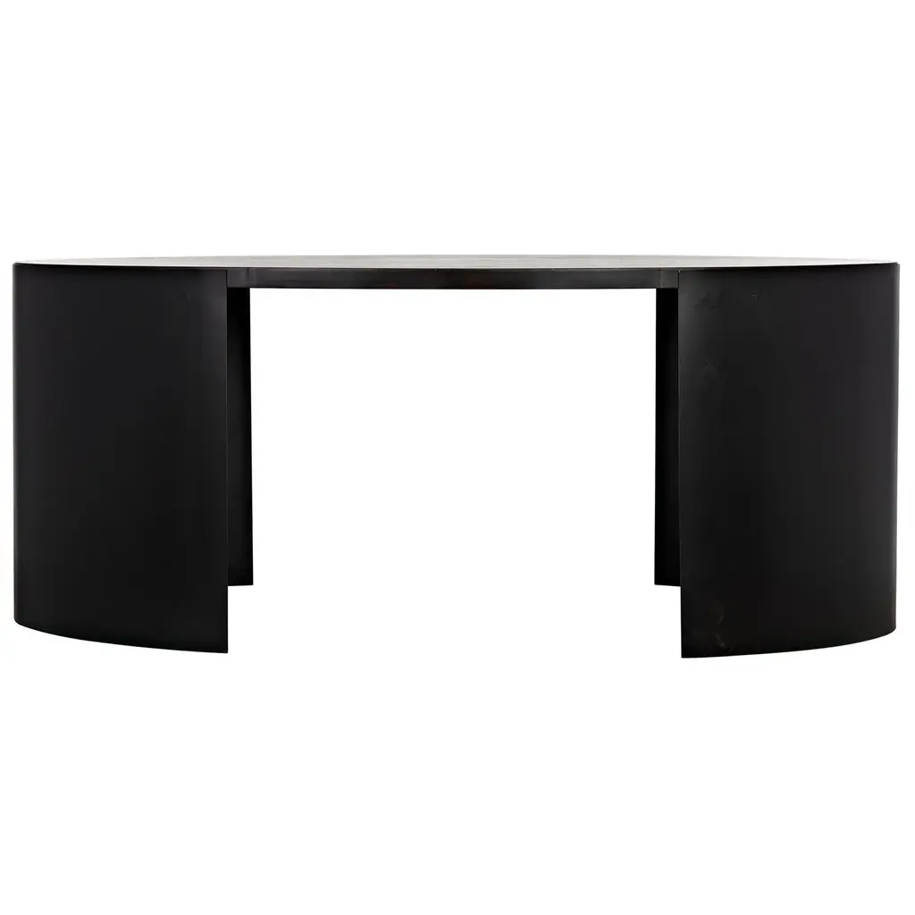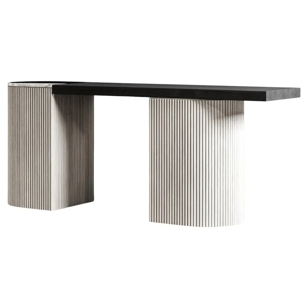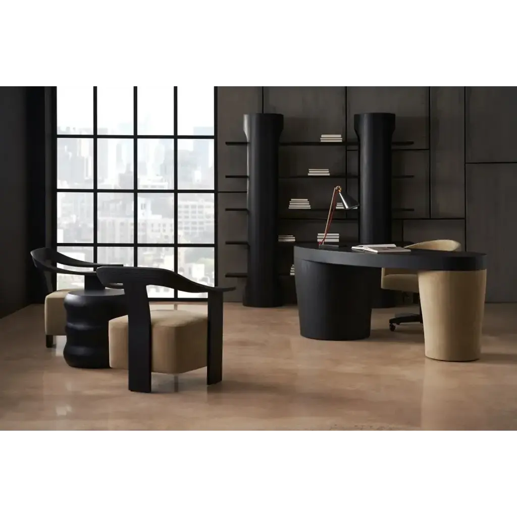 An elegant expression of form and functionality, this sculptural desk instantly elevates any work space. Creative and captivating, it features an expansive wood veneer top, balanced on rounded legs in an unexpected material mix: soft suede contrasted by a striking matte black finish. Its seamless design features a center drawer and two additional drawers within the right-facing leg for neatly keeping office essentials.