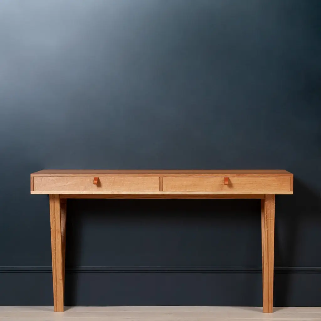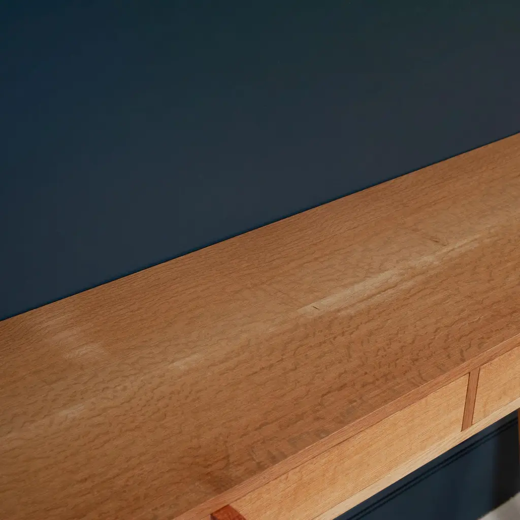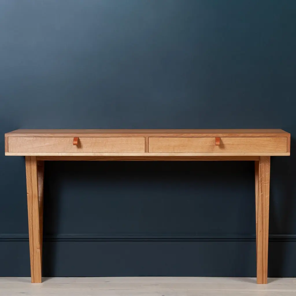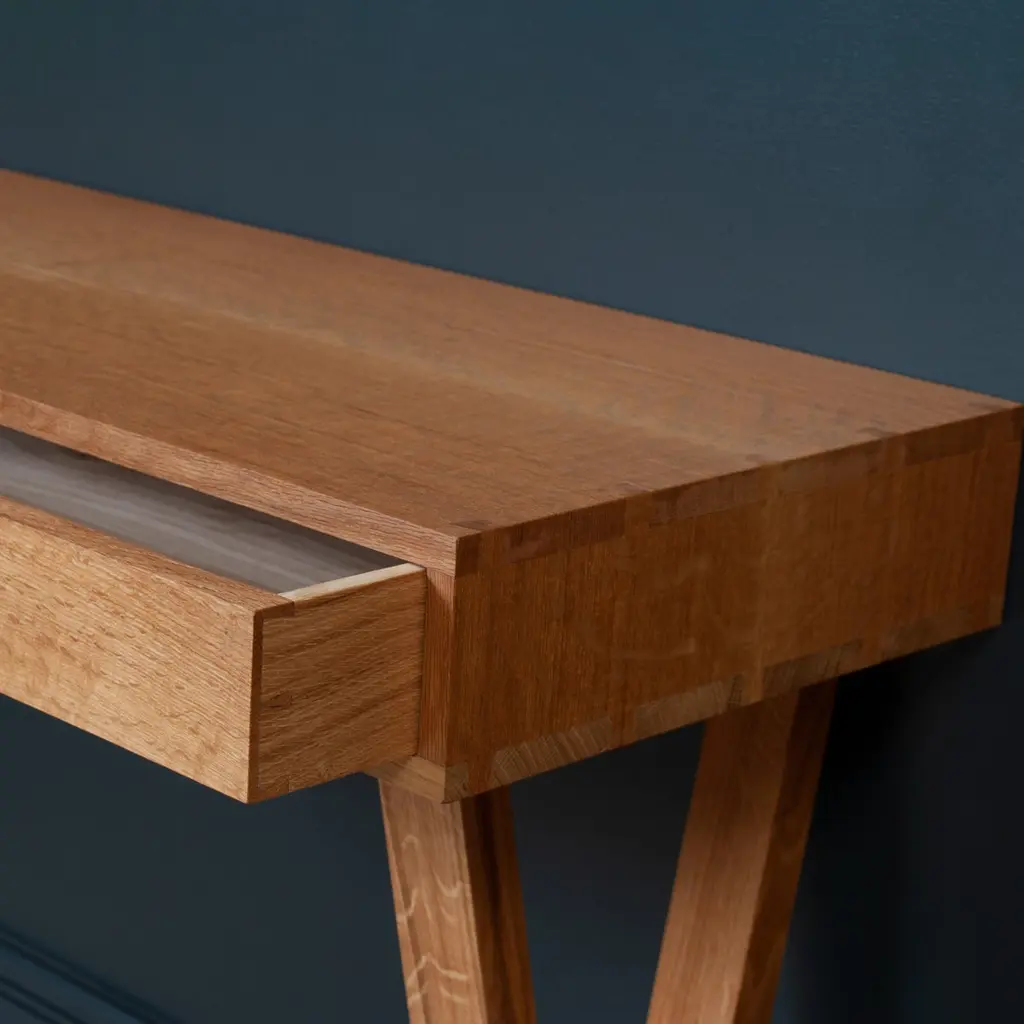 Our larger handcrafted modernist wall mounted oak desk/vanity or console table designed and handmade in England using traditional furniture making techniques. Completely handcrafted from the finest fully quarter sawn English oak. Hand dovetailed joints surround the oak box and inner drawer parts. Oak or leather finger pulls. This desk table is fixed to the wall via unseen screw holes hidden away behind the drawers. A solid and distinctive piece of modernist furniture that is built to last. Hand finished in durable natural oils. Custom dimensions will be quoted upon request.The legs simply unscrew for extra safe transportation and shipping.Black walnut and freestanding versions also available.We design bold and distinctive pieces of furniture – our main objective is combining the design alongside the natural beauty and properties of the raw materials.These timbers and materials are very carefully chosen for each specific design - maintaining our focus on the benefits, visual impact and strengths of what we use. Our regular use of English Quartersawn Oak is one case in point. It has been the beloved timber of fine furniture makers across the world for centuries. It is costly to produce but gives huge benefits and rewards such as its striking medullary rays and superb stability qualities. By utilising these wonderful and naturally occurring features with our contemporary designs we aim to continue creating some very distinct, tactile and idiosyncratic pieces.These are all completely handmade, in very small numbers, by our skilled craftspeople in England.
