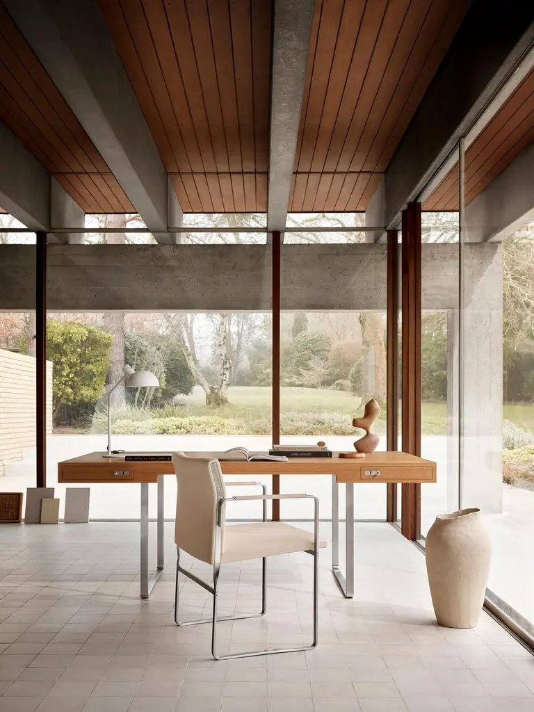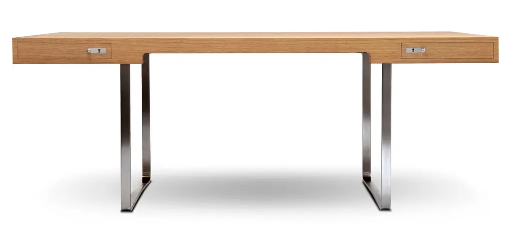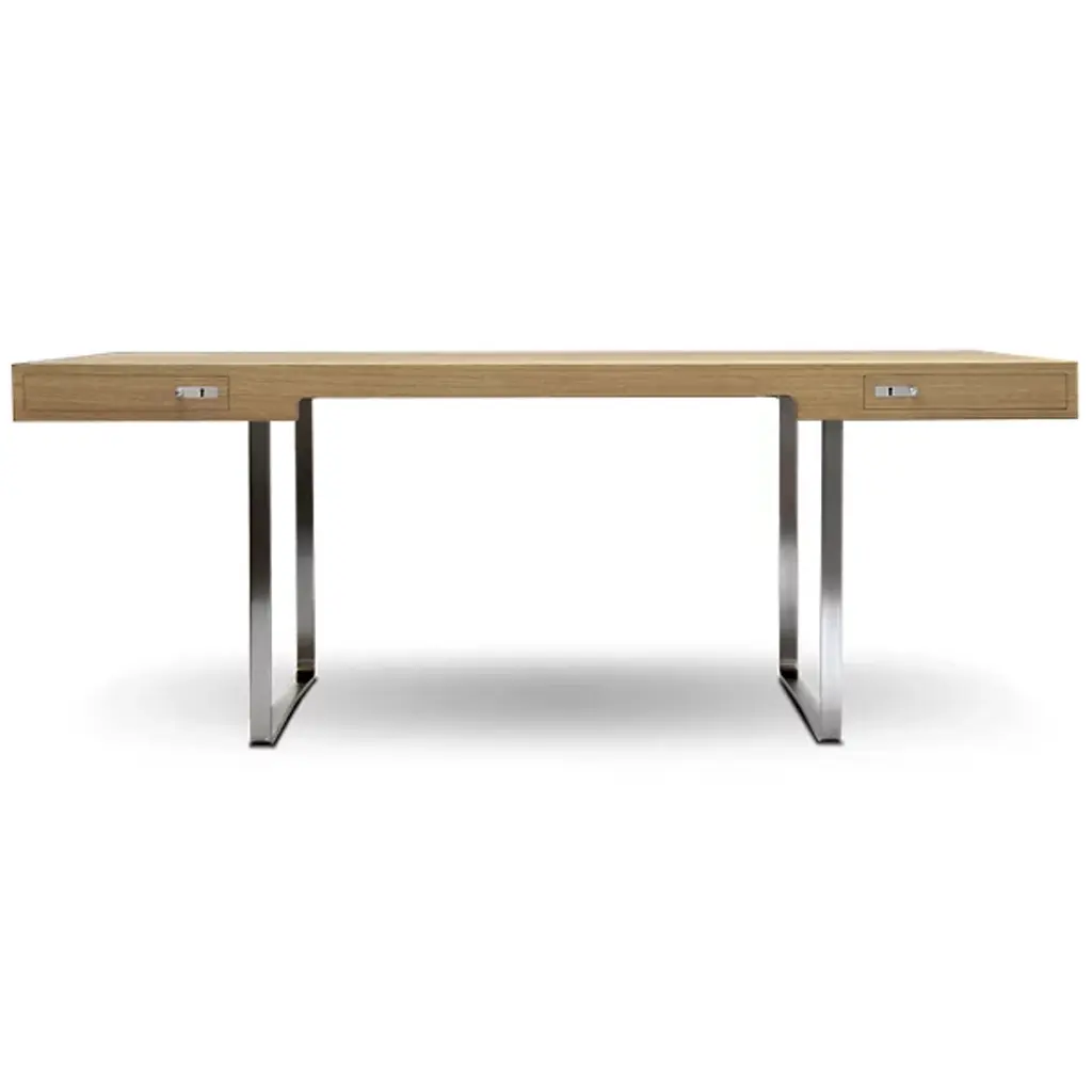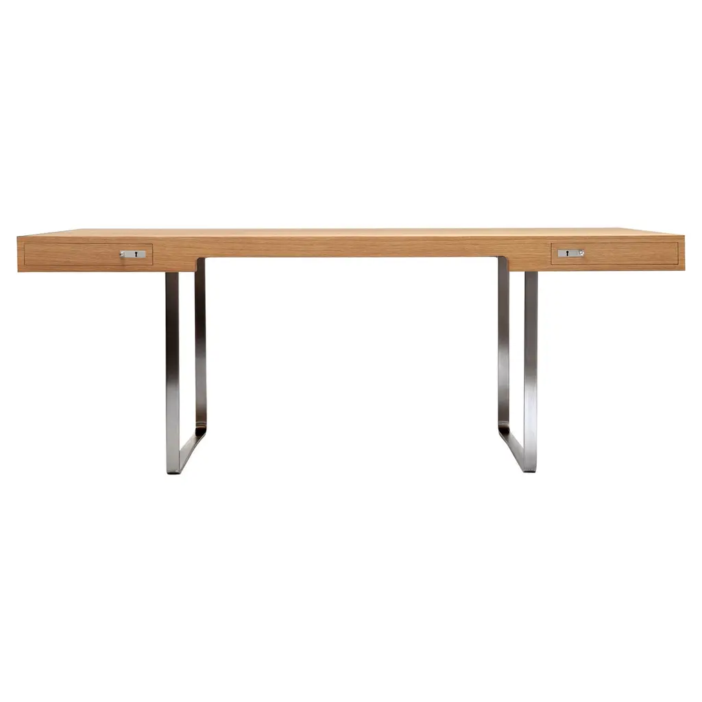 Hans J Wegner 'CH110' Desk in Walnut Oil for Carl Hansen & SonThe story of Danish Modern begins in 1908 when Carl Hansen opened his first workshop. His firm commitment to beauty, comfort, refinement, and craftsmanship is evident in iconic pieces designed by such legends as Hans J. Wegner, Arne Jacobsen, Kaare Klint, Poul Kjærholm, Vilhelm Lauritzen and others. Now in its third generation as a family run business, Carl Hansen & Son maintains its legacy through skillful work with the highest quality materials, sustainably producing Danish design classics by past icons and influential new designers.Hans J. Wegner’s 'CH110' desk stands out in many ways from his usual style of solid-wood furniture. Originally created in 1970, it was part of an exclusive office concept. The series features some of Wegner’s most distinctive steel-framed furniture. This re-edition is executed in choice of walnut or oak with stainless steel legs and accents. Price is per item. Available to order in unlimited quantities in choice of walnut or oak veneer. Oil, white oil, and lacquer finishes also available. Prices vary. Please inquire for more information. This listing is for the 'CH110' desk in walnut oil.In stock lead time 7-8 weeks. Out of stock lead times can add an additional 8-10 weeks or more. Please note that lead times, cost and inventory availability are subject to change without notice and dependent on choice of finish and material ordered. For time sensitive orders, please contact us for current lead times prior to purchasing.Please note that due to the organic nature of the wood, slight variations in color or grain can occur and will vary from piece to piece.Made to order. All sales are final.