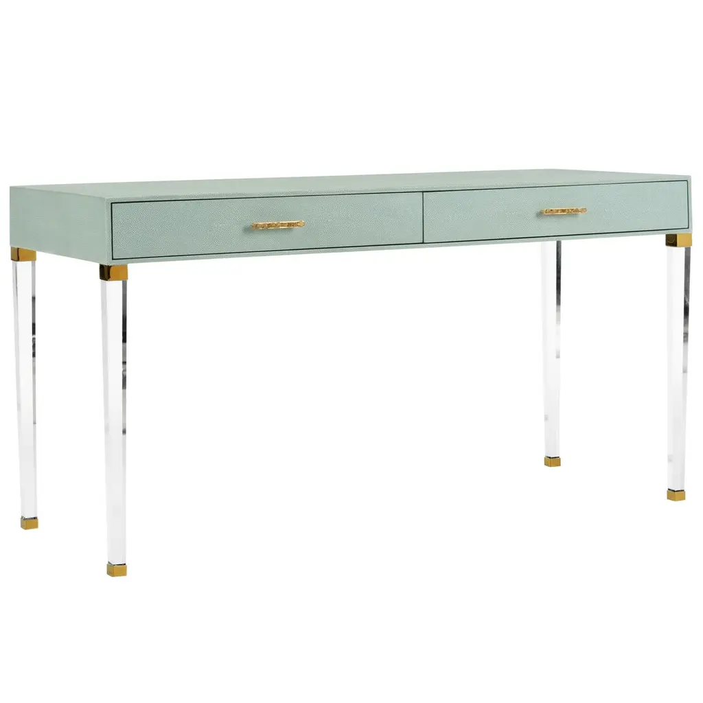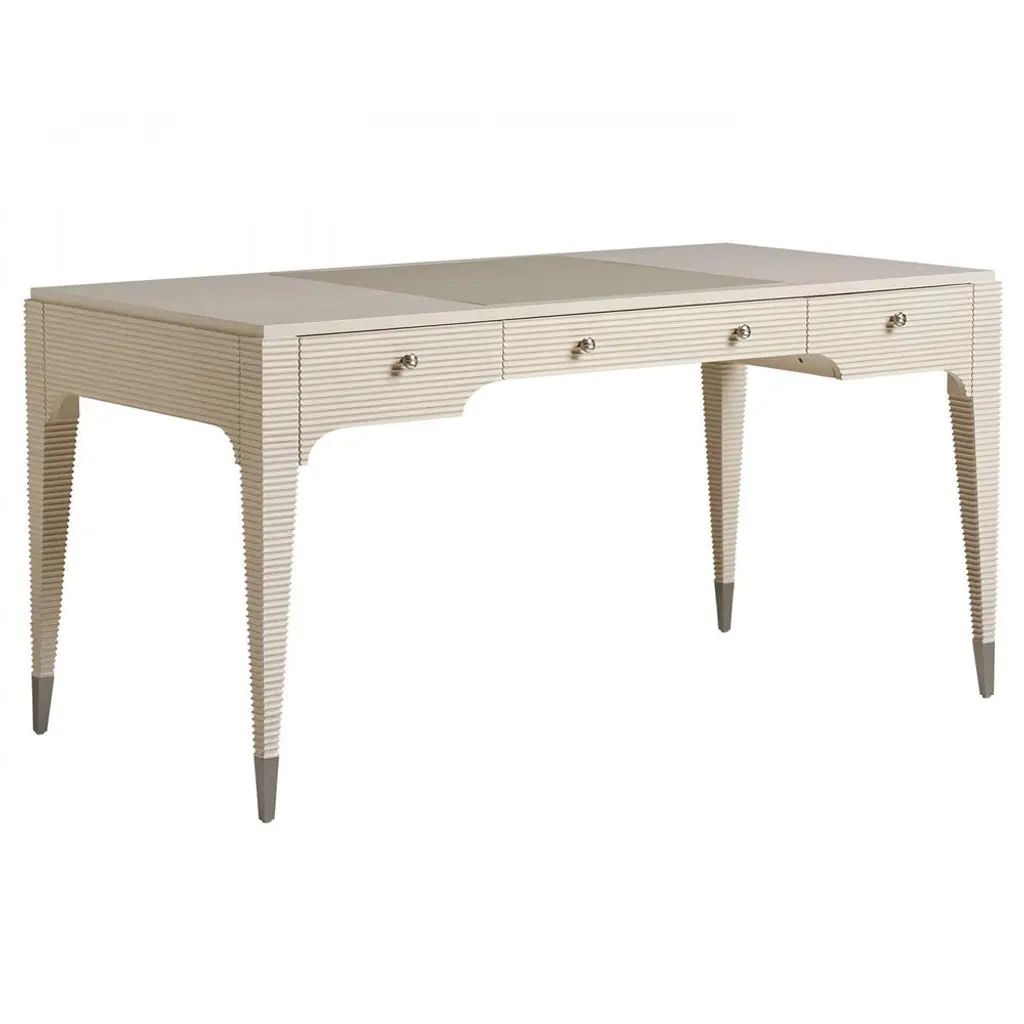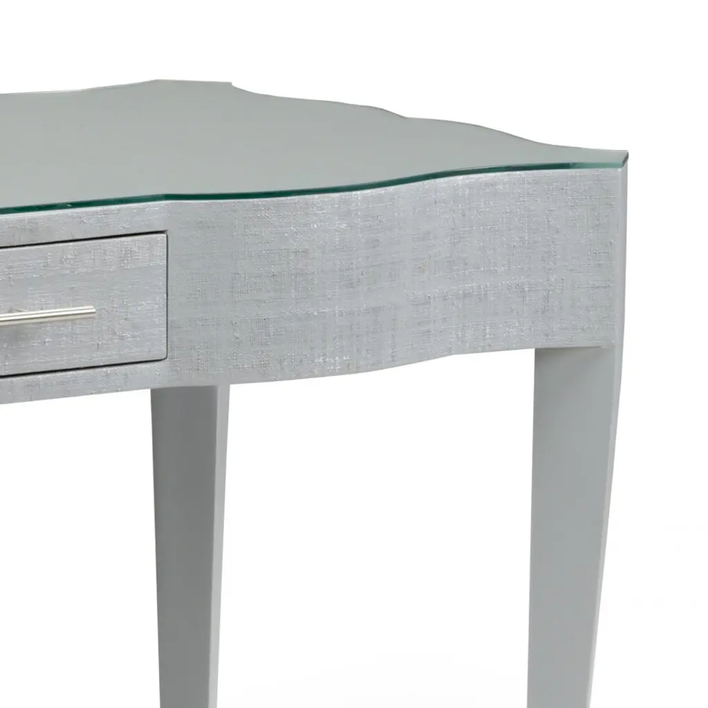 Transitional Writing Desk Sheathed In Gray Painted Raffia With One Storage Drawer And Protective Glass Top.
