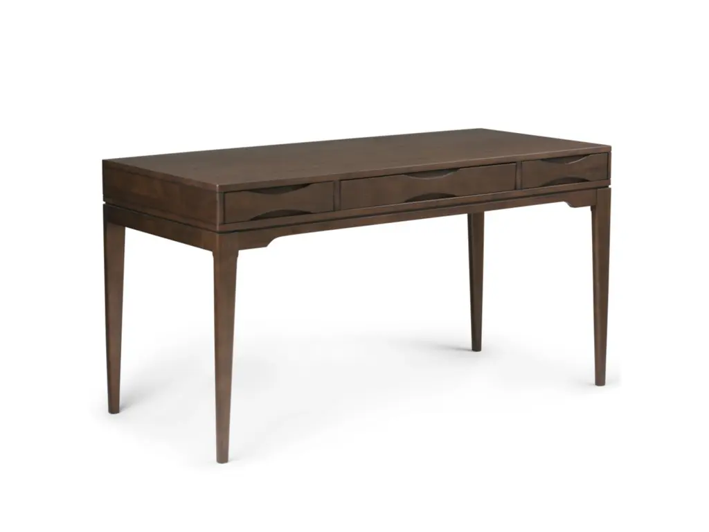 Take a tray chic approach to working from home with this clean-lined and contemporary walnut-tone wood desk with pull-out keyboard tray. Along with plenty of surface space, this high-style desk makes itself useful with a pair of drawers for essential office supplies. Decorative notched drawer fronts infuse cut-above flair.